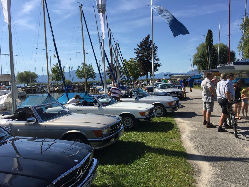 Über 60 Cabrios und Coupès der Mercedes Baureihe 107 aus den 70iger und 80iger Jahren waren mit ihren schönen Karosserien ein Blickfang für die Segler, Gäste und Clubfreunde und füllten den Hafenbereich bis zum letzten Platz aus. Besonders die damals üblichen kräftigen Farben in Rot, Grün und Gelb sieht man heute selten.