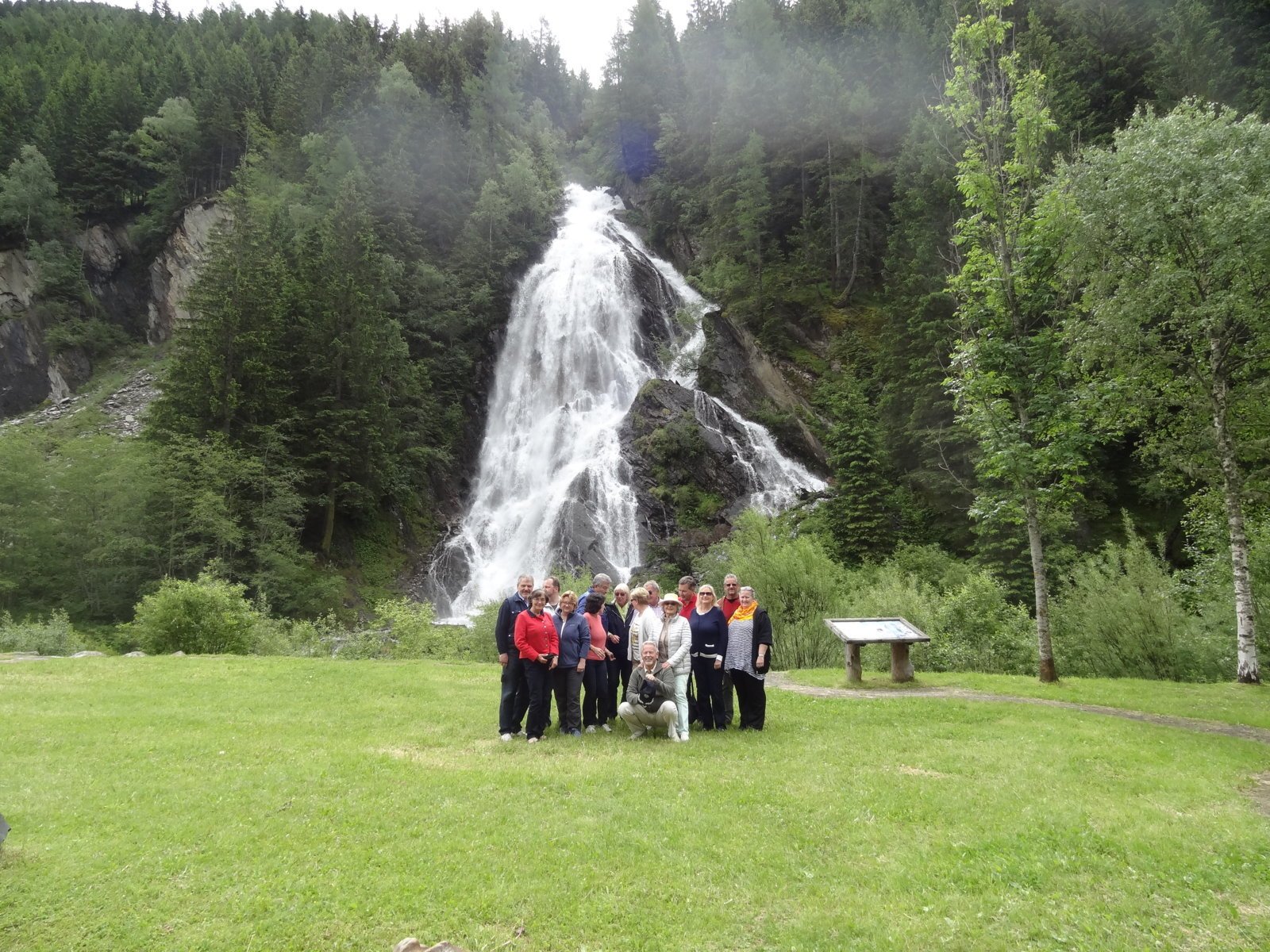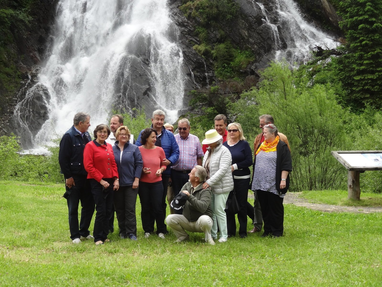 Eine Großglocknerrundfahrt konnten wir wegen Schnee und Nebel am Großglockner nicht machen, so entschieden wir zurück nach München zu fahren mit einem Stopp in Kitzbühel.Vorher machten wir noch vor dem Kalser Wasserfall unser obligatorisches Gruppenfoto. Auf Empfehlung von Eric kehrten wir in Kitzbühel in Rosis „Sonnenbergstuben“ für ein Mittagessen ein. (https://www.sonnbergstuben.at/). Rosi Schipflinger ist die singende Wirtin von Kitzbühel. Das Restaurant ist im Alpenstiel eingerichtet und das Essen war sehr gut. Zu Ehren von Eric spielte Rosi für uns drei Lieder.