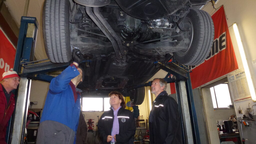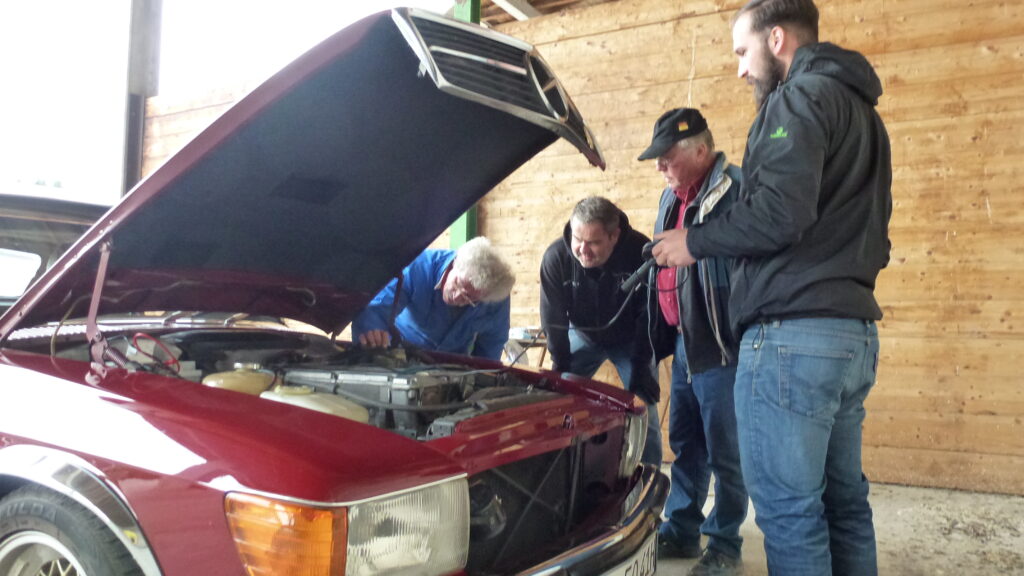 Unser Technikteam Wolfgang , Simon und Alfons nahm aus den eigenen Reihen (der Club lebt von der Basis her) als hoch motivierten „Lehrling“ meinen Stellvertreter Markus auf. So war es uns möglich 2 Teams zu bilden, von denen das eine die Fahrzeuge auf der Hebebühne im halbstündigen Rhythmus untersuchte und das andere anschließend den Motor-, Innen- und Kofferraum unter die Lupe nahm. Als dritte Station konnte dann noch bei Patrick vorbei geschaut werden, der professionelle Fahrzeugpflege vorführte und Tipps dazu gab.