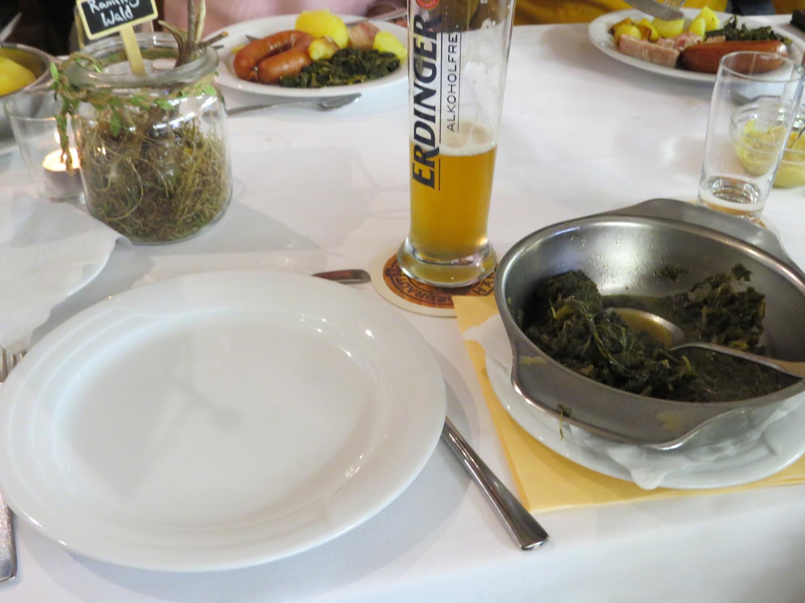 Die Hochzeitssuppe mit Markklößchen, Spargel und Eierstich ließ es uns erst einmal warm ums Herz werden, und dann bog sich der Tisch unter Grünkohl mit Bregenwurst, Kassler, Salzkartoffeln, Bratkartoffeln und Senf.