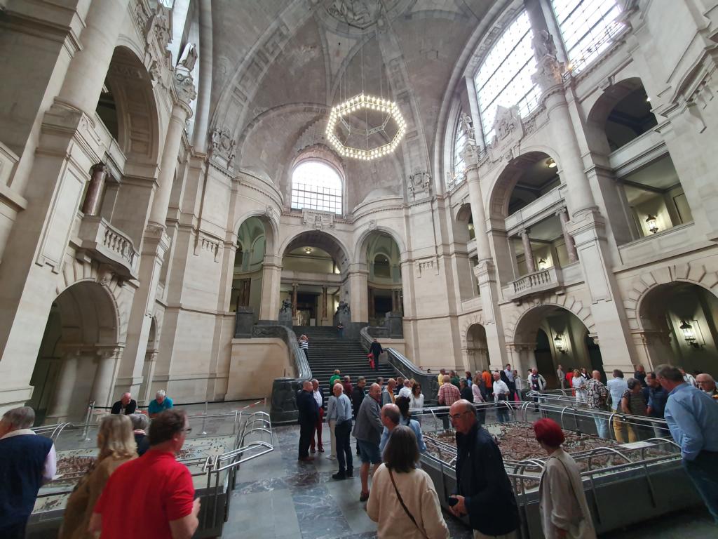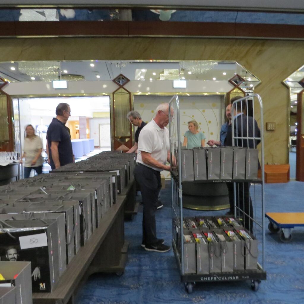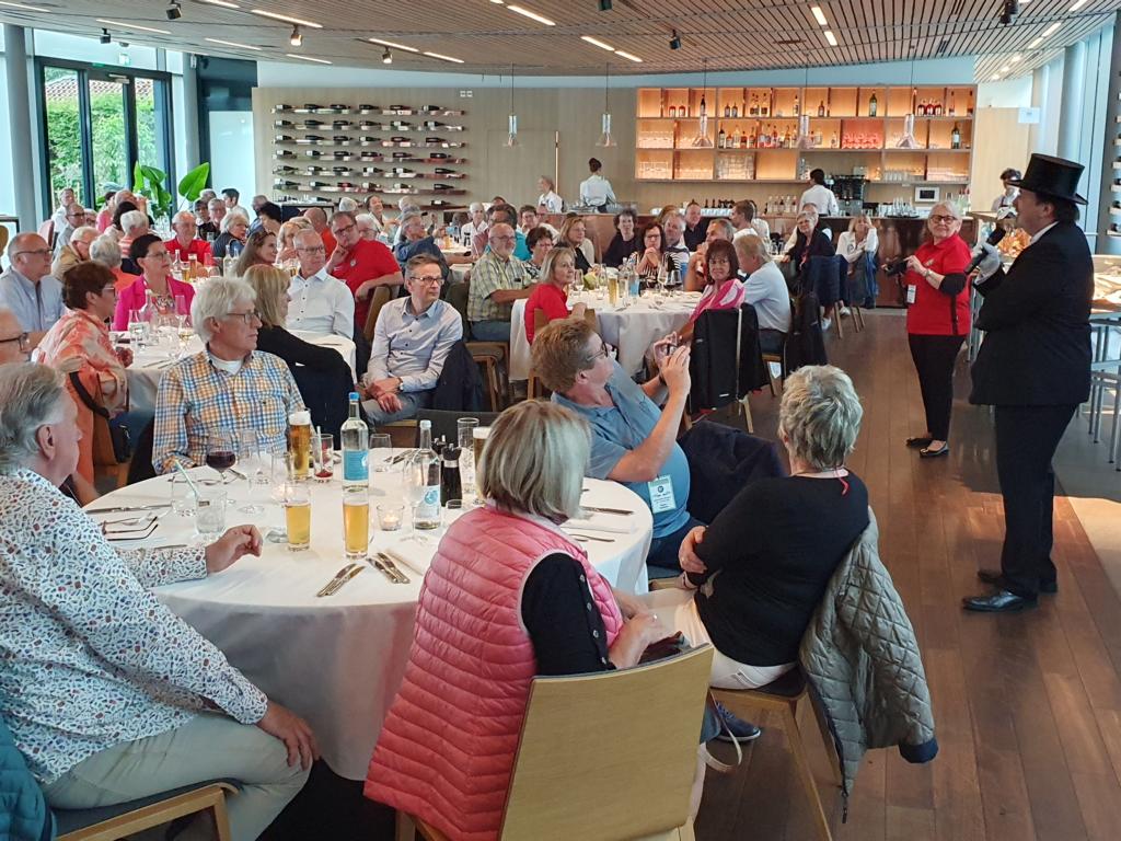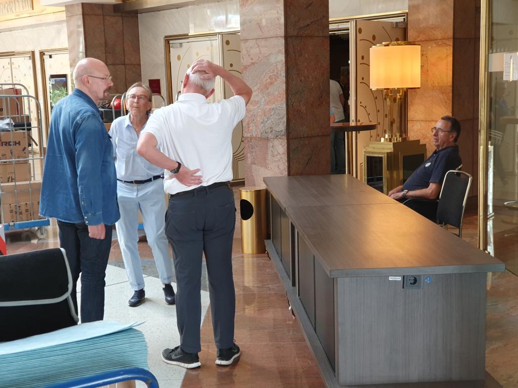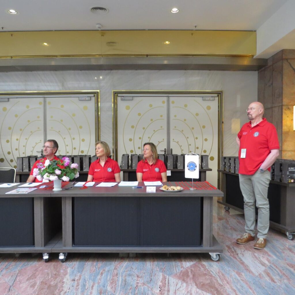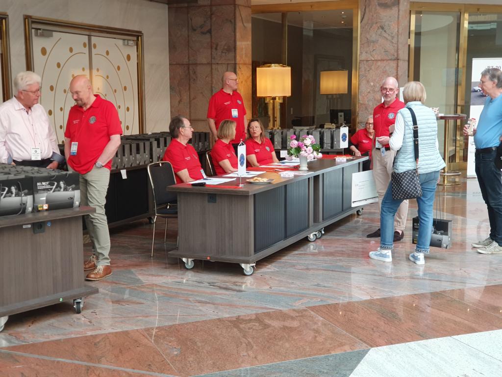 Nun konnte der Freitag mit der Anreise der Gäste kommen. Die Einweisung ins Parkhaus übernahmen Uwe und Klaus gemeinsam mit dem Hoteldirektor. Ab 8 Uhr war unser Counter besetzt. In rotem Poloshirt war das Orga-Team gut zu erkennen. Ingrid, Beate, Claudia und Roland begrüßten die Gäste und strichen die Listen ab, Wolfgang, Christoph, Ullrich und Frank reichten die jeweilige Tüte an. Weiter ging es bei mir mit der Auswahl der Platzierung und dem Verkauf der Lose für die Tombola. Die Abwicklung erfolgte sehr entspannt, ohne Gedränge und ohne Zwischenfälle, bis es Zeit war für die Stadtrundfahrt in fünf Bussen.