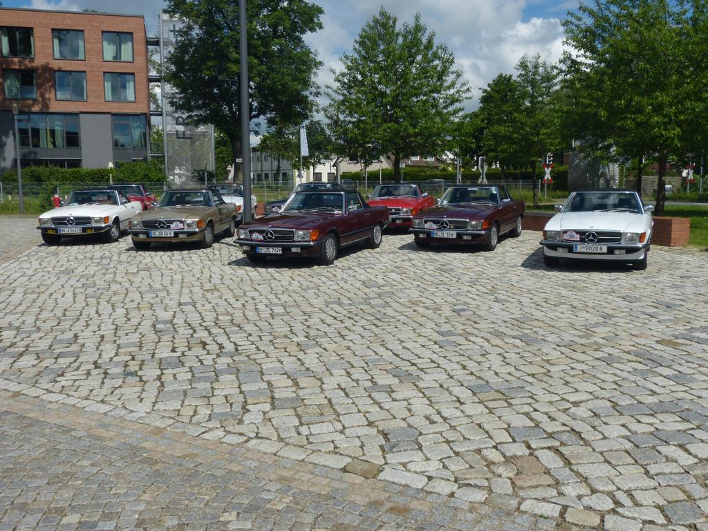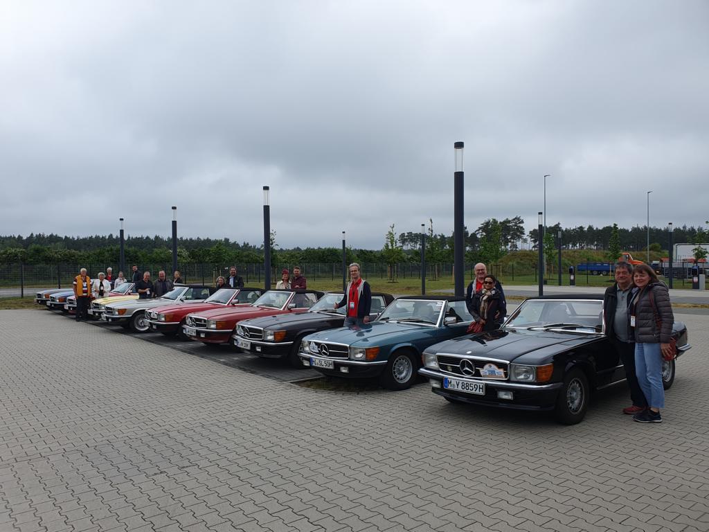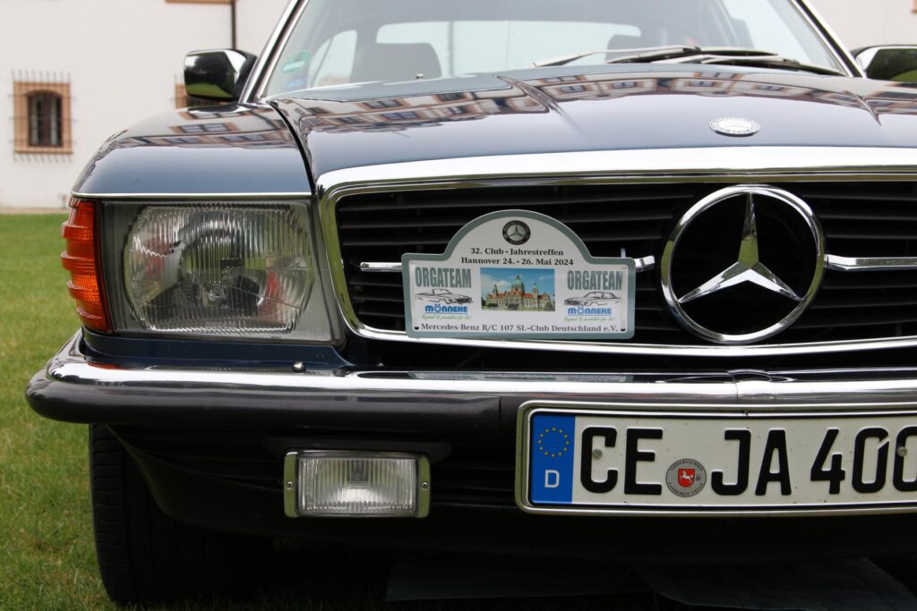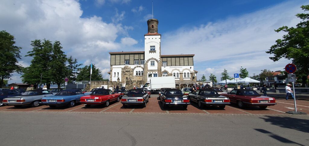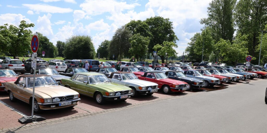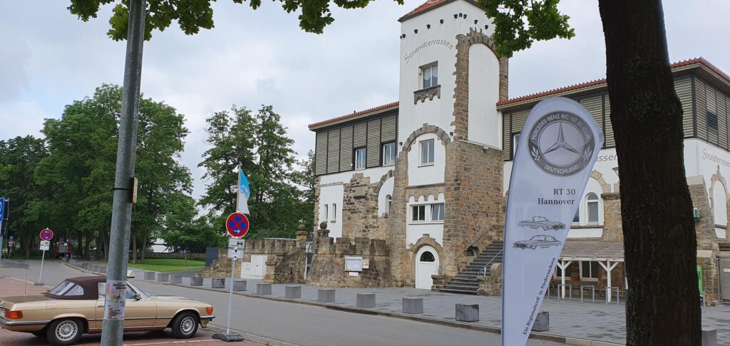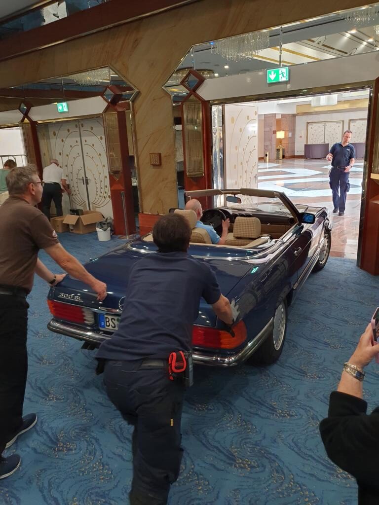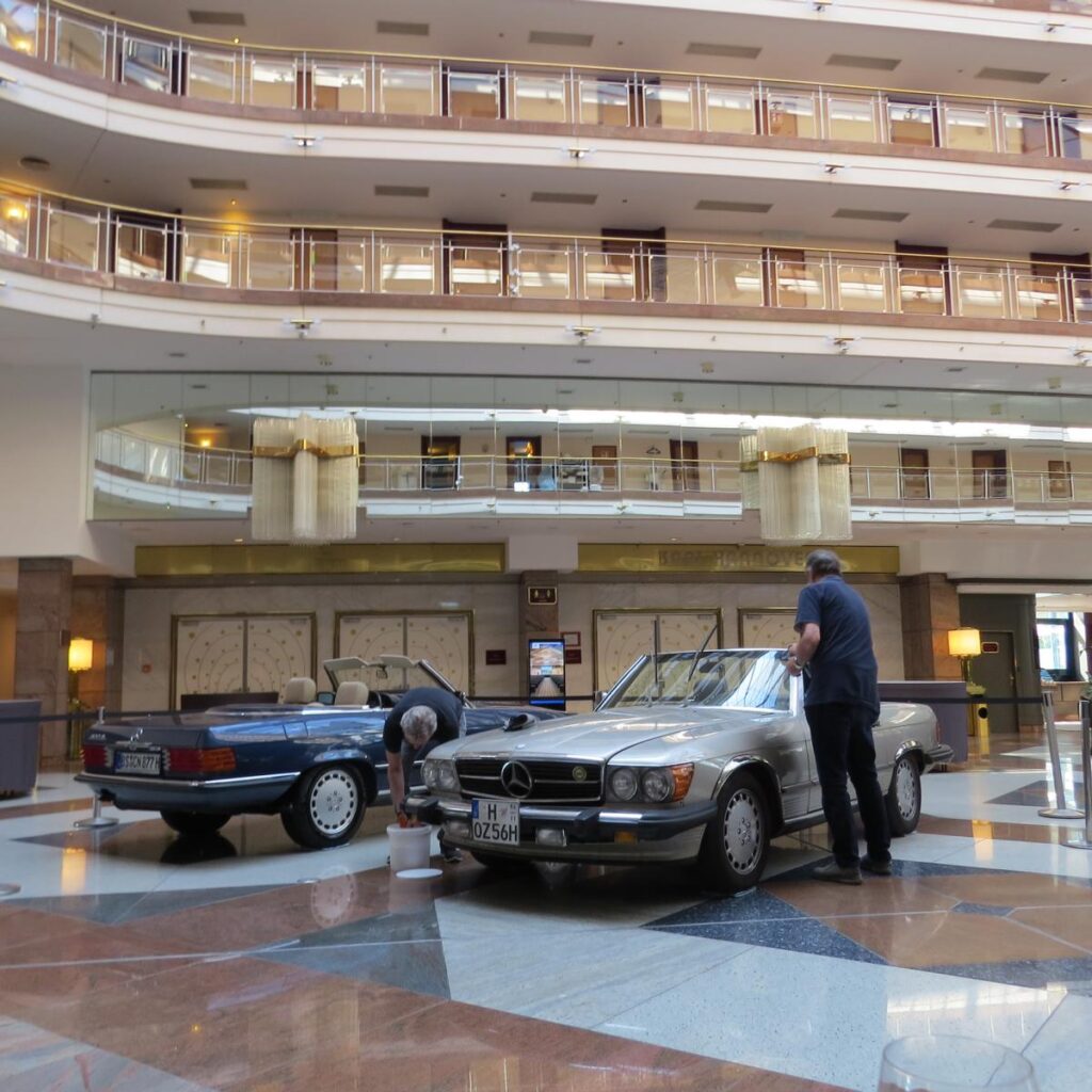 Am Donnerstag fanden dann die Vorbereitungen im Maritim Hotel am Flughafen statt. Tresen aufbauen, Tüten nach Nummern sortieren, Sitzplan mit Listen aufhängen, Hannover-Taler auf den bereits gedeckten Tischen verteilen und, für mich das Highlight, zwei SLs auf der Bühne und zwei weitere Schätzchen im Foyer platzieren, die noch von Rainer und Klaus auf Hochglanz geputzt worden waren. Fehlende Lanyards wurden von Beate und Ullrich in spontaner Heimarbeit durch rote Schnüre ersetzt. Danke für diesen Einsatz!