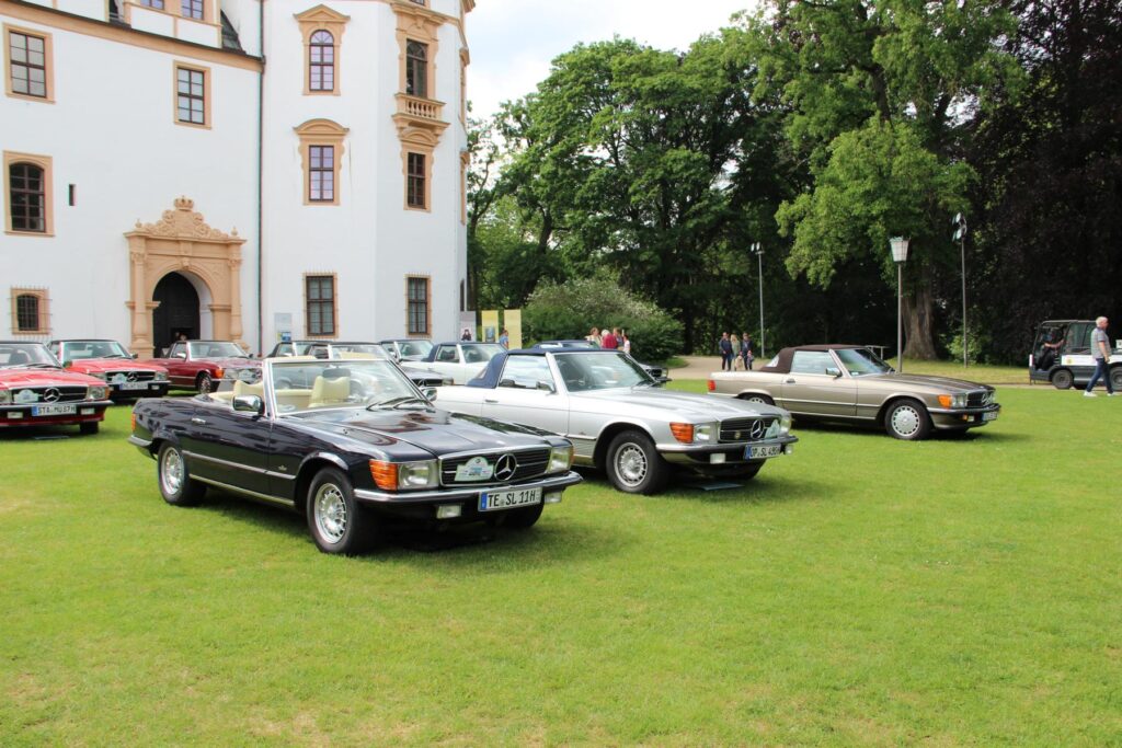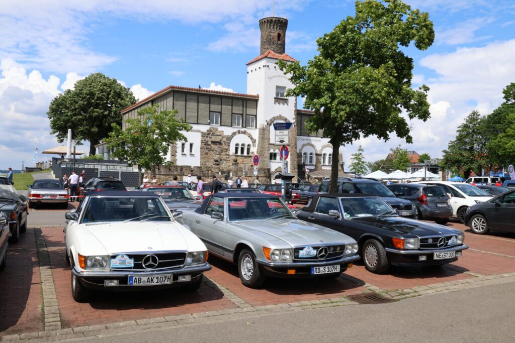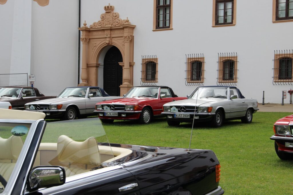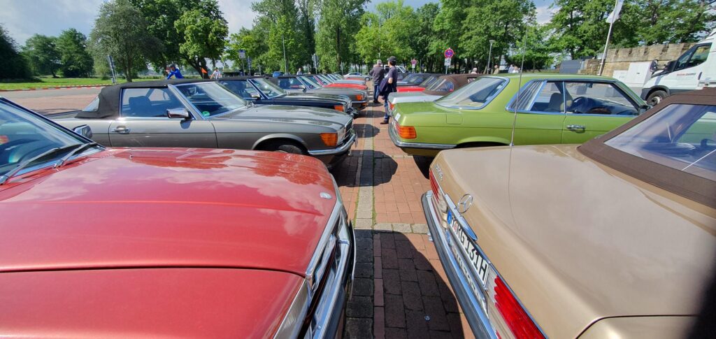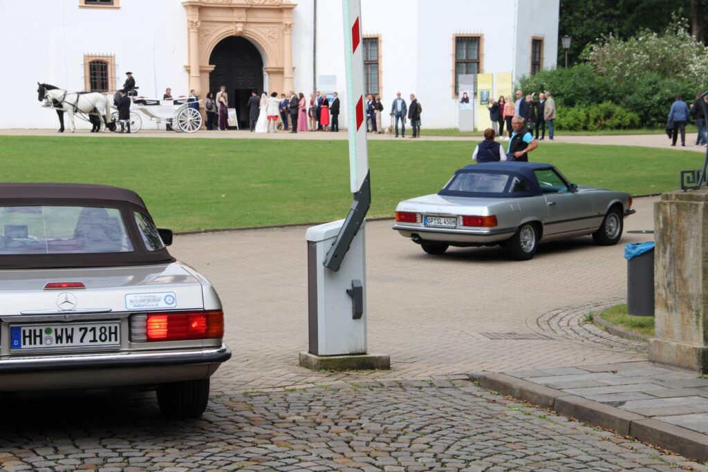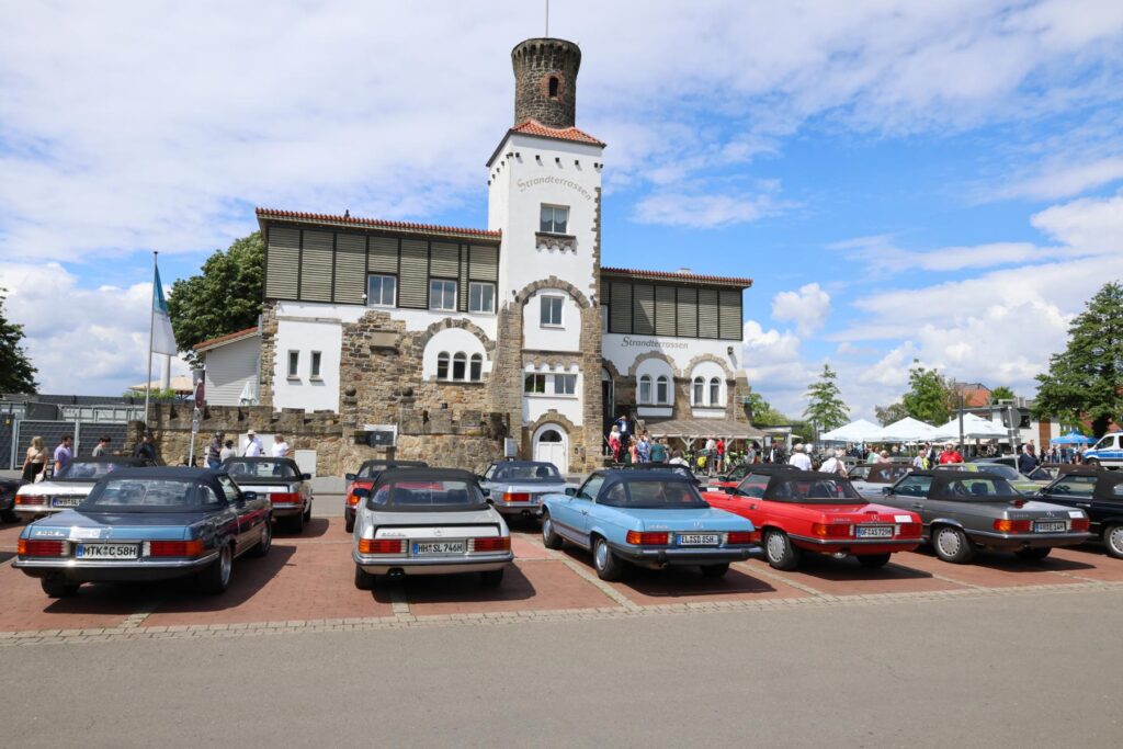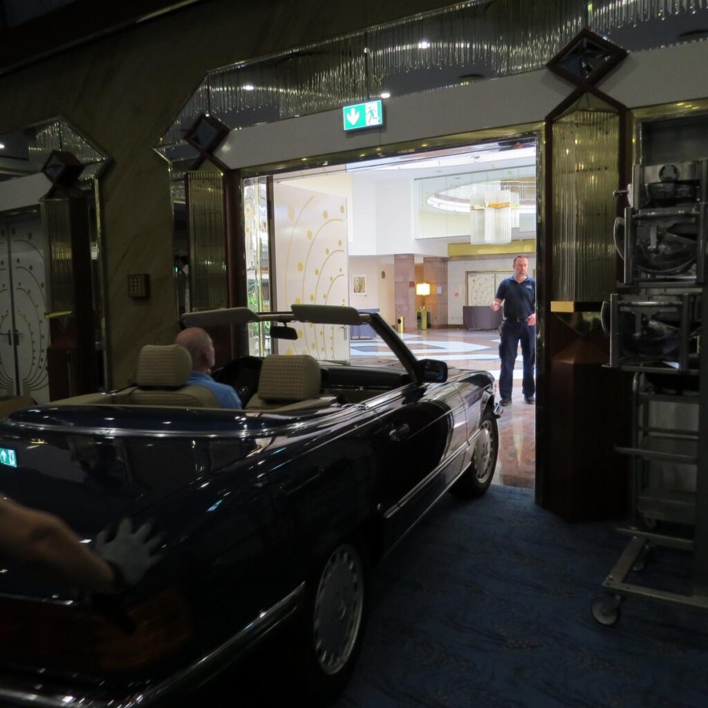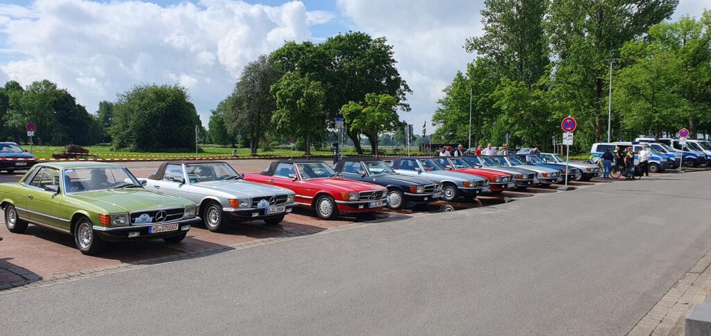Am Donnerstag fanden dann die Vorbereitungen im Maritim Hotel am Flughafen statt. Tresen aufbauen, Tüten nach Nummern sortieren, Sitzplan mit Listen aufhängen, Hannover-Taler auf den bereits gedeckten Tischen verteilen und, für mich das Highlight, zwei SLs auf der Bühne und zwei weitere Schätzchen im Foyer platzieren, die noch von Rainer und Klaus auf Hochglanz geputzt worden waren. Fehlende Lanyards wurden von Beate und Ullrich in spontaner Heimarbeit durch rote Schnüre ersetzt. Danke für diesen Einsatz!