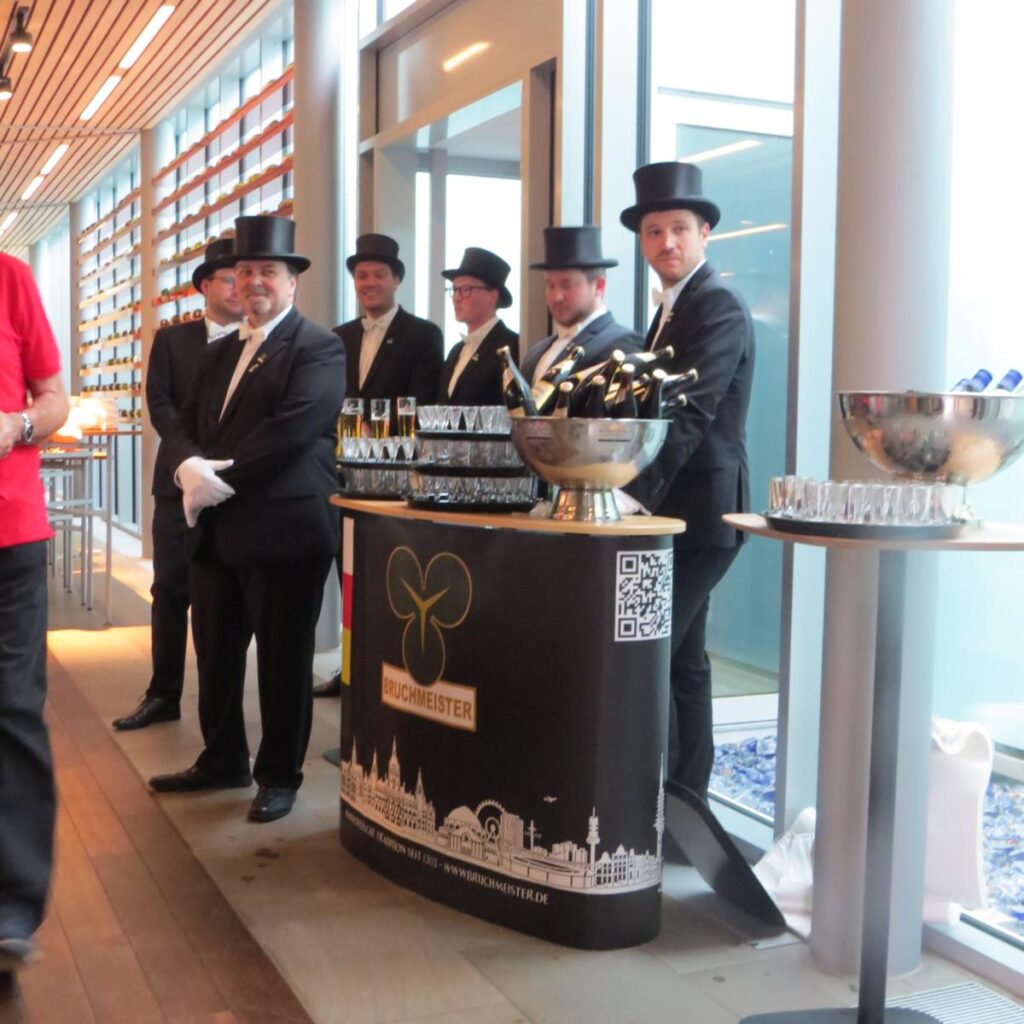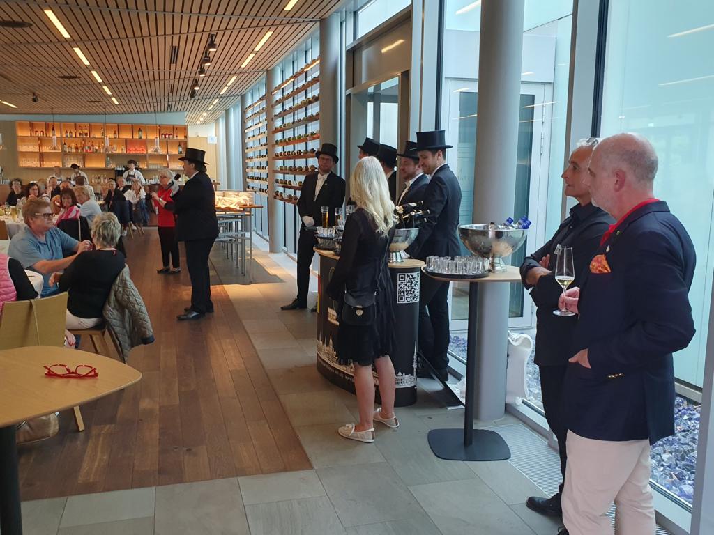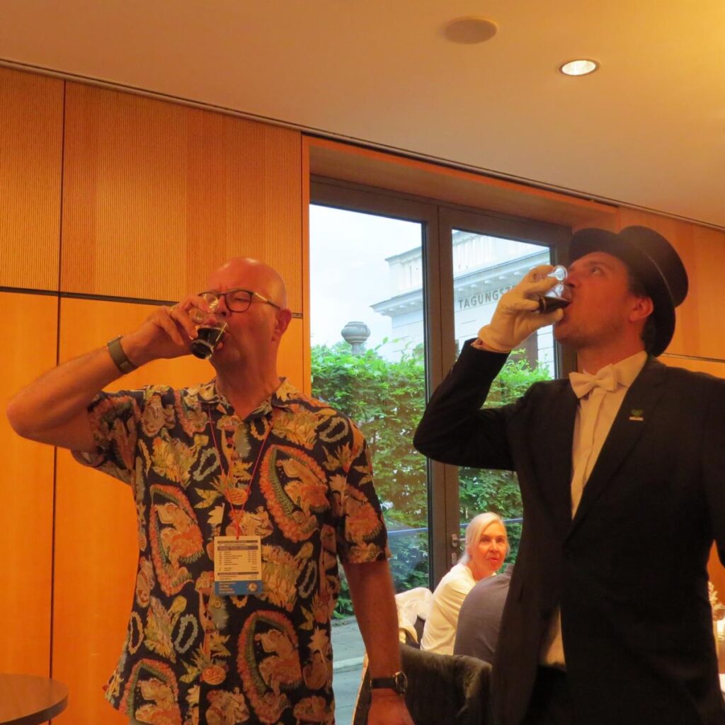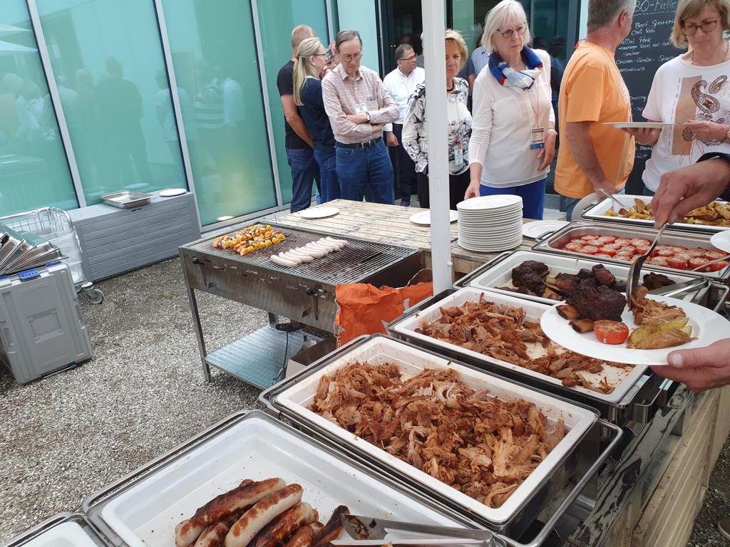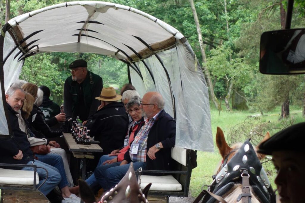 Dort empfing man uns bei einem leckeren Aperitif mit den Bruchmeistern und dem Karikaturisten Lothar Krebs. Alle fanden in den Innenräumen bequem Platz. Lars begrüßte unsere Gäste und stellte den Zeichner vor, der den ganzen Abend zur Verfügung stand, um für jeden, der wollte, individuelle Karikaturen anzufertigen. Der Erlös ging vollständig an die Kinderkrebshilfe. Der Andrang war sehr groß. Lothar Krebs war den ganzen Abend ausgebucht. Die Bruchmeister erklärten ihre Tradition und brachten uns während des Abends das Trinken der „Lüttjen Lage“ bei. Hierbei handelt es sich um ein spezielles Dunkelbier in einem kleinen Stamper sowie um einen Korn, der in das Bier laufen muss. Das sorgte für einigen Spaß, denn das Trinken mit zwei Gläsern in einer Hand bedurfte einiger Geschicklichkeit. Unterdessen konnten sowohl das reichhaltige Vorspeisenbuffet in der Schlossküche, als auch die Spezialitäten vom Grill aus regionalem Anbau im Innenhof genossen werden. Das außerordentlich freundliche Personal versorgte uns ohne Unterlass reichlich mit Getränken, denn später brachten uns bereitstehende Busse sicher ins Hotel zurück.