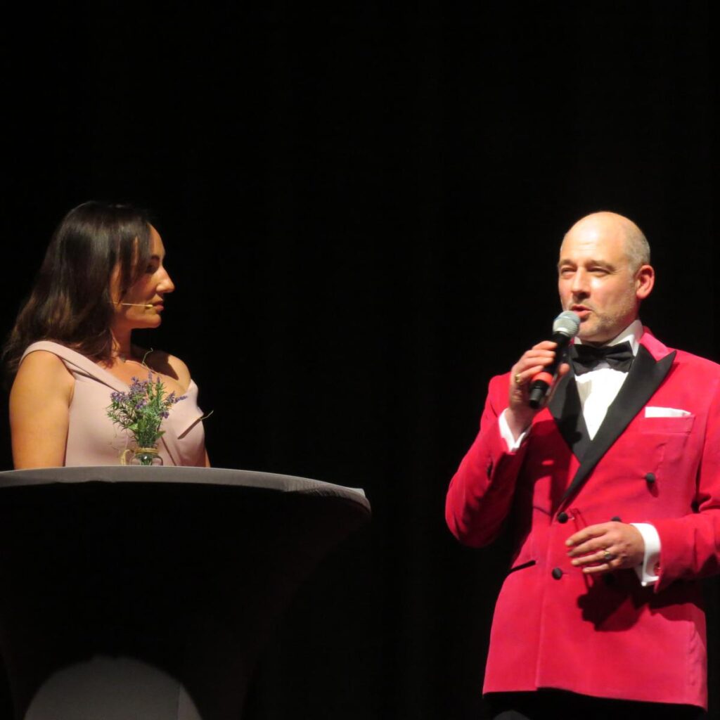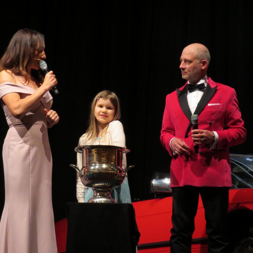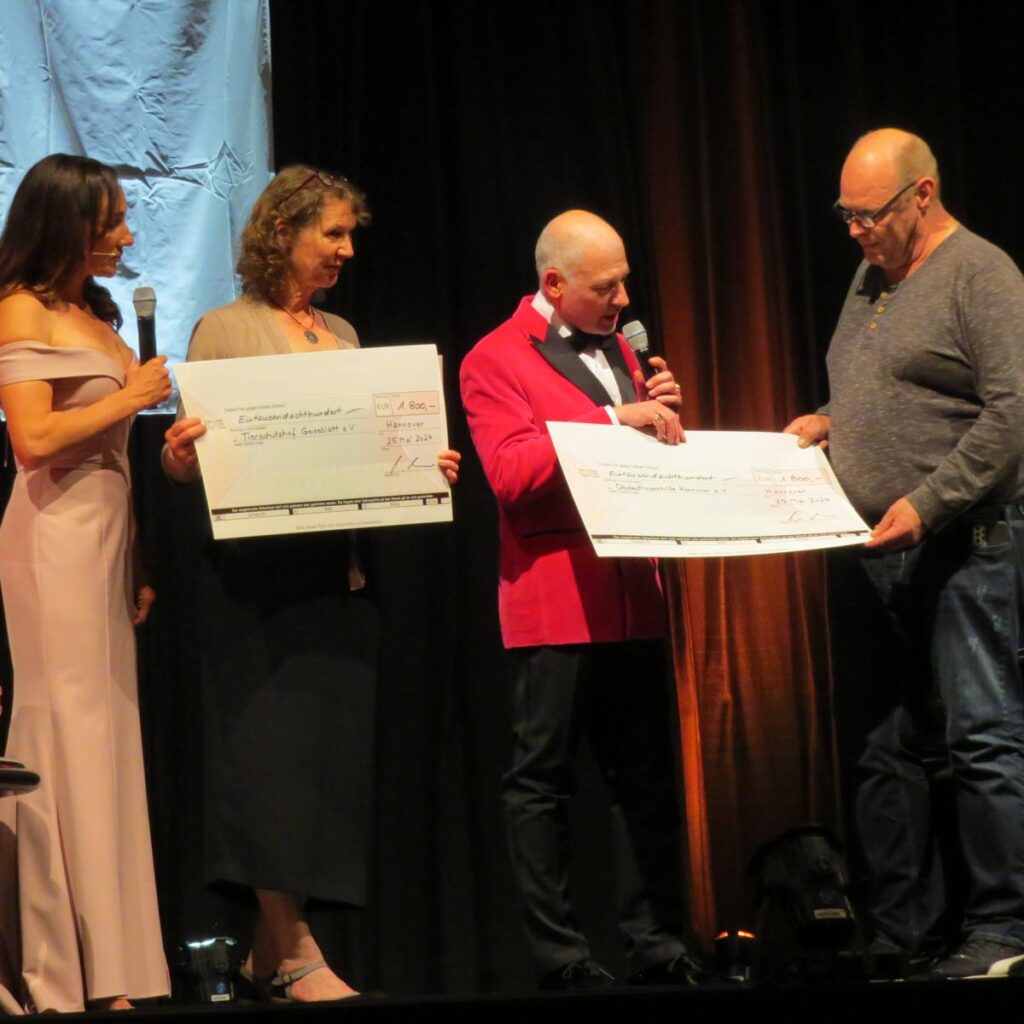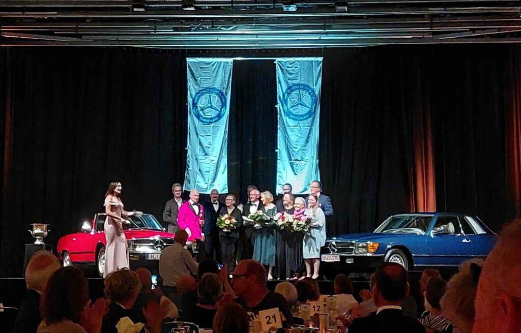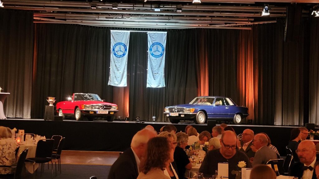 Lars eröffnete den Abend auf der Bühne zwischen zwei blitzeblanken SLs, und dann begann die Schlemmerei. Ein Vier-Gänge-Menü wurde professionell in abgesprochenen Etappen serviert. In lockerer Reihenfolge begrüßten uns der Direktor und die Maritim-Crew, erfolgte die Staffelübergabe mit einem Präsentkorb, gefüllt mit Hannover-Spezialitäten und wurde das Orga-Team geehrt. Noch einmal verkauften wir Lose und konnten dann erfolgreich zwei Schecks über jeweils 1.800 Euro an die Obdachlosenhilfe Hannover und das Tierheim Geissblatthof überreichen. Beide Organisationen waren hocherfreut und voller Dankbarkeit. Einen großen Dank an alle eifrigen Spender! Der Höhepunkt war dann die Ziehung der Tombola-Gewinne. Die Glücksfee war die achtjährige Tochter eines Clubmitglieds. Aus einem imposanten blank geputzten Silberpokal fischte sie die Gewinnnummern, und der total leckere Nachtisch beendete den offiziellen Teil des Abends.