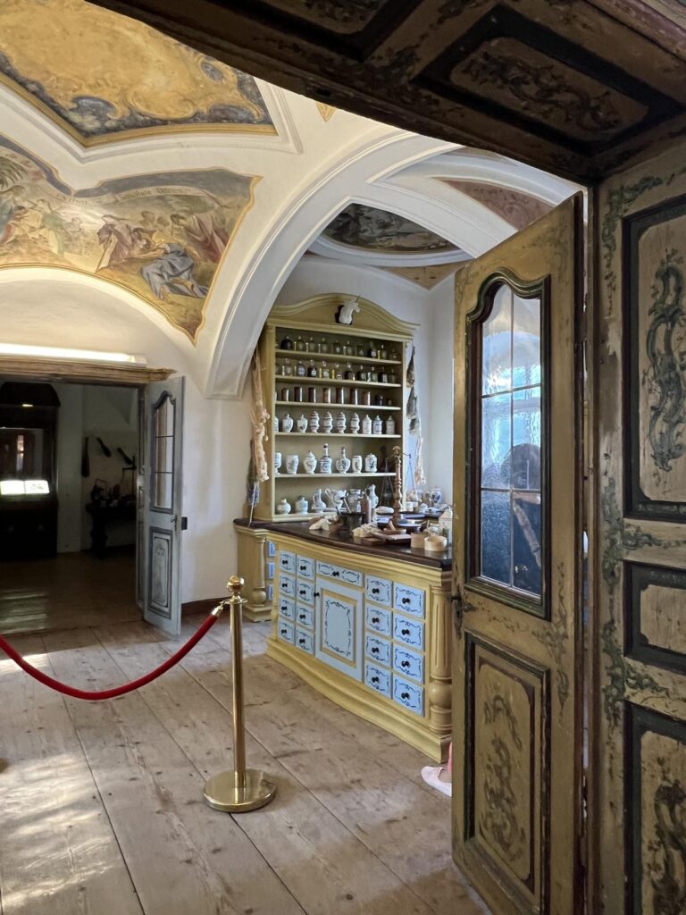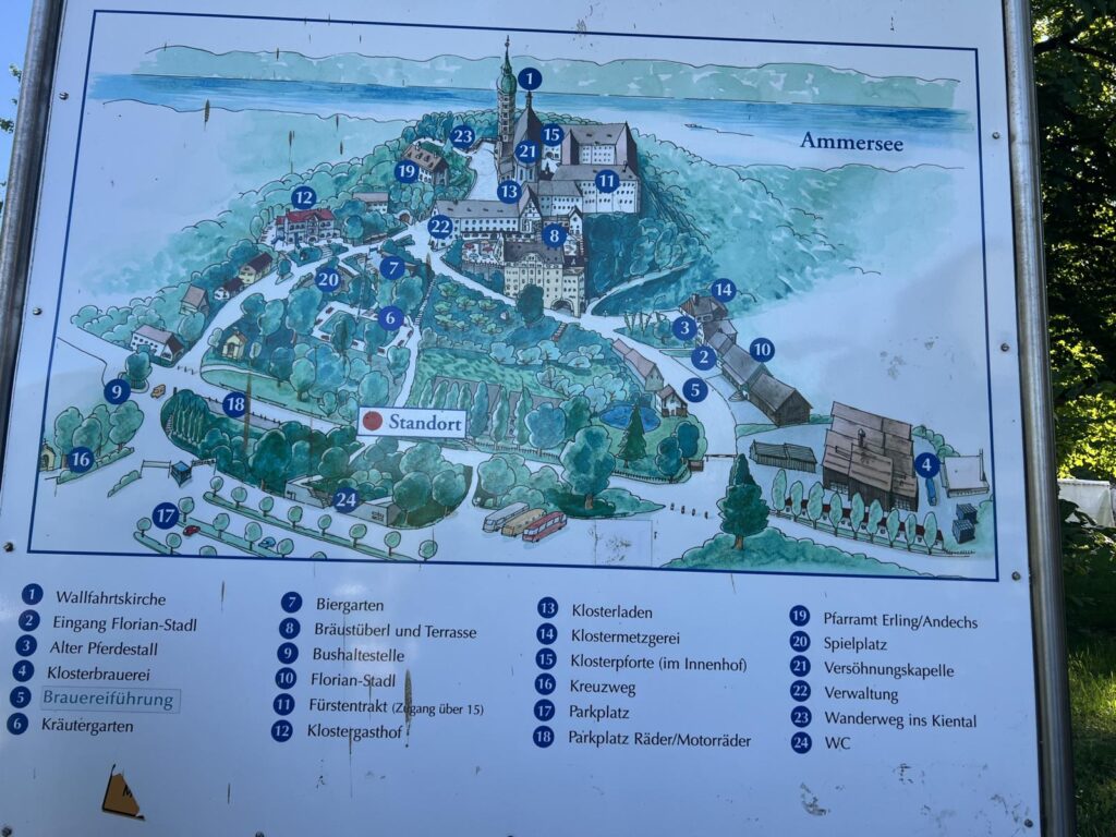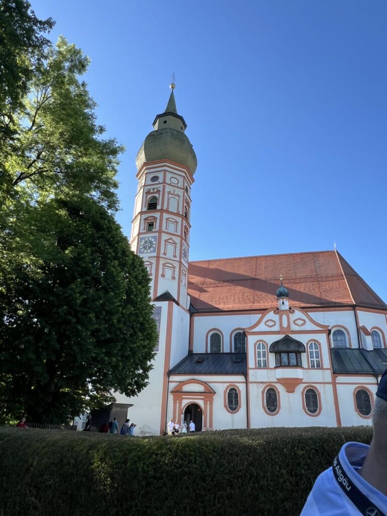 Um 16 Uhr ging es per Raddampfer zur Südtour auf die andere Seite nach Herrsching. Dort brachten uns die Busse auf den Heiligen Berg (die Bezeichnung stammt vom Wittelsbacher Herzog Ernst aus dem 14. Jahrhundert, da Reliquien verwahrt wurden) zum Kloster Andechs, einem Benektinerkloster (gegründet im 15. Jahrhundert) sowie zur Wallfahrtskirche. Sie wird als Rokokojuwel bezeichnet. Auch hier dominieren der Hochaltar, viel Gold, imposante Deckengemälde, Seitenaltäre und Kapellen. Unsere Ankunft ließ uns nicht viel Zeit. Der Klosterladen hatte schon geschlossen, aber dafür gab es eindrucksvolle kurze Blicke in die neu eröffnete Apotheke und aufs Alpenpanorama.
