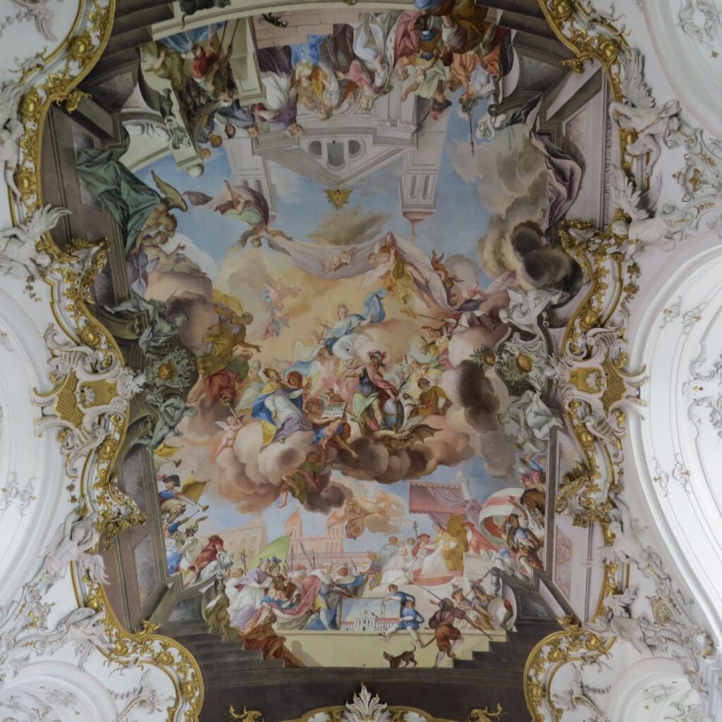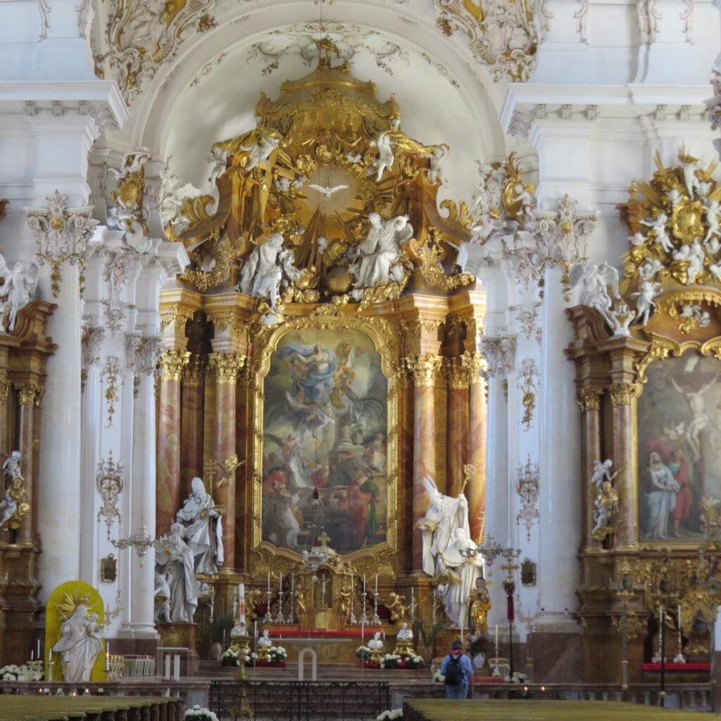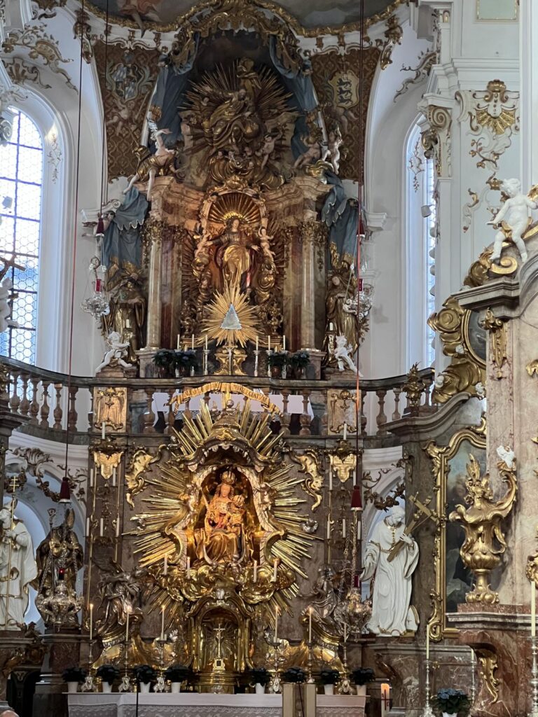 Die Entscheidung für Freitag war ein Ausflug mit Bus und Schiff „Vom Himmelreich auf den heiligen Berg der Bayern“. In Dießen am Ammersee besichtigten wir zuerst das Marienmünster (Baubeginn 1720). Es war die ehemalige Stiftskirche des Augustiner-Chorherrenstiftes am Ammersee, und durch die Zusammenarbeit zeitgenössischer Maler, Stuckateure und Bildhauer gilt es als das bedeutendste spätbarocke Gesamtkunstwerk. Im Mittelpunkt steht der Hochaltar, dessen Altarbild die Aufnahme Marias in den Himmel zeigt. Das Besondere ist, dass dieses Bild in einem Schacht versenkt werden kann, so dass eine Bühne entsteht, die im Laufe des Kirchenjahres unterschiedliche Szenen der Heilsgeschichte präsentieren kann. Die diversen Seitenaltäre stammen von verschiedenen international bekannten Künstlern. Eine Pracht in Gold mit unzähligen Putten, Silberleuchtern, Fresken und einer besonderen Uhr. Sie hat keine Zeiger, sondern das Zifferblatt bewegt sich und zeigt auf diese Weise die Zeit an. Tja, sehr beeindruckend.