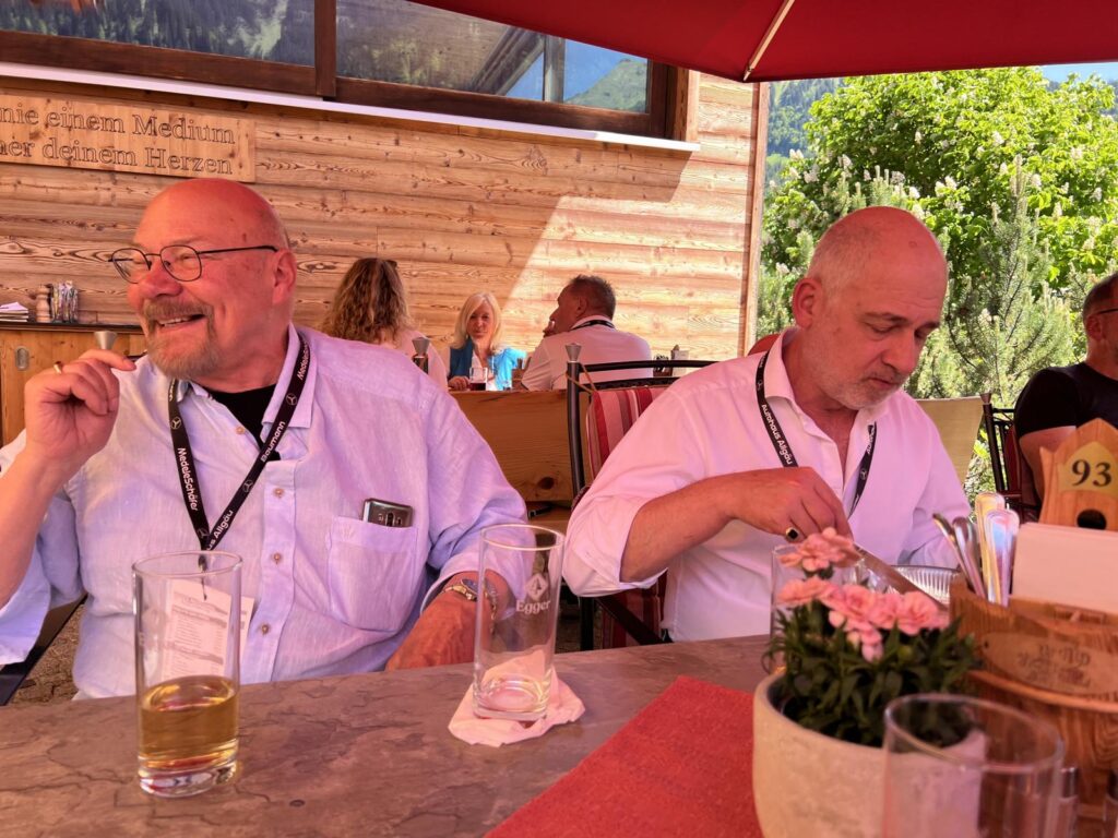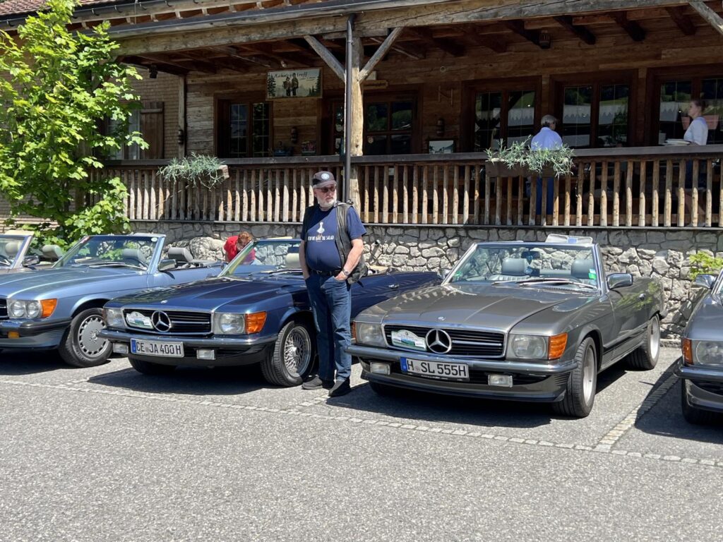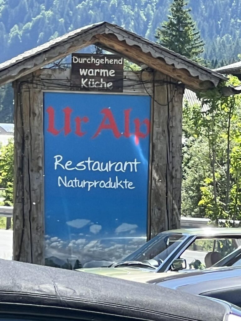 Samstag waren die großen Touren angesagt. Das Roadbook sagte nur Straßennamen an, aber wir sollten mittels QR-Code mit Google Maps navigieren. Ich hatte Stefan als Beifahrer, und wir hatten abgesprochen, dass wir Lars und Wolfgang folgen würden. Unsere angemeldete Fahrt war Nummer S 02 „Allgäu pur“: Oberallgäu, Ostallgäu, Unterallgäu mit Basilika Ottobeuren. Nach kurzer Fahrt Richtung Oberstdorf/Fischen ging es sehr kurvenreich weiter und mit bis zu 16 Prozent Steigung steil aufwärts. Nachdem wir das Schild „Riedbergpass 1.409 m über NN“ passiert hatten, ging es ebenso kurvenreich und steil bergab. Der Riedbergpass ist als höchster befahrbarer Gebirgspass Deutschlands bekannt. Es machte total Freude, und am nächsten Parkplatz stellten wir fest: Der QR-Code war die Ausfahrt „4-Pässe Tour“. Nun ja, für uns kein Problem, das Mittagessen war nicht vorbestellt, und so folgten wir eben diesen Angaben. Es ging über die Grenze nach Österreich und durch das im Bregenzerwald gelegene Örtchen Hittisau. Immer neue Ausblicke auf die Allgäuer Alpen mit ihren Wäldern, grünen Wiesen, sanften Hügeln, weiten Ebenen sowie romantischen Flusstälern erfreuten unsere Augen. Eine Herausforderung waren teilweise die vielen Radfahrer, die aber meinen vollsten Respekt hatten. Wir hatten es bequemer und erreichten nach ungefähr zwei Stunden das Gasthaus Ur-Alp in Au. Ich bestellte einen leckeren Salat.
