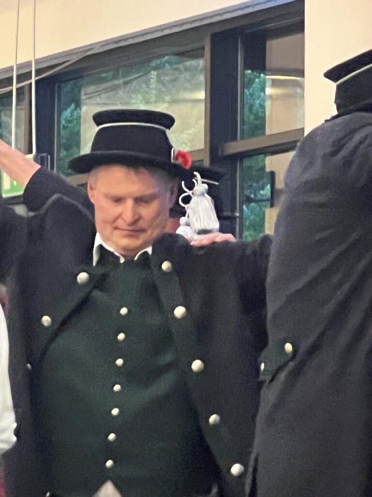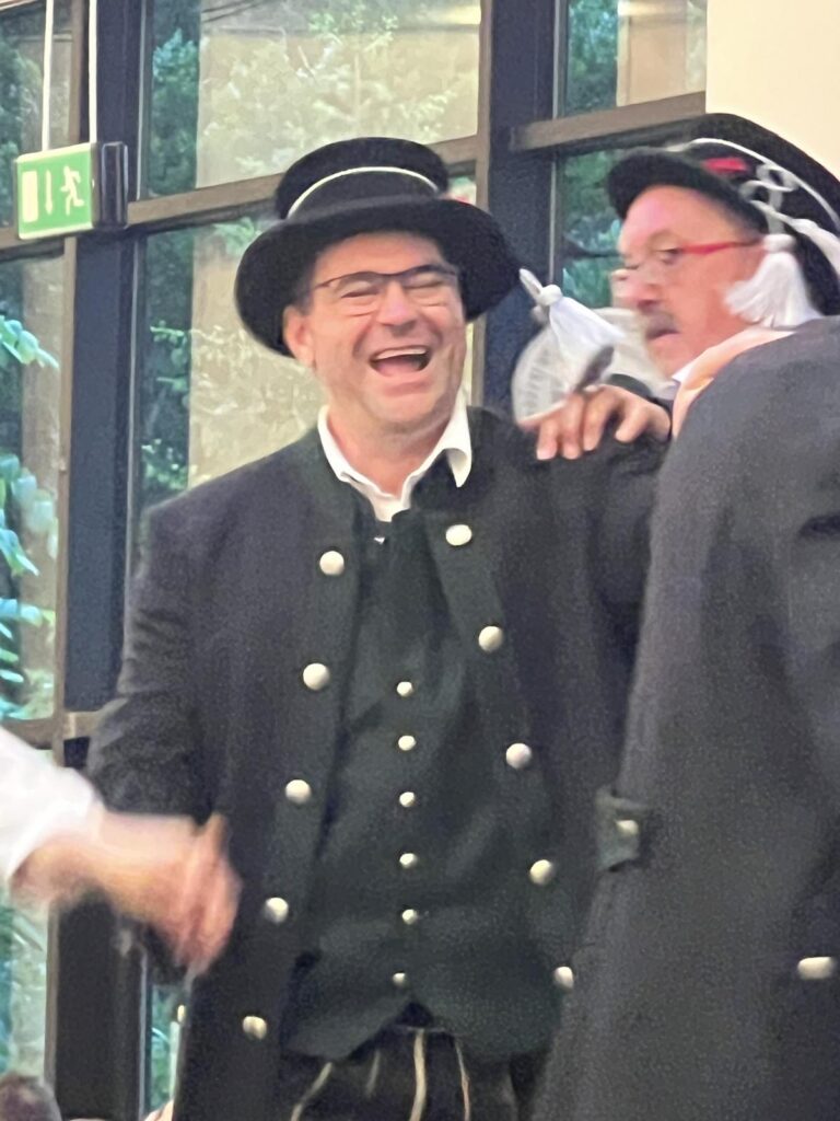 Nun hieß es sich „aufbrezeln“ für den Allgäuer Abend (Trachtenkleidung erlaubt). Ich bestückte einen schwarzen Pulli einfach mit Edelweiß und anderen diversen Ansteckern, das war‘s. Um 18 Uhr startete die Schlacht am Buffet und um 20 Uhr wurden wir zwei Stockwerke tiefer ins Kongresszentrum beordert, wo ein buntes Programm angekündigt worden war.