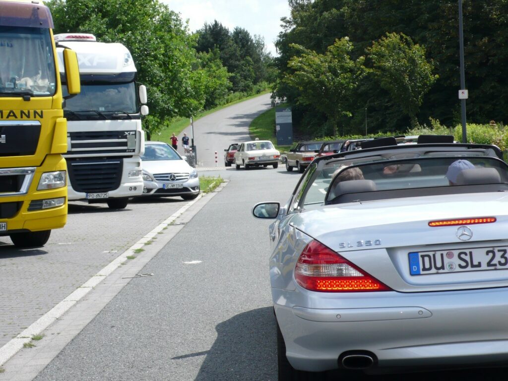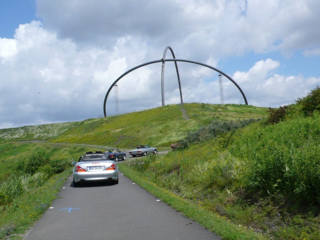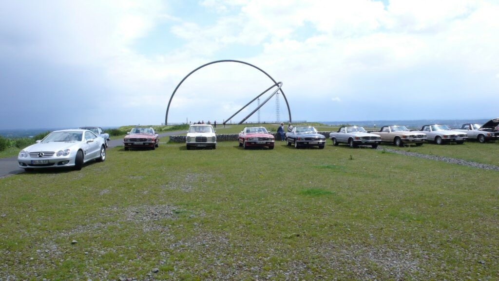 Eine individuelle Entdeckungsfahrt, speziell für den RT47 vorbereitet, führte uns auf die Halde Hoheward.12 Fahrzeuge incl. Besatzung und einer sehr engagierten Gästeführerin des Besucherzentrums erlebten den besonderen Moment – die Schranke zur Auffahrt auf die Halde wurde eigens für unseren Club geöffnet – so konnten wir in einer Kolonne die Auffahrt auf die wunderschöne Halde beginnen. Das Wetter spielte bis zu diesem Moment noch mit, mit geöffnetem Verdeck – SL-like– konnten wir die Auffahrt genießen. Ein erster Halt stellte sich auf einem Plateau mit einem einzigartigen Blick auf das gesamte Industriegebiet, Duisburg, Essen, Oberhausen, Bottrop ein.