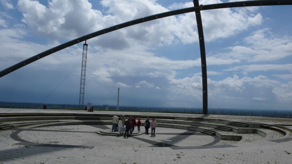 Die Weiterfahrt, im strömenden Regen mit Blitz und Donner, ging zum dritten Plateau wo wir die wunderschönen Stahlbögen des Horizontobservatoriums (45 Meter hoch) erreichten. Die Bögen die sich wie die Großkreise Meridian und Himmelsäquator über den Platz spannen, ermöglichen mit Hilfe einiger Peilmarken die Beobachtung der Sonne und wichtiger Sterne am Firmament. Durch den Auf- und Untergang der Sonne ist u.a. die Beobachtung der Kalendertage wie Sommersonnenwende, Wintersonnenwende sichtbar. Ein gigantisches Erlebnis, auch wenn das Innere des Forums zur Zeit nicht zugänglich ist. Der Blick erstreckte sich über die ganze Metropole Ruhr, der Heimat unseres RT 47. Ein ganz besonderer Moment, selbst die Sonne zeigte sich kurzweilig wieder versöhnlich.