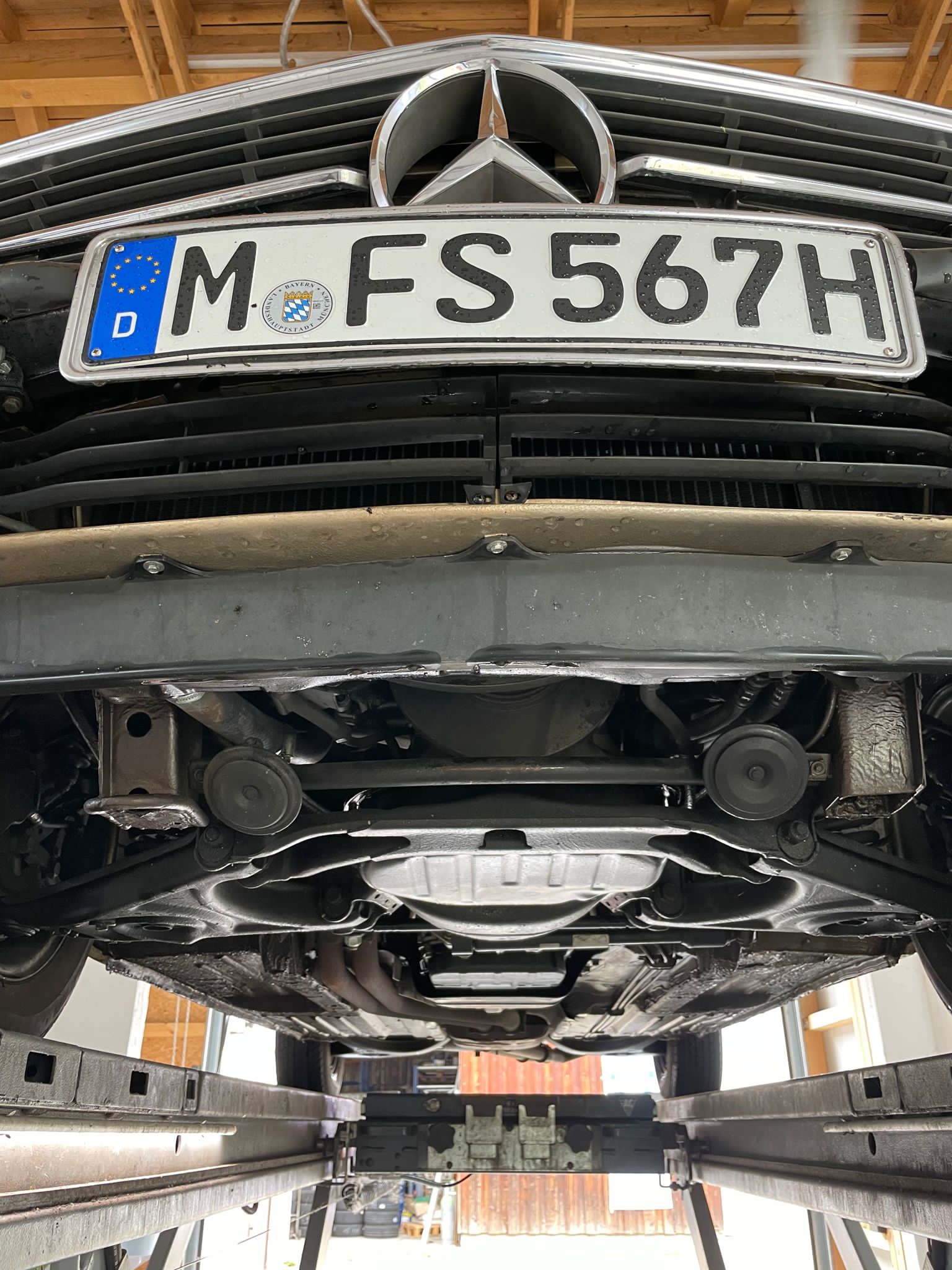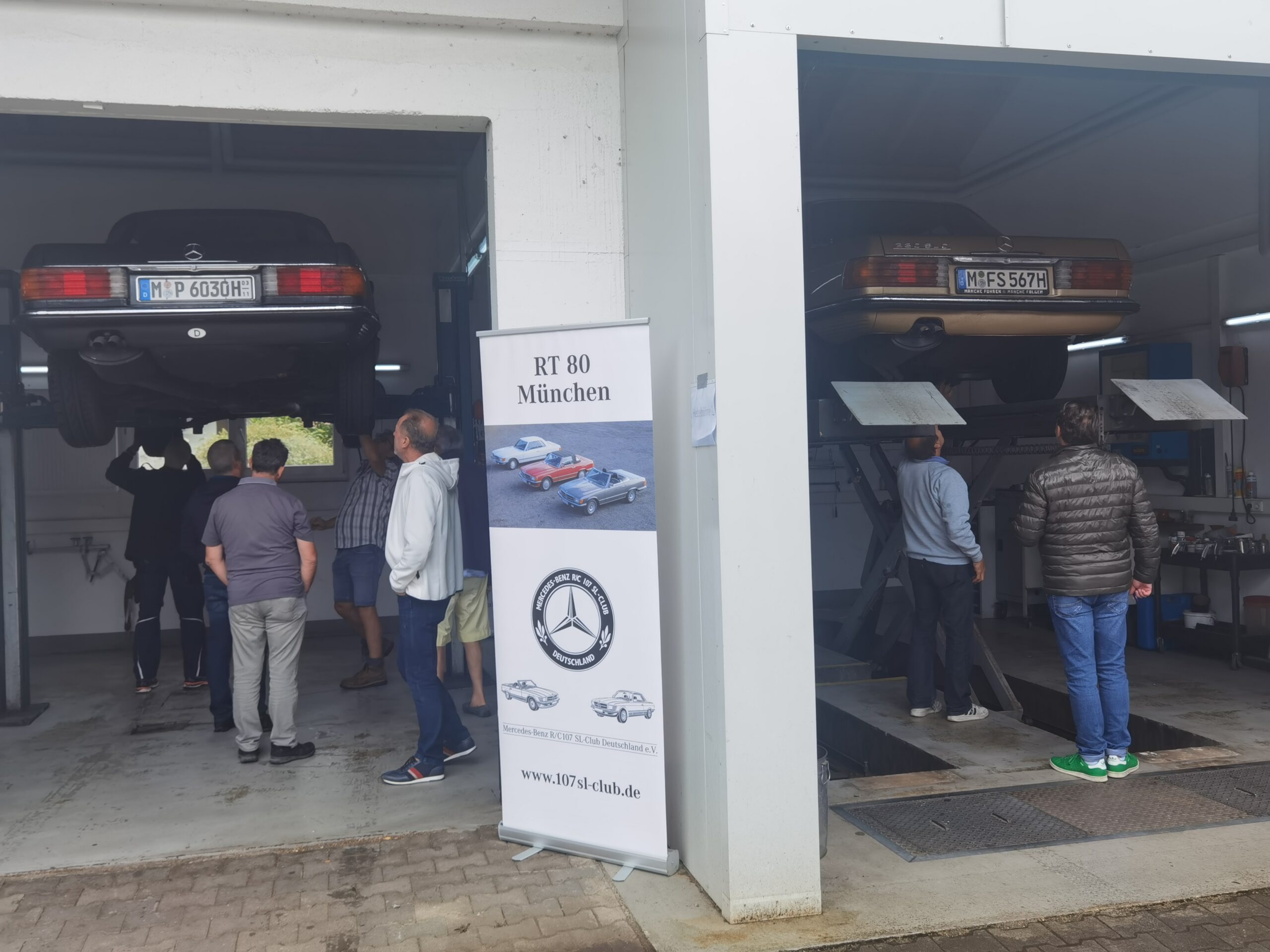 Auf 2 Hebebühnen wurden die Fahrzeuge abwechselnd von unserem Technikbeauftragten Dr. Heiner Sattel und von Michi Huhmann als weiteren Sachverständigen unter die Lupe genommen. Kleinere Reparaturen wurden sofort ausgeführt und auch die in der letzten 107-Klassik angesprochenen Schmierung der Lenkanschläge wurde mit durchgeführt.