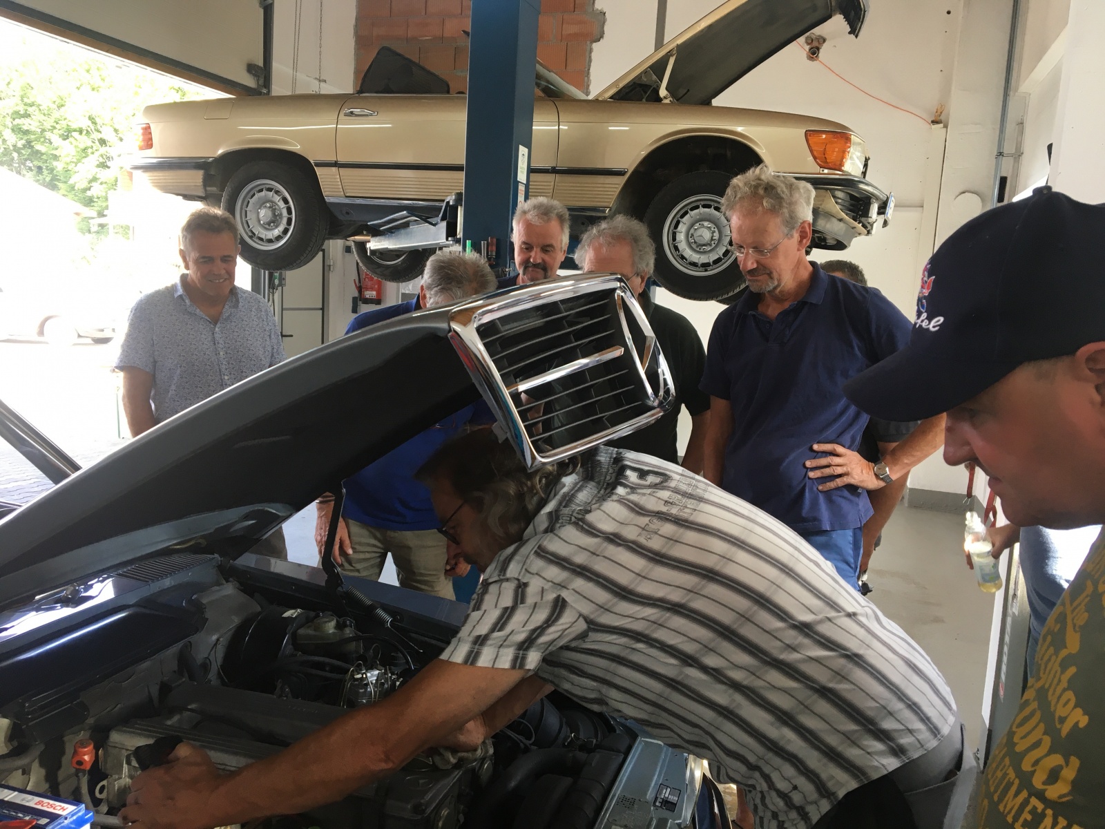 Ich hatte gem. den Anmeldungen einen Ablaufplan und Checklisten erstellt. Herzlichen Dank auch an dieser Stelle an den RT 83, dessen Formblätter wir nutzen konnten. Leider ist kurzfristig unser Technikbeauftragter Dr.-Ing. Heiner Sattel ausgefallen, so dass mit Michi Huhmann nur ein „Prüfer“ zur Verfügung stand. Aber durch die Verfügbarkeit zweier Hebebühnen, der tatkräftigen Unterstützung von Werkstattbesitzer Hans Wellers, dem Sohn von Hans Markus und der Disziplin aller Teilnehmer konnten wir alle Fahrzeuge checken. Viele Besitzer sahen „ihren Liebling zum ersten Mal von unten. Dies wurde sehr dankbar angenommen und einige fuhren doch mit gemischten Gefühlen nach Hause,