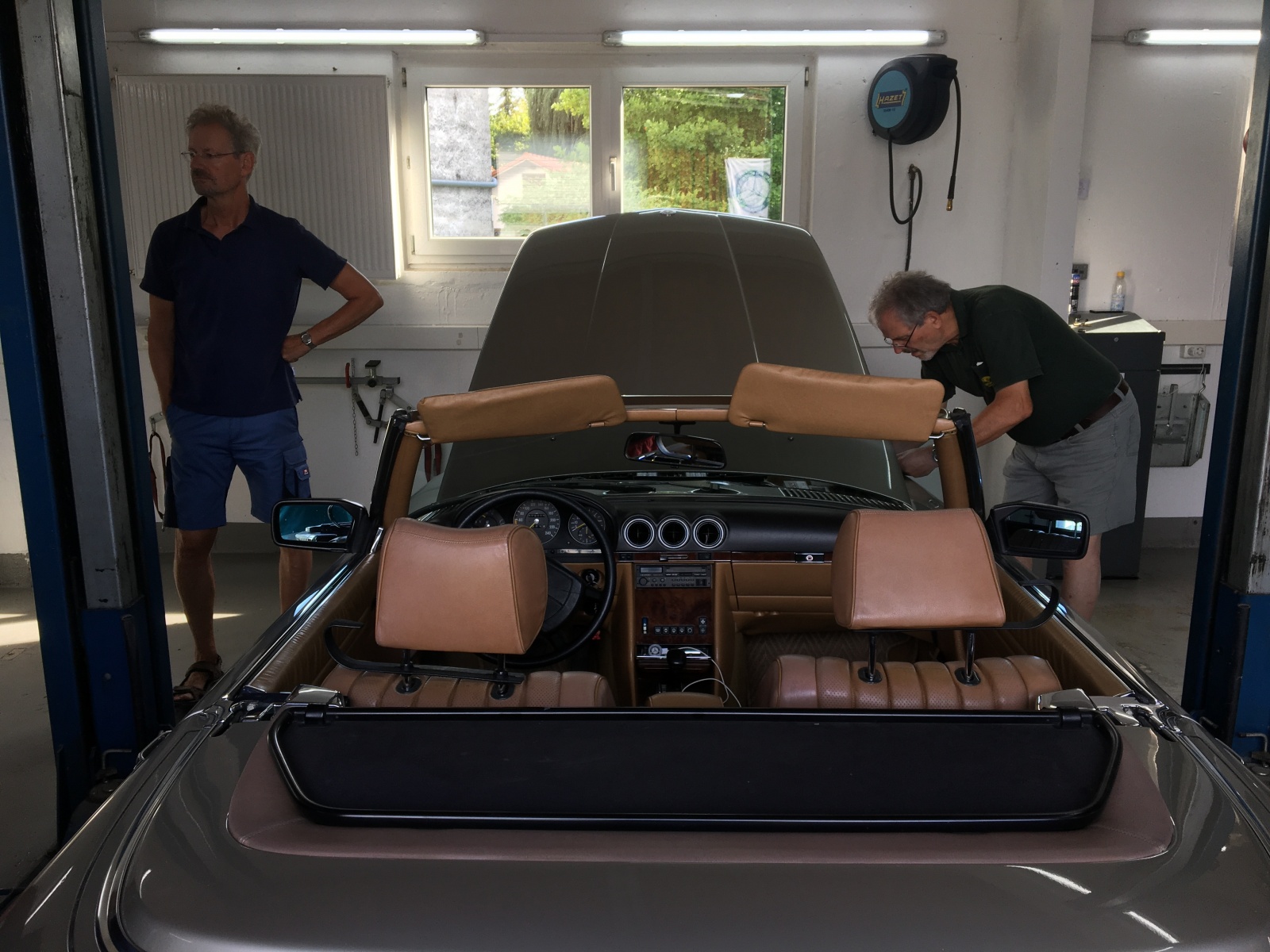 Ich hatte gem. den Anmeldungen einen Ablaufplan und Checklisten erstellt. Herzlichen Dank auch an dieser Stelle an den RT 83, dessen Formblätter wir nutzen konnten. Leider ist kurzfristig unser Technikbeauftragter Dr.-Ing. Heiner Sattel ausgefallen, so dass mit Michi Huhmann nur ein „Prüfer“ zur Verfügung stand. Aber durch die Verfügbarkeit zweier Hebebühnen, der tatkräftigen Unterstützung von Werkstattbesitzer Hans Wellers, dem Sohn von Hans Markus und der Disziplin aller Teilnehmer konnten wir alle Fahrzeuge checken. Viele Besitzer sahen „ihren Liebling zum ersten Mal von unten. Dies wurde sehr dankbar angenommen und einige fuhren doch mit gemischten Gefühlen nach Hause,