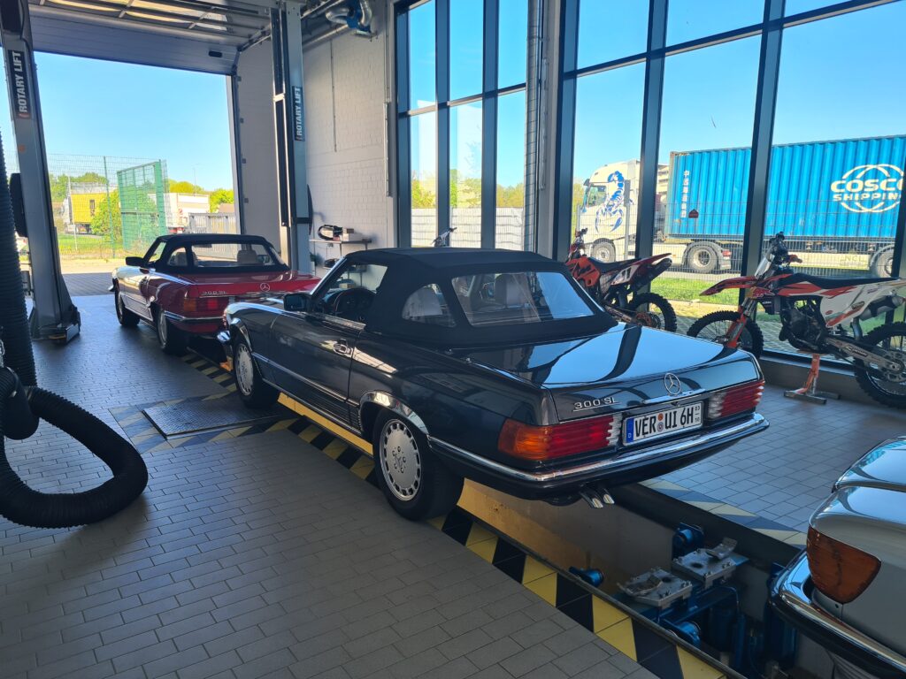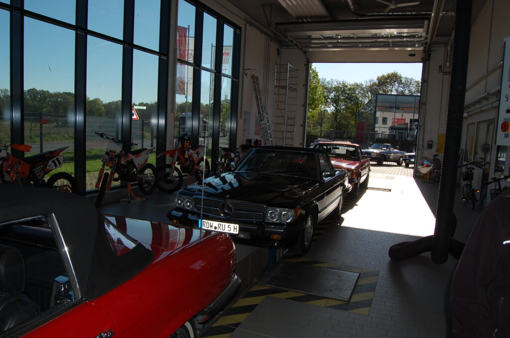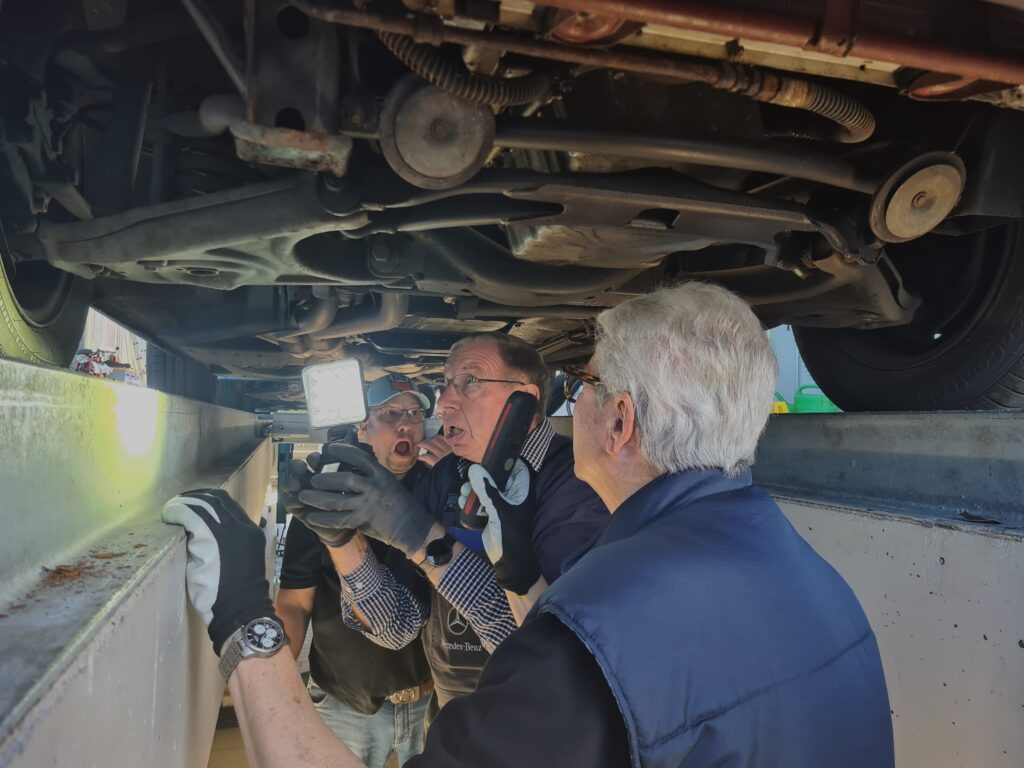 Bereits um kurz vor 9 Uhr standen die ersten drei 107er über der Grube und unsere Technikbeauftragten Rolf und Rolf (Schumacher und Gehle; auch ihnen ein herzliches Dankeschön!) machten sich ans Werk. Der ein oder andere Besitzer erfuhr Neuigkeiten über sein Auto, die er oder sie lieber nicht gehört hätte, andere wiederum schauten sehr zufrieden aus, als der Wagen die Inspektionsstraße verließ. So richtig schlimm war das Ergebnis aber bei keinem, alle konnten mit ihrem SL wieder nach Hause fahren.
