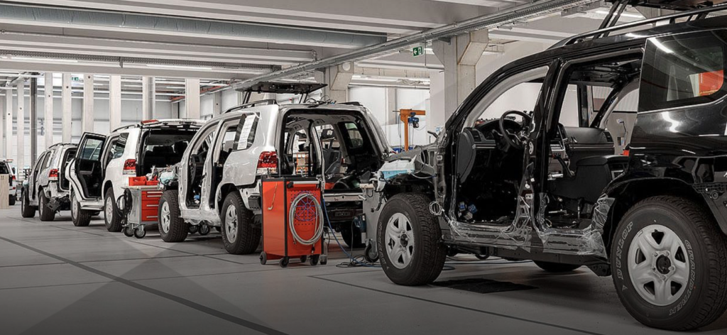 Der erste interessante Halt war bei der Firma Welp Group, die Serienfahrzeuge in gepanzerte Fahrzeuge für zivile und humanitäre Zwecke umbaut. Bei der Führung (Dank an Matthias) wurde sichtbar, welcher Aufwand nötig ist – erst die Zerlegung des Serienfahrzeuges um dann die Panzerung anzubringen. Alles um Insassen vor Angriffen aller Art in Krisengebieten bestmöglichtst zu schützen. Natürlich auch für private Personen oder wichtige Regierungsmitglieder.