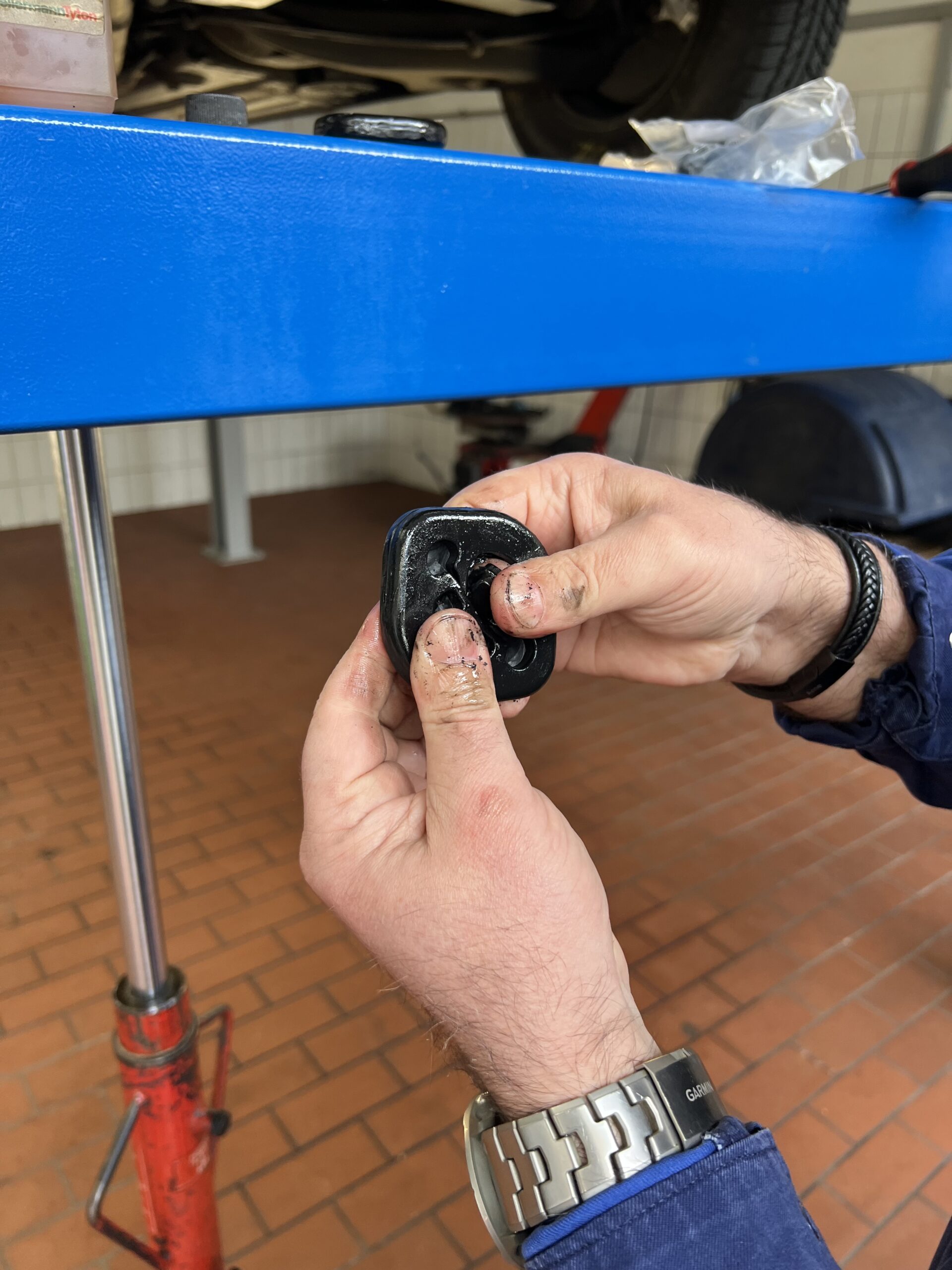 Im Bild ein neuer, verstärkter Gummi für die Auspuffanlage.