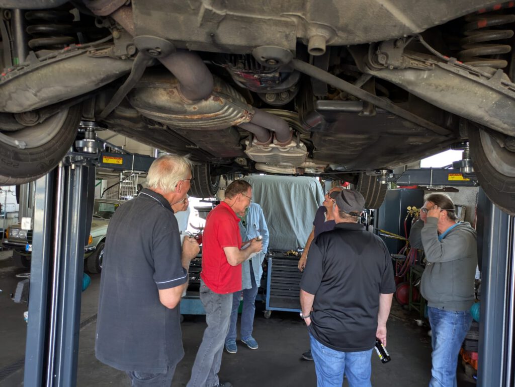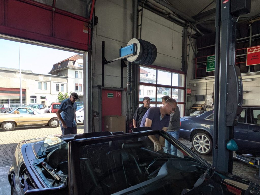 Anders als im Frühjahr lag der Schwerpunkt diesmal auf der eher technisch geprägten Seite. Immerhin konnten wir zwei Ölwechsel vor Ort – Dank der Hebebühnen und professioneller Ausstattung der Werkstatt – durchführen, Notentriegelung am Verdeckkastendeckel installieren und jede Menge weiterer, kleinerer Reparaturen durchführen. Unter der fachmännischen Aufsicht von unserem Clubkollegen Thomas konnten alle Beteiligten ihre Fahrzeuge auf der Hebebühne begutachten und eventuellen Handlungsbedarf identifizieren.