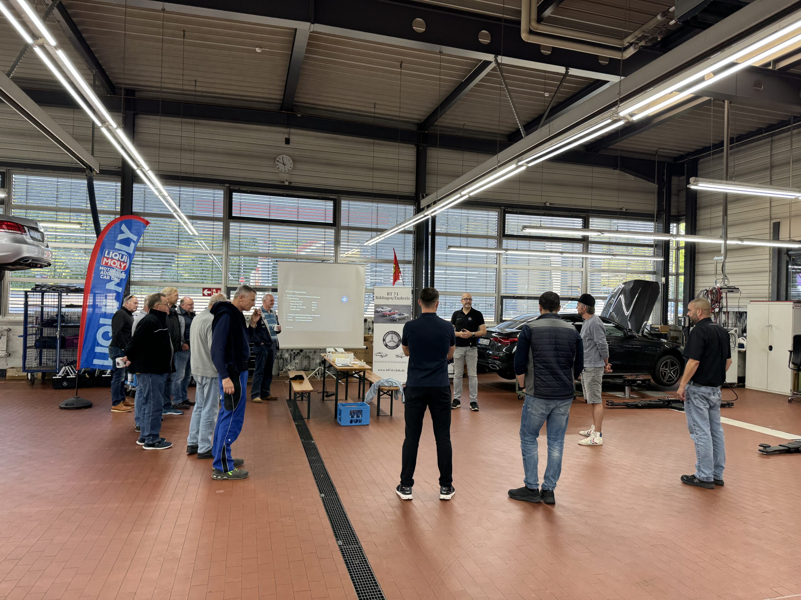 und wieder war es soweit, unser gemeinsamer Techniktag fand wieder in den heiligen Hallen der Niederlassung Leonberg bei Markus statt. Die Halle war wieder super freigeräumt für uns und alles sauber vorbereitet. Diesmal wieder der TÜV Süd mit dabei für Fahrzeugchecks und bei Bedarf auch einer HU, Liqui Moly stellte ihre Produktpalette vor insbsondere der Einsatz von Additiven für Oldtimer und natürlich unsere eigenen Fahrzeugchecks auf der Hebebühne in der Halle nebst Nebelprüfungen mit der Nebelmaschine und der Einsatz vom Herrman-Motortester.