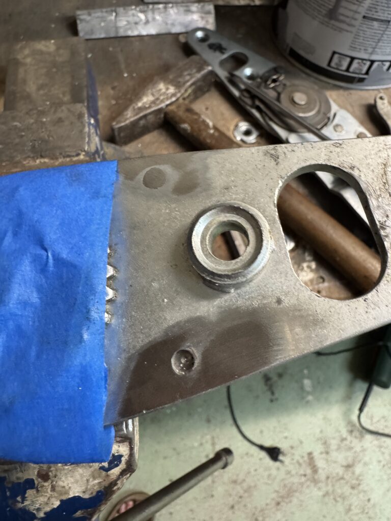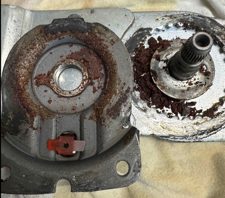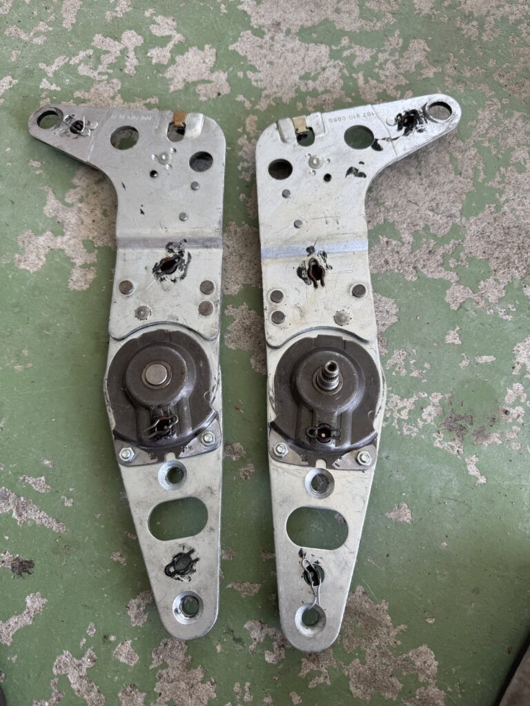 Bild: das Scharnier ist geöffnet in den 2 Löchern waren die Nieten drin, die später verschraubt werden. Die braune Pampe war mal die ursprüngliche Reibscheibe, da wird schnell klar da kann nichts mehr bremsen oder reiben.