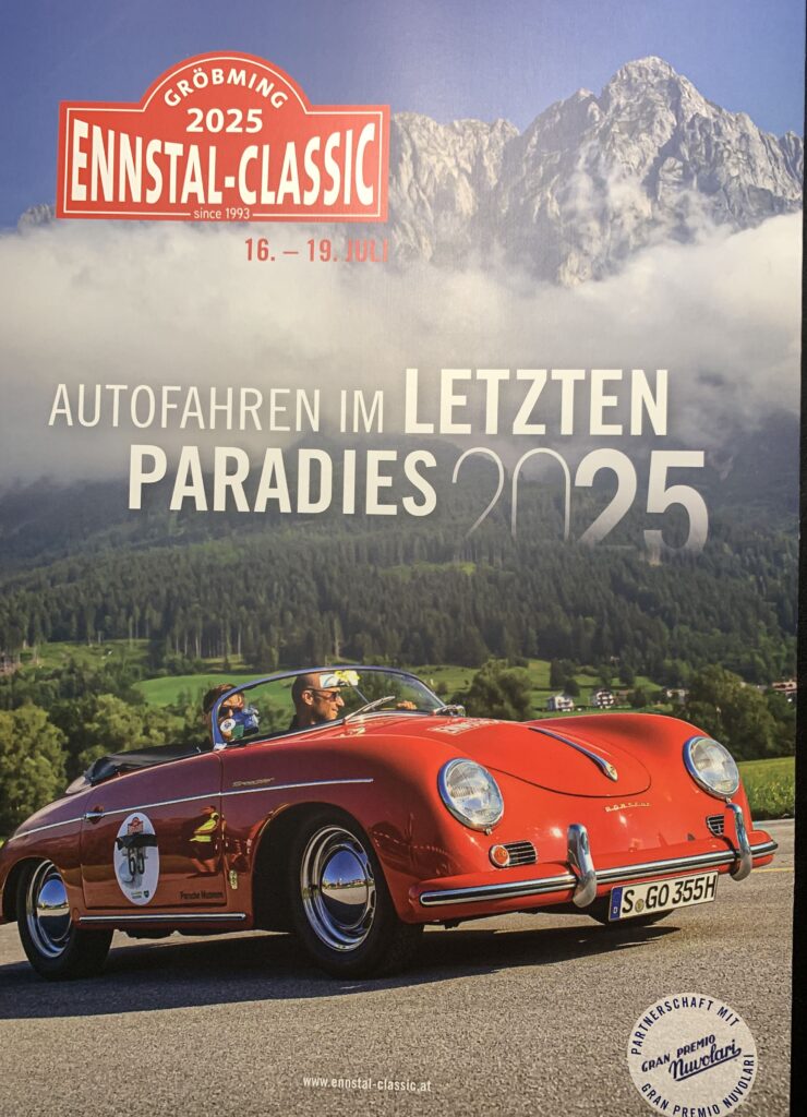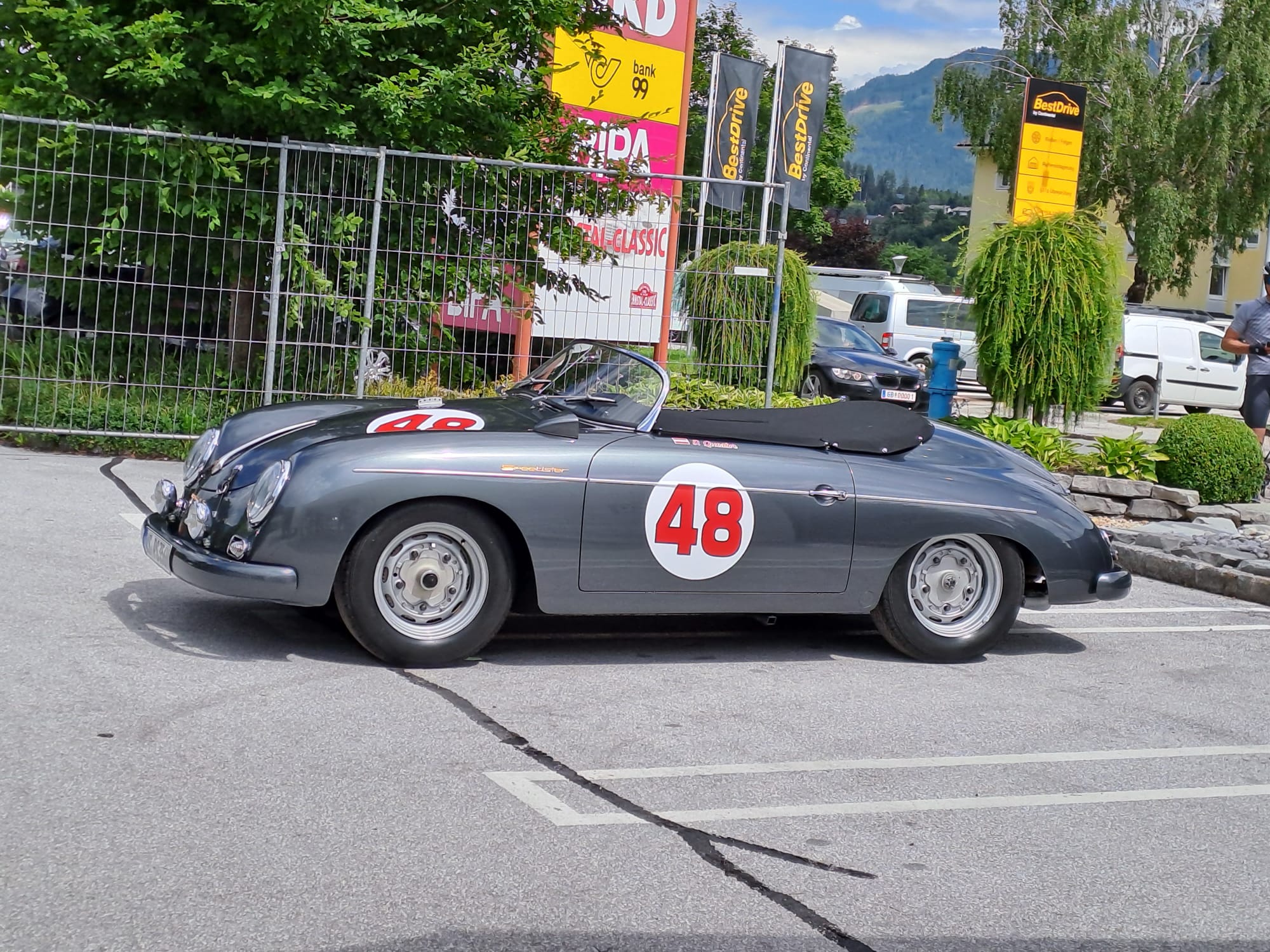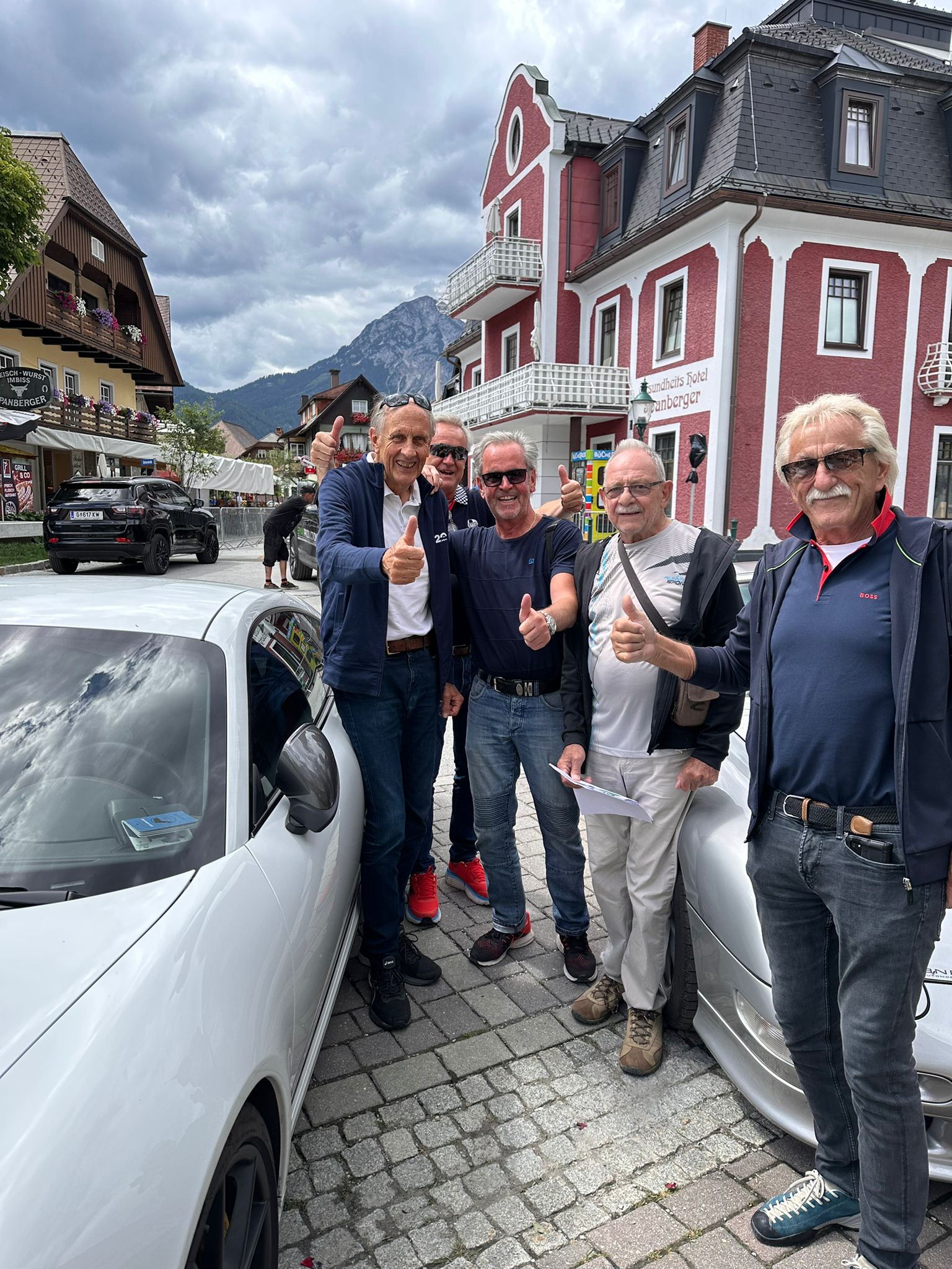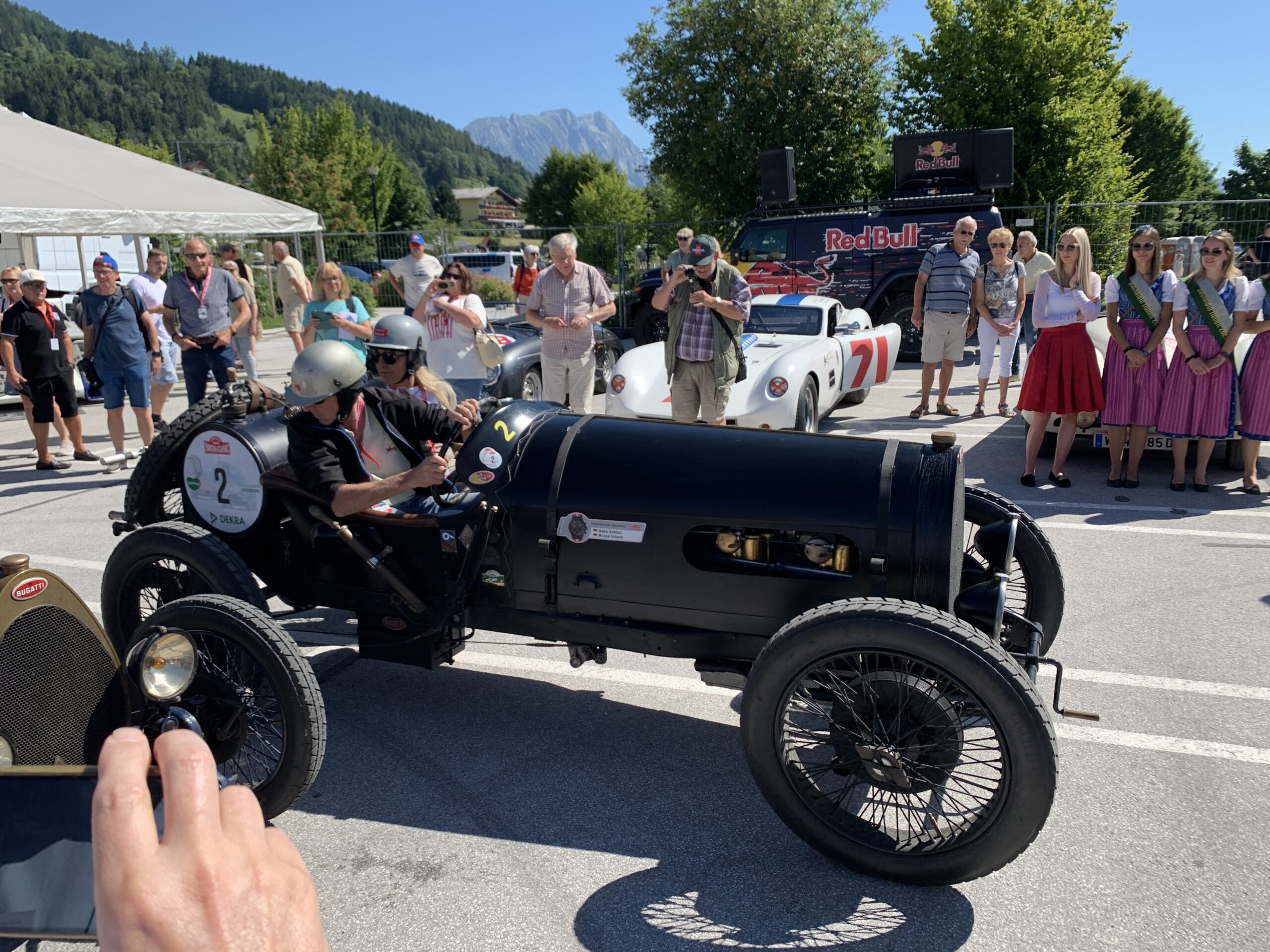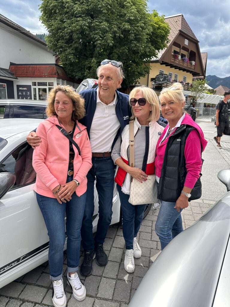 Die ältesten Fahrzeuge der 160 Teilnehmer waren 2 über 100 Jahre alten Bugattis eines Ehepaares aus München. Kurz vor dem Zieleinlauf (zurück von der Bergprüfung am Stoderzinken) gab es einen Schaulauf ganz besonderer Wagen. Auch Hans-Joachim Stuck fuhr mit seinem 962-er mit. Den trafen wir ja kurz zuvor im Dorf beim Kaffeeplausch mit Dieter Quester. Strietzel nahm sich gerne Zeit, um mit uns ein Fotoshooting zu machen.