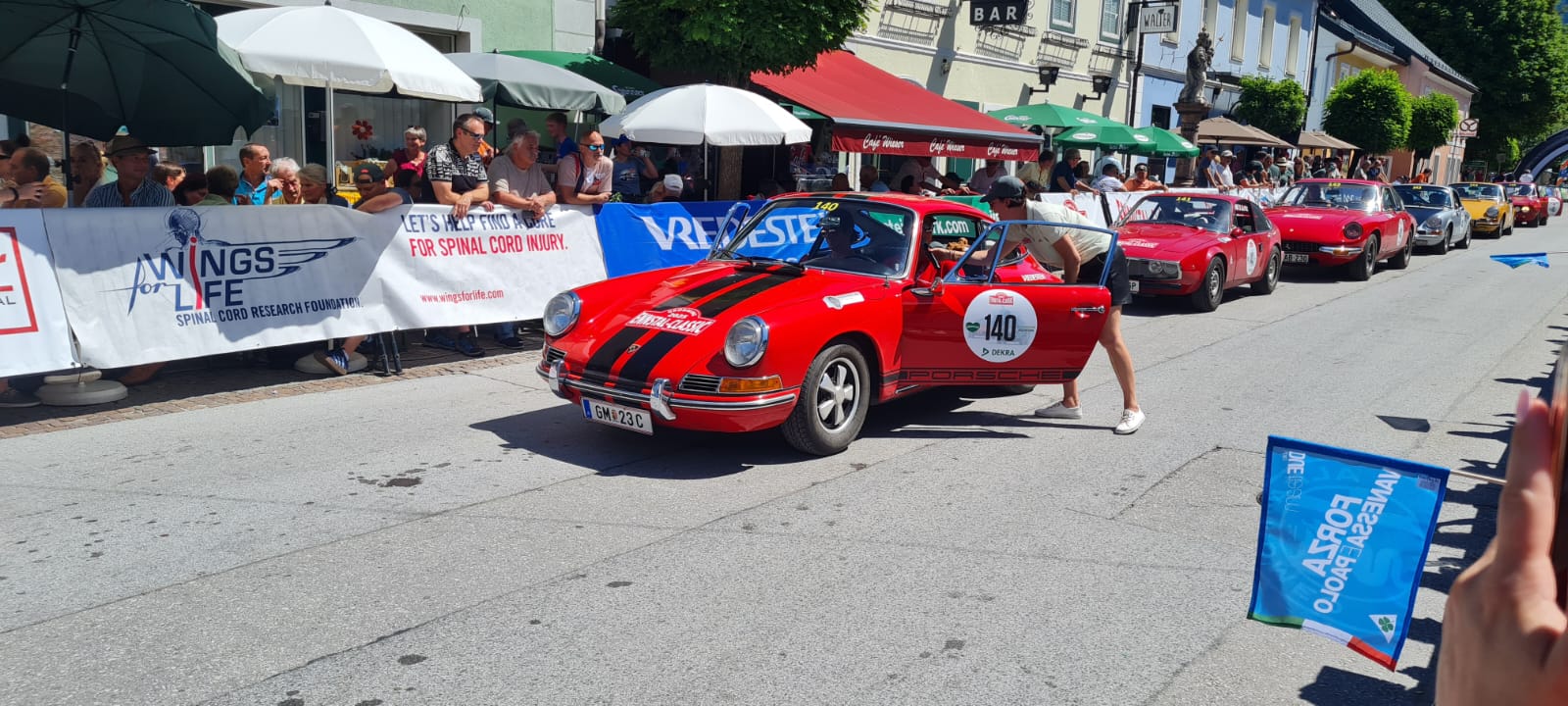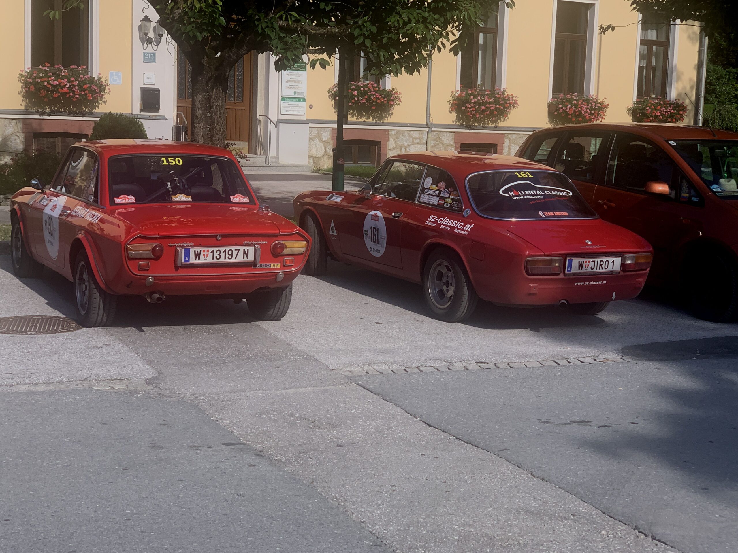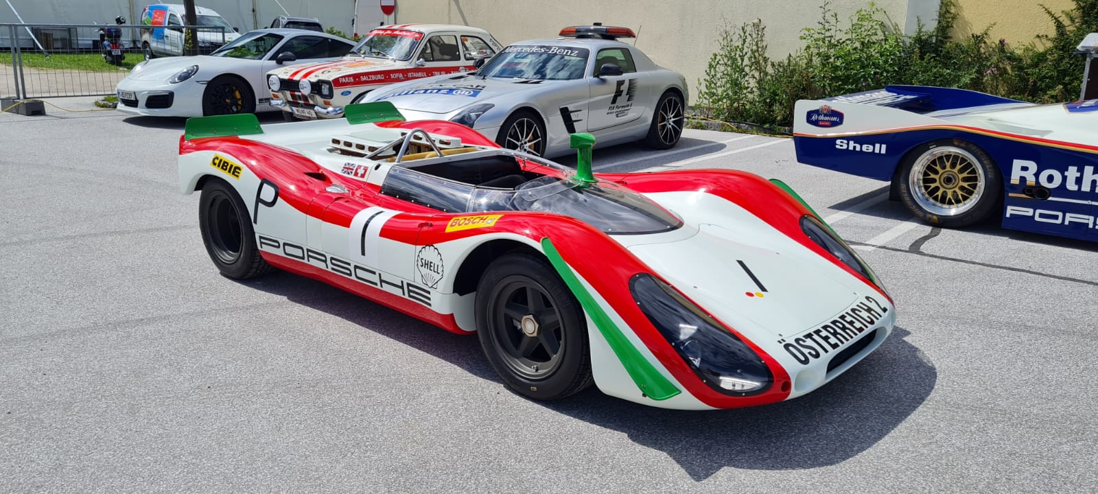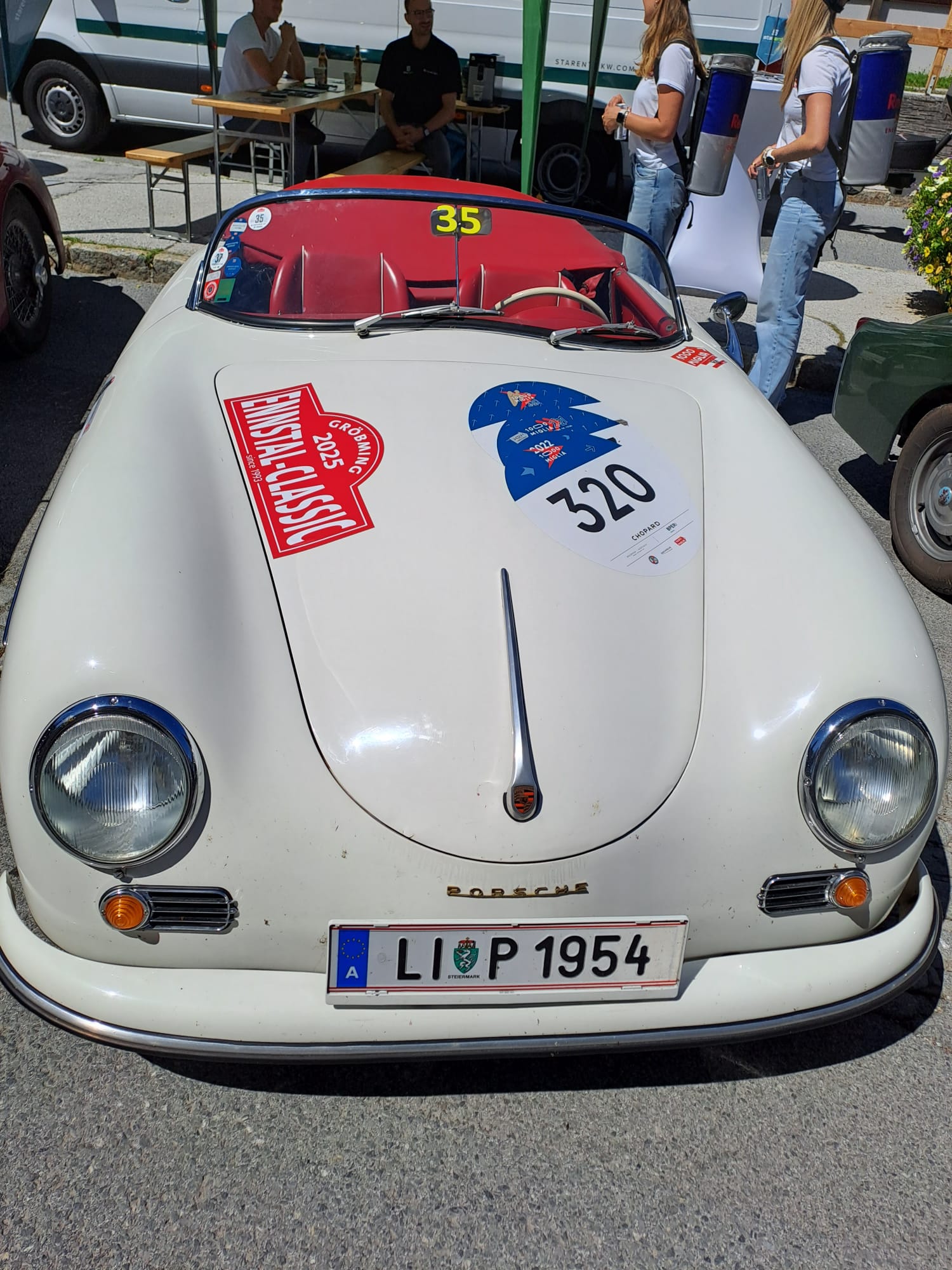 Die ältesten Fahrzeuge der 160 Teilnehmer waren 2 über 100 Jahre alten Bugattis eines Ehepaares aus München. Kurz vor dem Zieleinlauf (zurück von der Bergprüfung am Stoderzinken) gab es einen Schaulauf ganz besonderer Wagen. Auch Hans-Joachim Stuck fuhr mit seinem 962-er mit. Den trafen wir ja kurz zuvor im Dorf beim Kaffeeplausch mit Dieter Quester. Strietzel nahm sich gerne Zeit, um mit uns ein Fotoshooting zu machen.