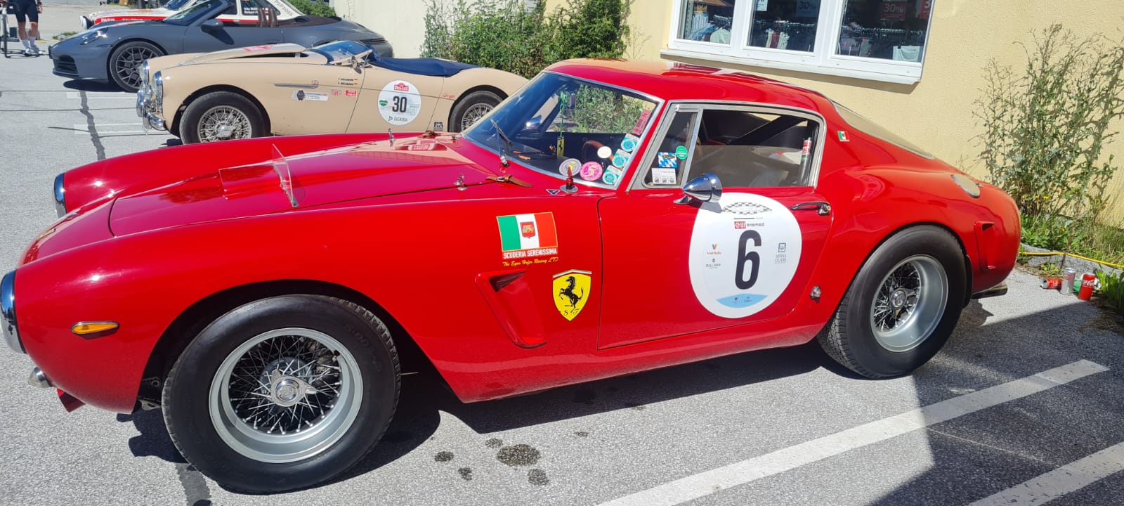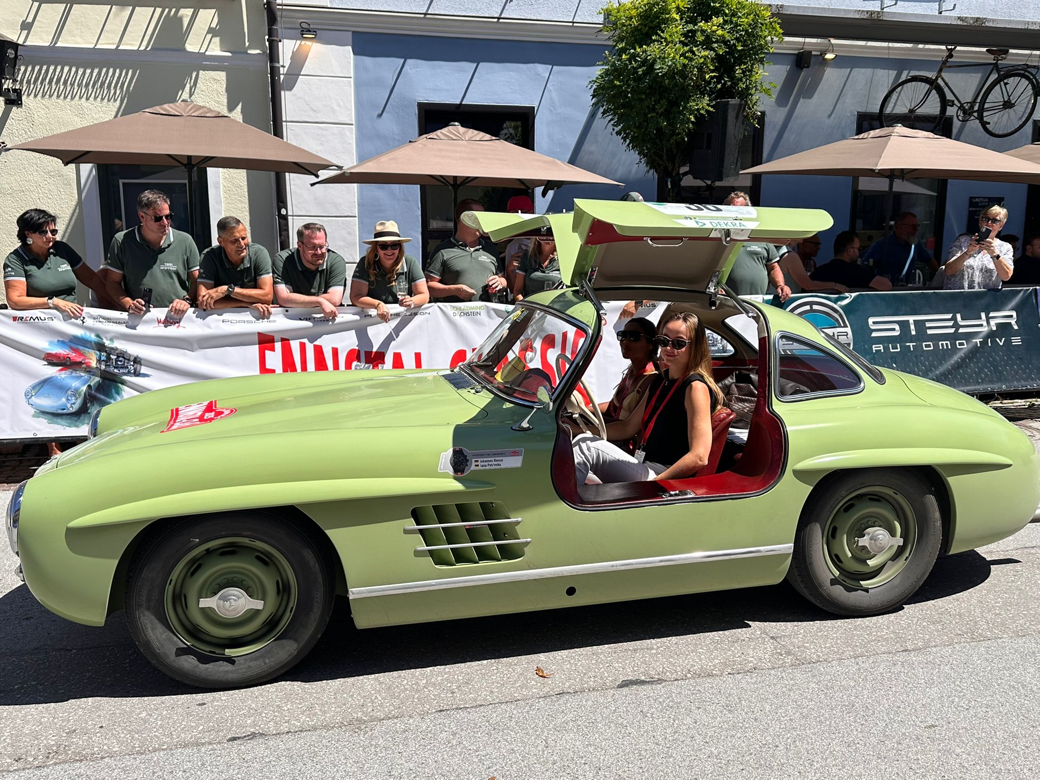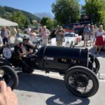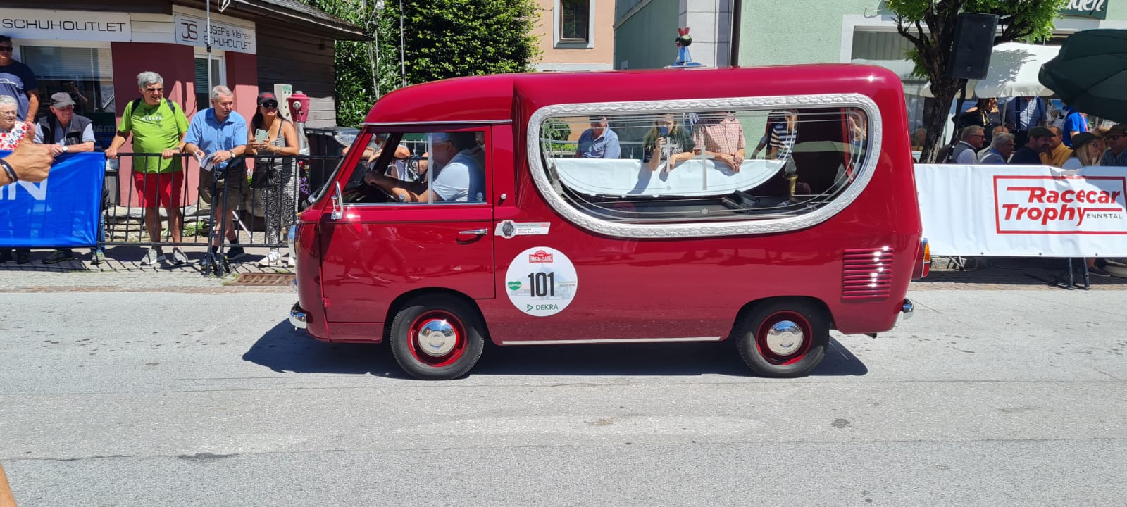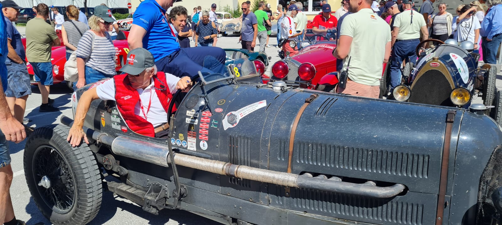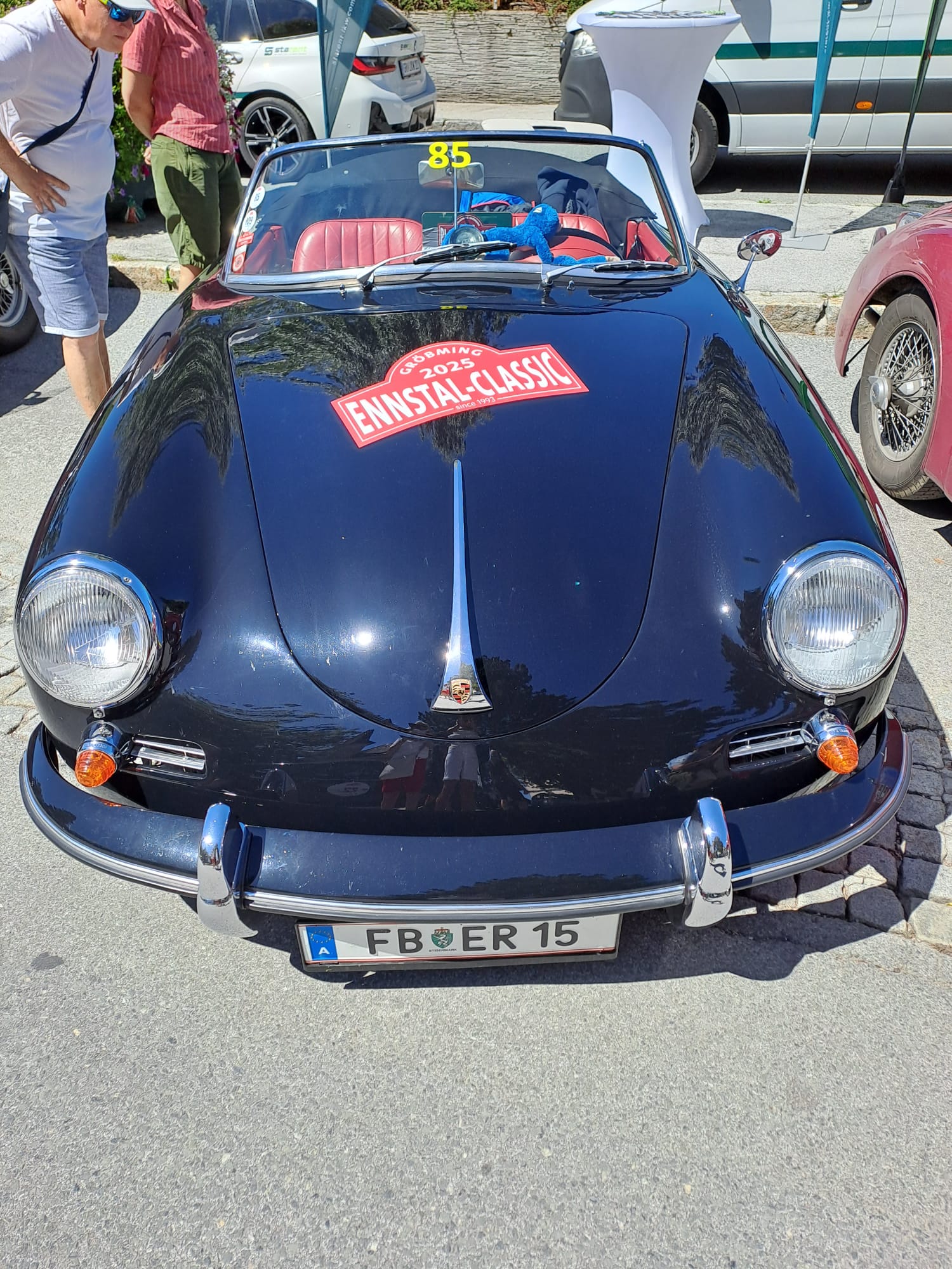 Die ältesten Fahrzeuge der 160 Teilnehmer waren 2 über 100 Jahre alten Bugattis eines Ehepaares aus München. Kurz vor dem Zieleinlauf (zurück von der Bergprüfung am Stoderzinken) gab es einen Schaulauf ganz besonderer Wagen. Auch Hans-Joachim Stuck fuhr mit seinem 962-er mit. Den trafen wir ja kurz zuvor im Dorf beim Kaffeeplausch mit Dieter Quester. Strietzel nahm sich gerne Zeit, um mit uns ein Fotoshooting zu machen.