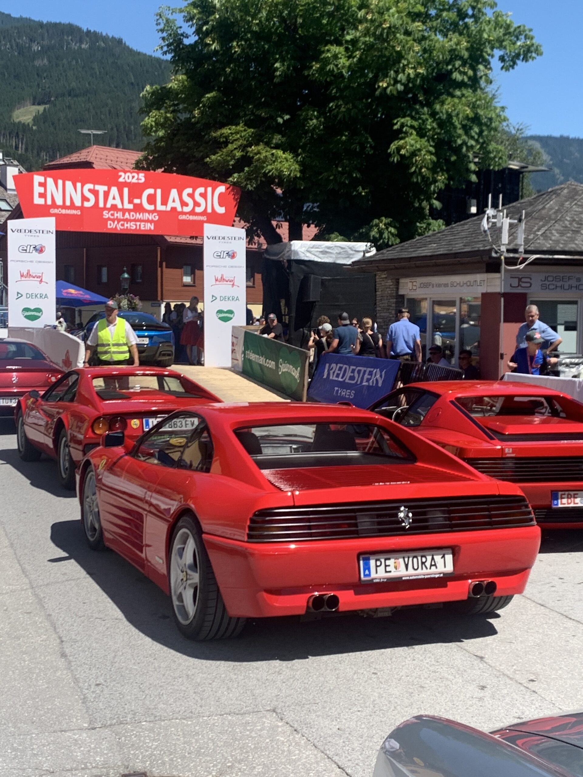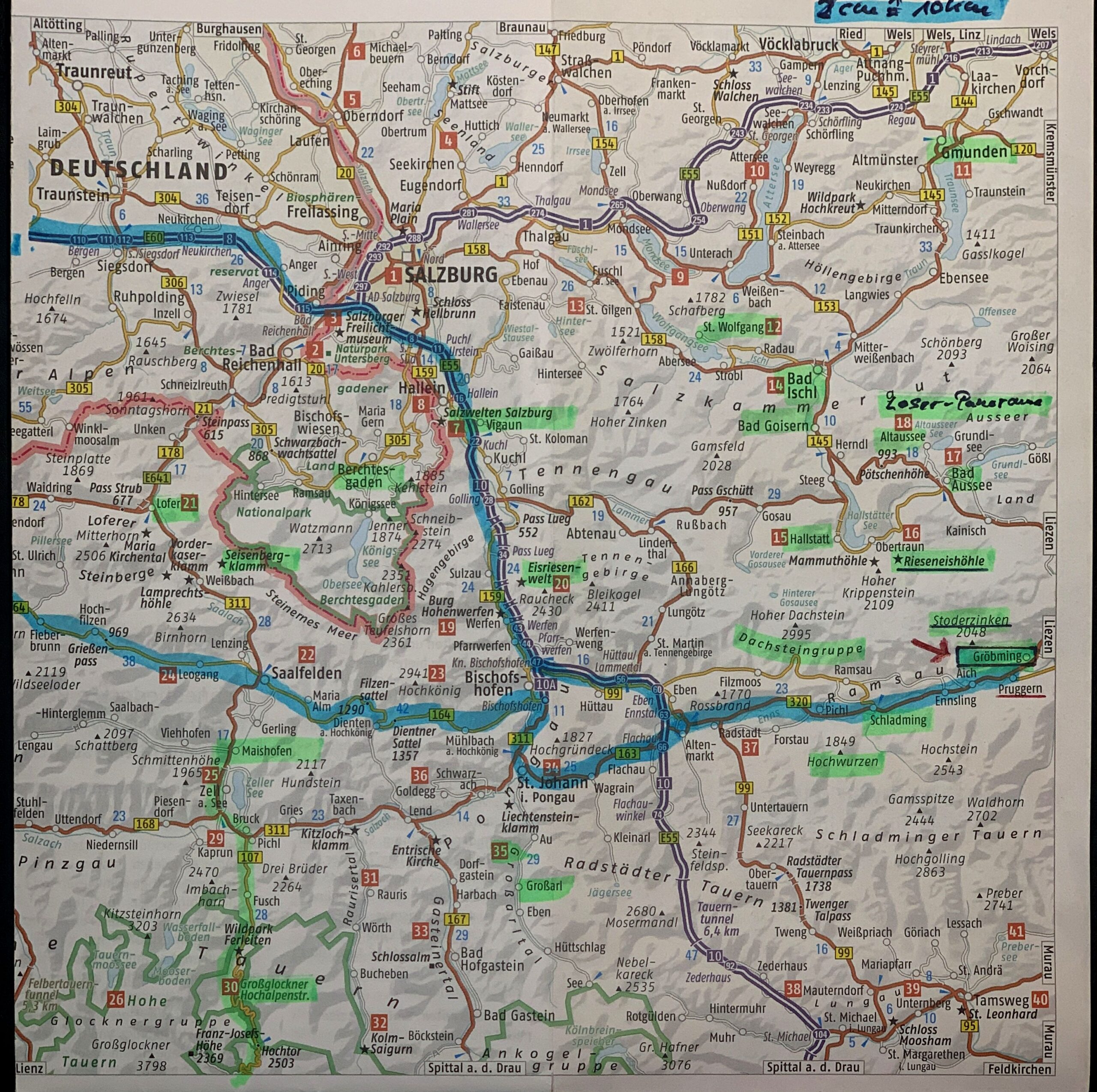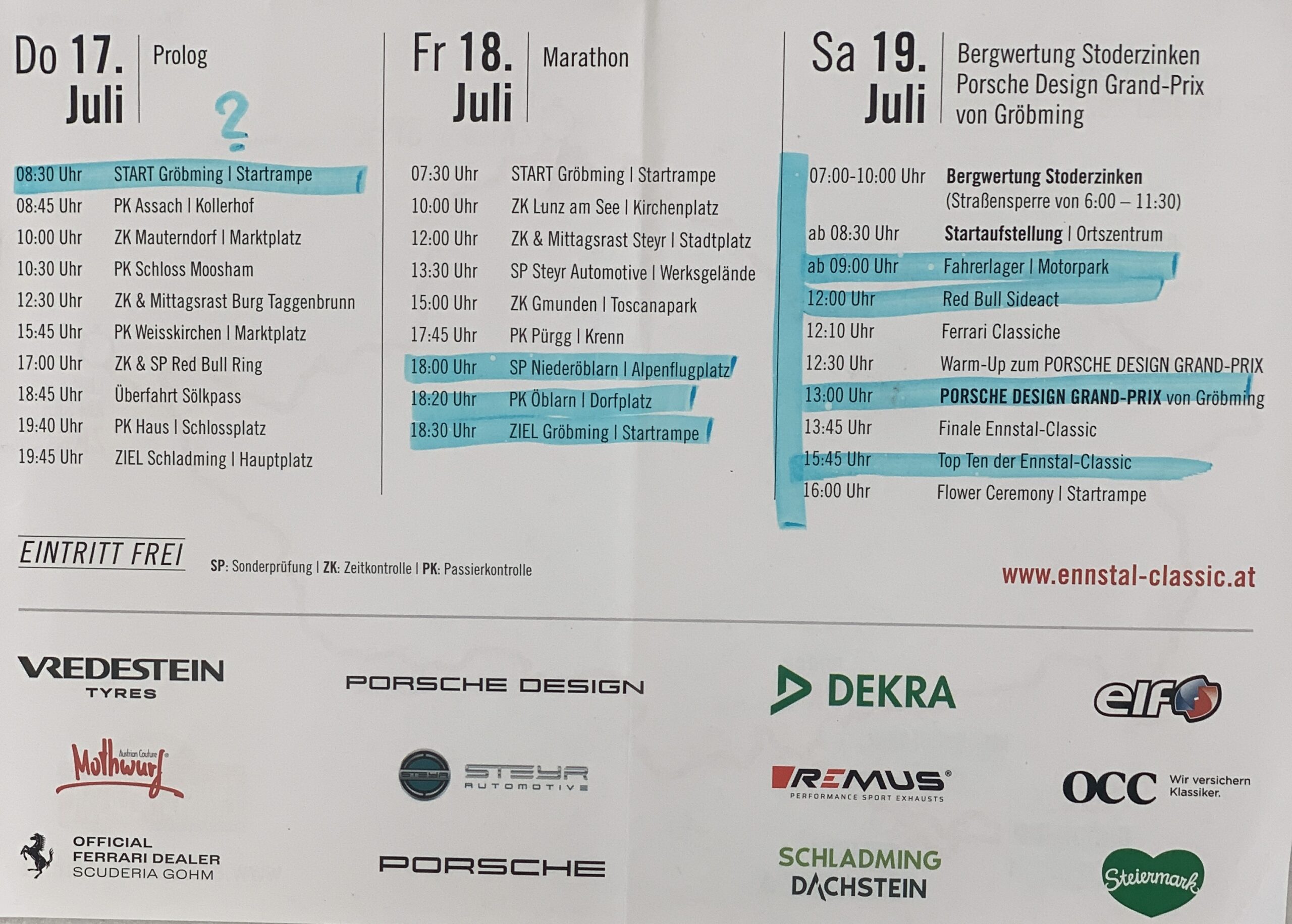 Um zügig die ca. 500 km zu bewältigen fuhren wir auf A8/A99 bis Rosenheim. Dann über Kufstein, St. Johann und Schladming zu unserem Gasthof. Der liegt 5 km neben Gröbming; dem Start- und Zielpunkt der Rallye. Die Ennstal Classic ist eines der großen Events neben der Mille Miglia oder Silvrettta Classic.