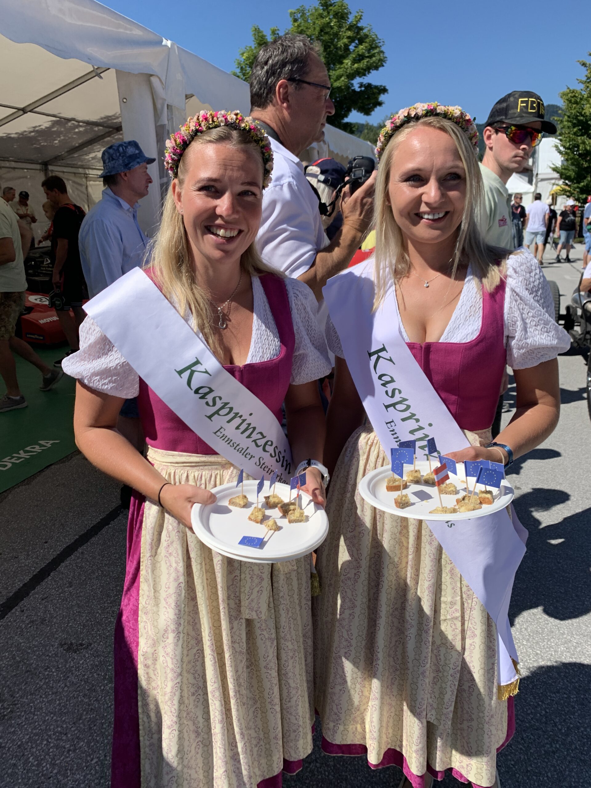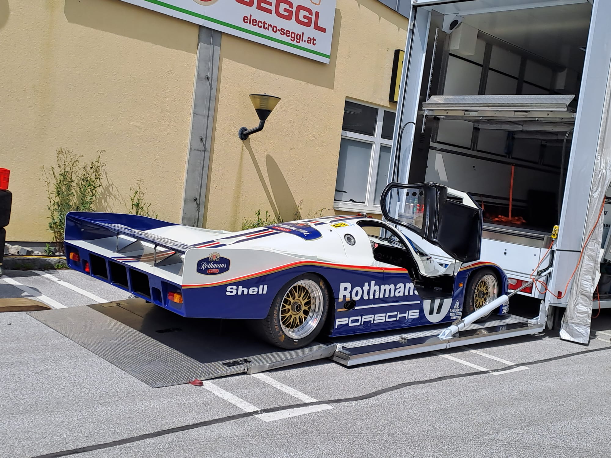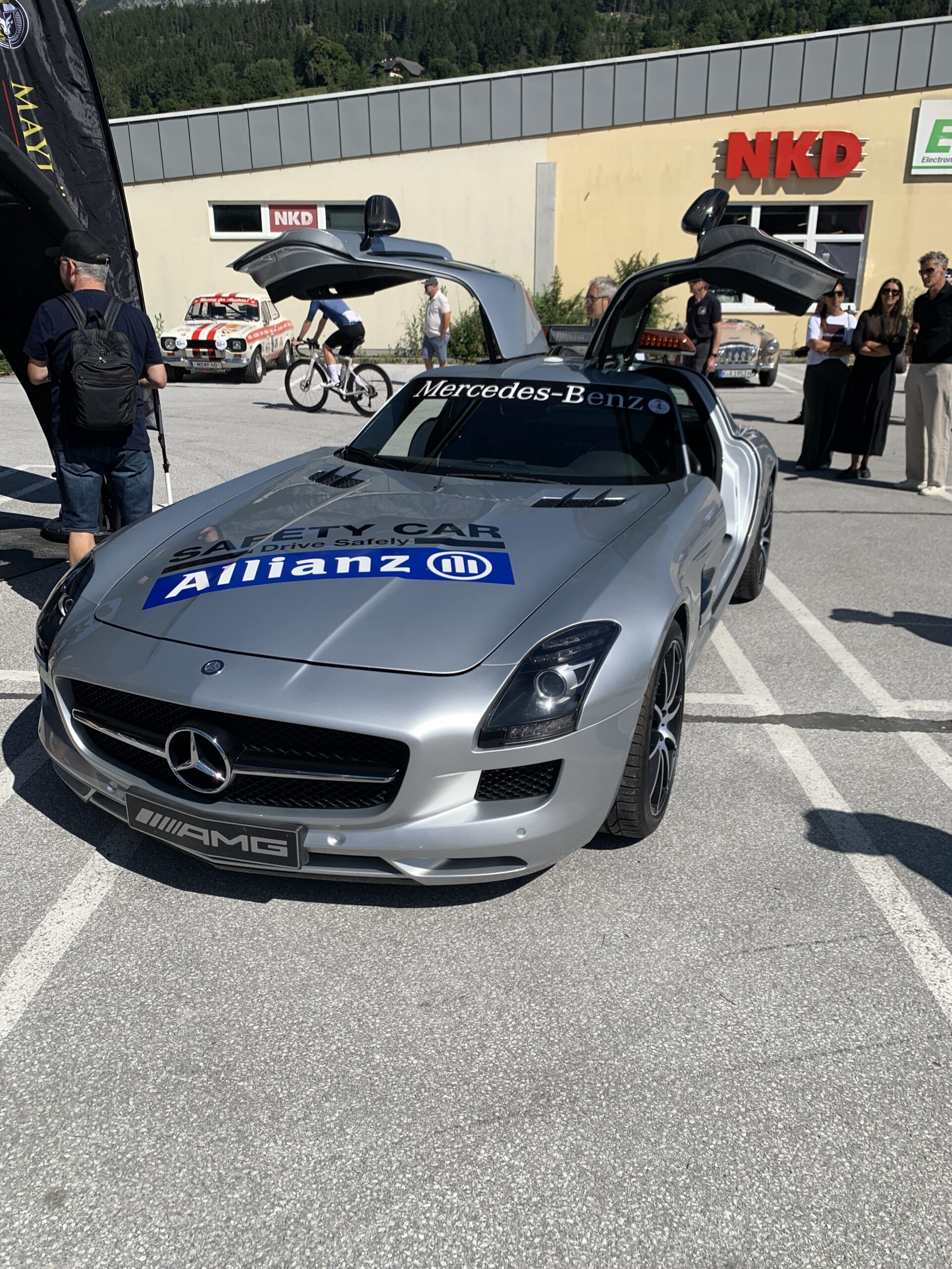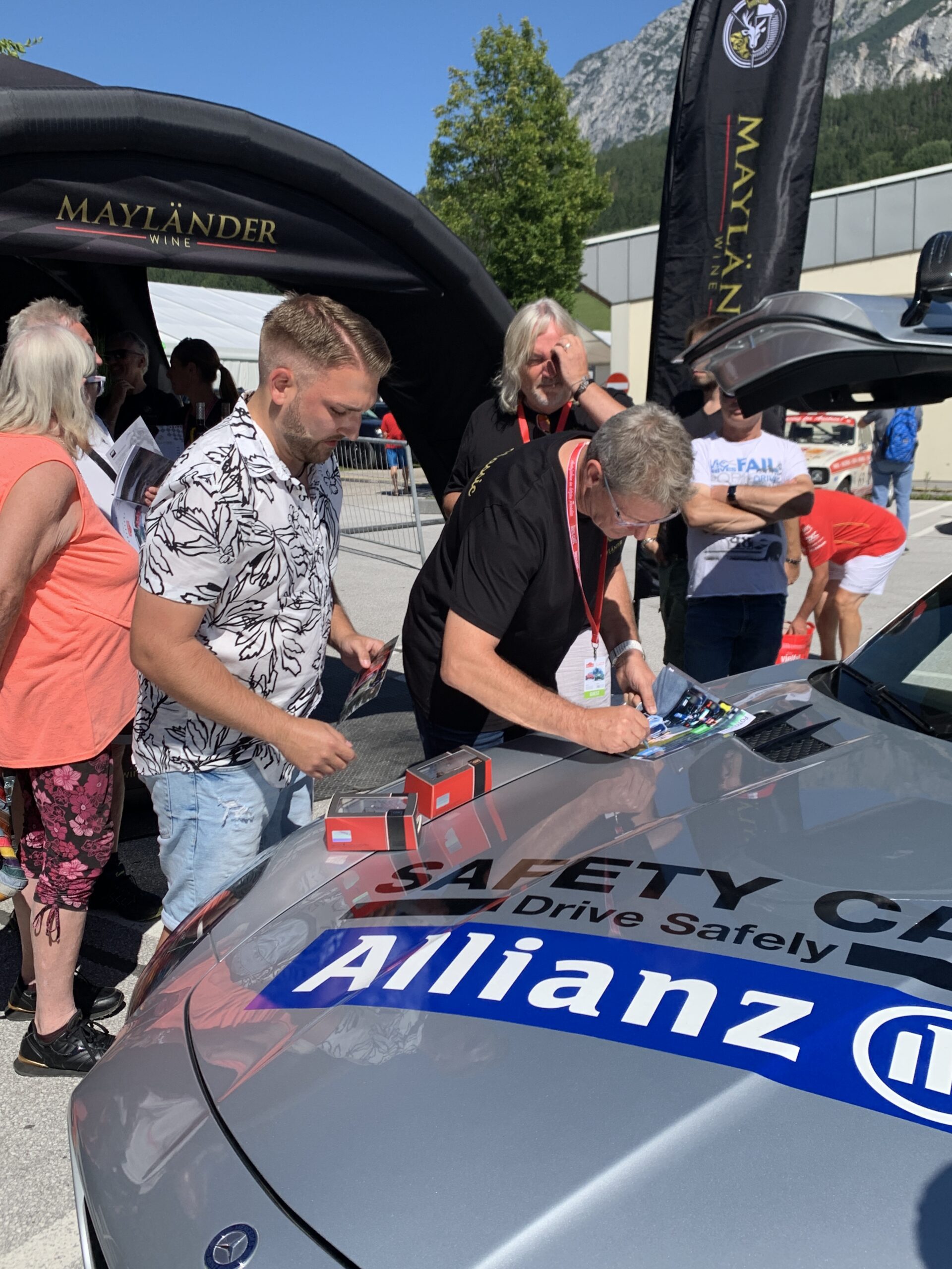 Mangels Parkplätzen in Gröbming ließen wir die SL im Carport und machten uns per Bus bzw. zu Fuß auf den Weg. Zuerst stand die große Fahrzeugausstellung auf dem Programm. Eine Besonderheit war, dass wir beim Abladen des Porsche 962 Gruppe C von Hans-Joachim Stuck zusehen konnten. Mit diesem Fahrzeug hatte er mit seinem Team die 24 h von Le Mans 1986 gewonnen. Bernd Mayländer gab an seinem Safetycar kräftig Autogramme.