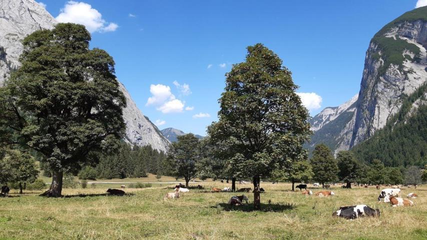 Am Großen Ahornboden auf 1200m Höhe stehen ca. 2200 Ahornbäume, teilweise aus dem 17. Jahrhundert. Laut Informationen sollen die jungen Bäume im 30 jährigen Krieg stehen geblieben sein, weil das Vieh nicht mehr auf die Weiden getrieben worden ist. Später hat man erkannt, dass die Bäume idealen Schatten für die Kühe geben und sich auch der Ahornsamen als gute Futterbeimischung eignet.