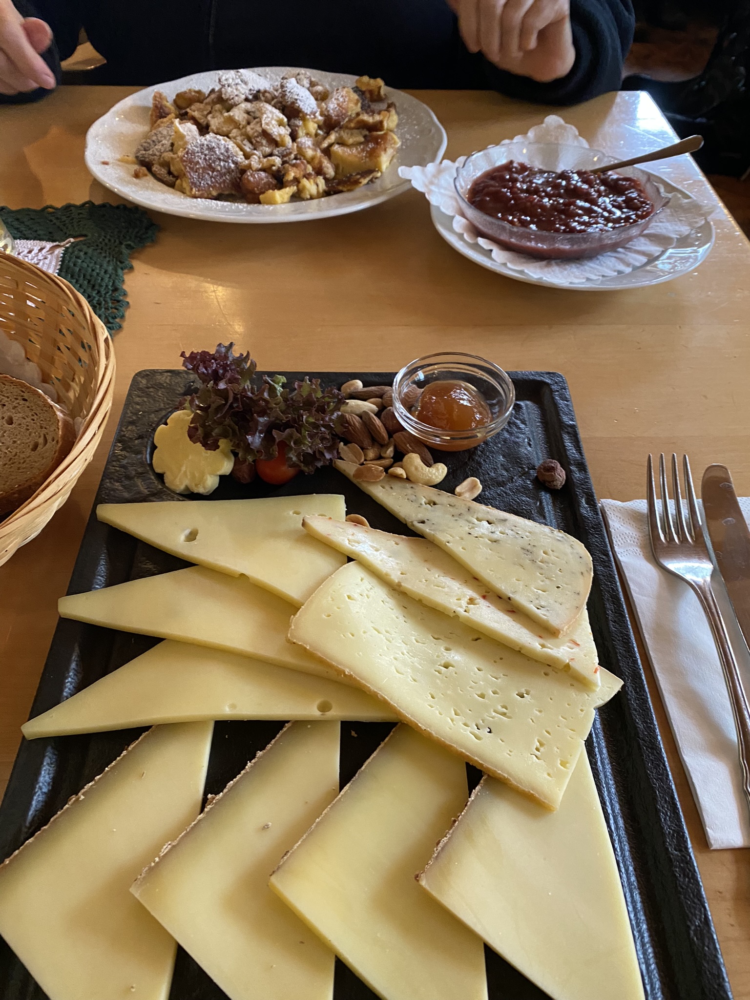Wir hatten reservierte Plätze draußen, die meisten von uns wählten, typisch bei diesem Wetter, natürlich Kaiserschmarrn und wer es echt mag, nahm auch Buttermilch dazu.