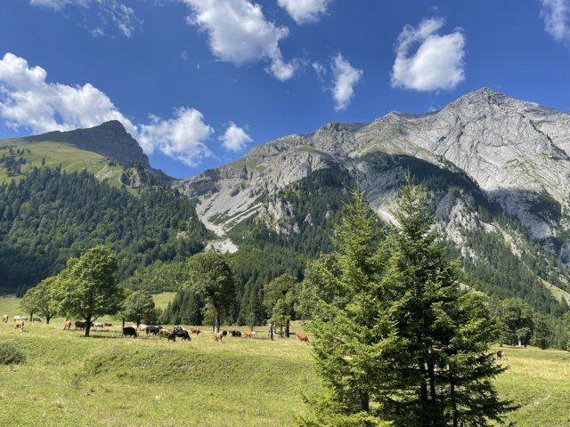 Wir entschieden uns für die Eng Alm, die u.a. auch für den hier erzeugten Bergkäse berühmt ist. Auf dem 15 minütigen Weg zur Eng Alm konnten wir die Erzeuger des Rohstoffes für den Käse in die Augen blicken.