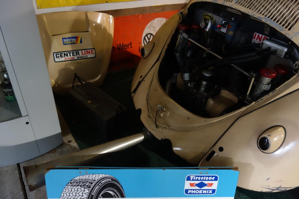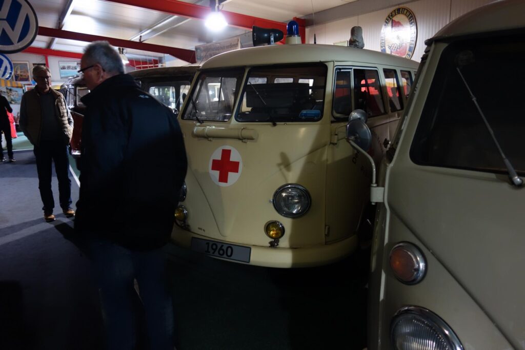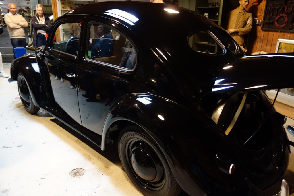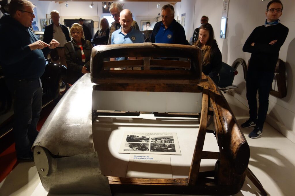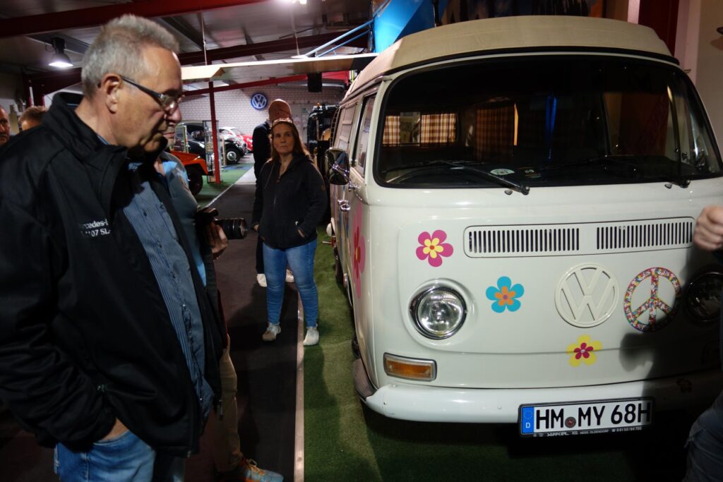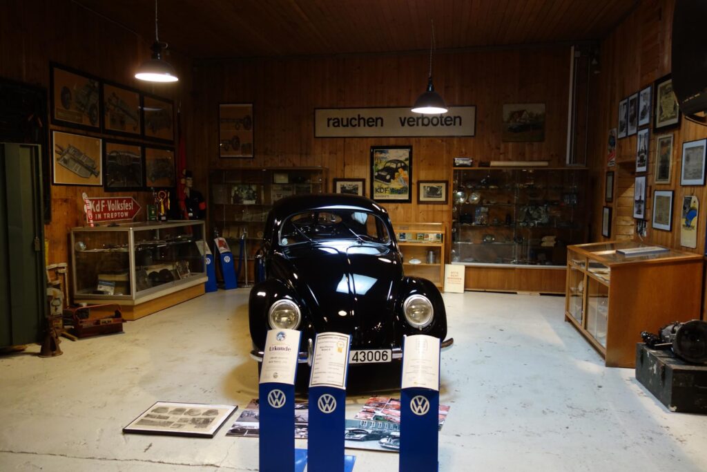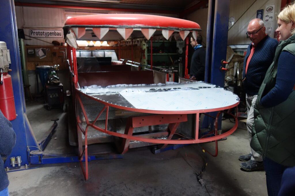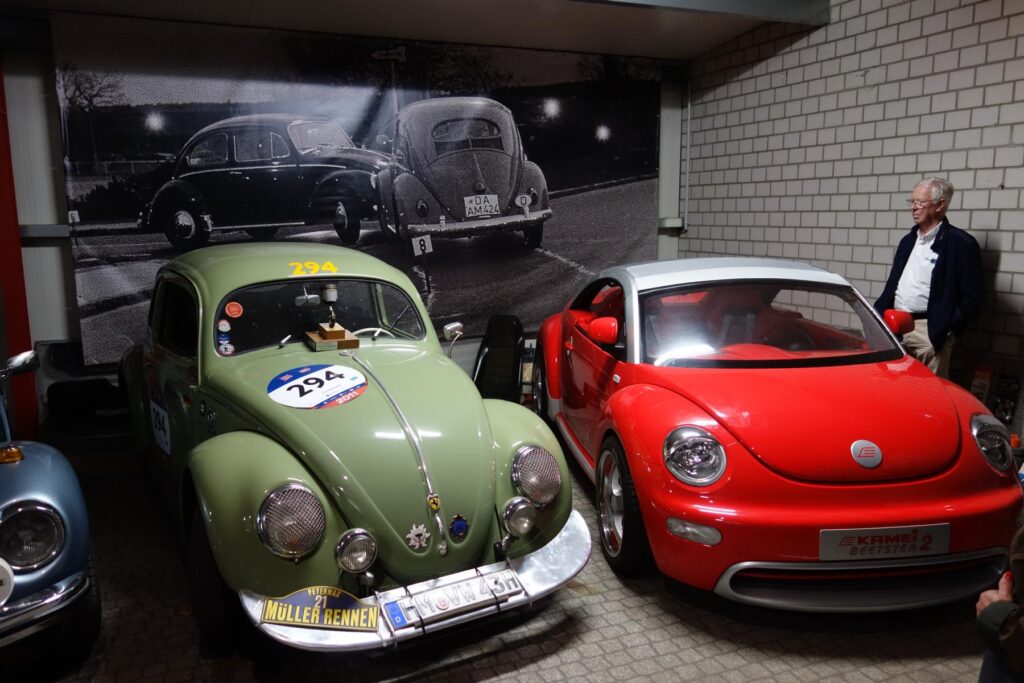 Aber dann… Die exklusive Führung in den „Heiligen Hallen“ durch den Chef persönlich lies uns nicht nur einmal staunen. Sowohl die Zusammenhänge der VW-Geschichte, als auch die Tatsache, solche Raritäten aufzuspüren, ihre Vita zu recherchieren und dann zu restaurieren, damit wir dann glänzende Vollendung bestaunen können, zollen größten Respekt. Ein Beispiel der Sammlung: einer der drei existierenden Prototypen des VW Käfer 38 – der damals von Ferdinand Porsche für die Nationalsozialisten entwickelte „KdF-Wagen“ aus dem Jahre 1938. Er war vor wenigen Jahren als „Schrott“ in Litauen aufgefunden worden, und die Grundmanns holten ihn, restaurierten ihn, und wir können dieses Prachtstück nun bewundern. Zur Geschichte gehört auch, dass damals aus dem Bau des begehrten Volkswagens nichts wurde. Man sollte jede Woche 5 Reichsmark ansparen, bis 995 Reichsmark zusammen waren, dann sollte man ein Auto bekommen. Spardosen und Klebeheftchen mit Marken sind in der Vitrine zu sehen. Doch gebaut wurde der Volkswagen nicht, denn der Krieg kam dazwischen, und auf der Basis des KdF-Wagens entstanden nun Kübel- und Schwimmwagen für die Wehrmacht. Auch sie sind in der Ausstellung zu sehen. Auch sehr selten: Ein rotes Postauto auf Kübelwagenbasis. In einer anderen Halle gab es seltene Polizeiautos, zum Beispiel ein viersitziges Polizei-Cabriolet von Hebmüller. Es gab einen für Rennen umgebauten Ovali Käfer, einen Formel V Rennwagen, ein kleines Flugzeug, ebenso einen kleinen Hubschrauber mit Käfermotor, mehrere Karman Ghia, auch als Cabriolet des Typs 34 („Bügelfalte“), welches von der Familie Karman gefahren wurde. Die VW Bullis der ersten Generation (T1) waren als Strahlenmessfahrzeug, als Verkaufswagen, als Sambabus, als Krankenwagen und als Camper zu bestaunen und … ein Bus, der in der DDR von einem Tüftler gebaut worden war. Auf dem Fahrgestell eines VW Kübel-Wagens hatte dieser 1951 eine Vollholzkarosserie mit neun Plätzen gebaut, und dieser „Wagen“ war zugelassen! Dann gab es noch eine ganz besondere Halle. Traugott Grundmann betreut den Nachlass des Karosseriebauers Friedrich Rometsch mit dessen Originalbüro, seinem Zeichenbrett und sieben handgefertigten Fahrzeugen. Dessen Kunden waren zum Beispiel Gregory Peck und Audrey Hepburn. In den 50er Jahren wurde Friedrich Rometsch auch dadurch bekannt, dass er zusammen mit Johannes Beeskow die Berliner Taxis (VW Käfer) um etwa zwanzig Zentimeter zu Viertürern verlängerte, in der Tür mit Aschenbecher – Luxus pur und jedes einzelne Fahrzeug eine Rarität, eine einzigartige Sammlung!
