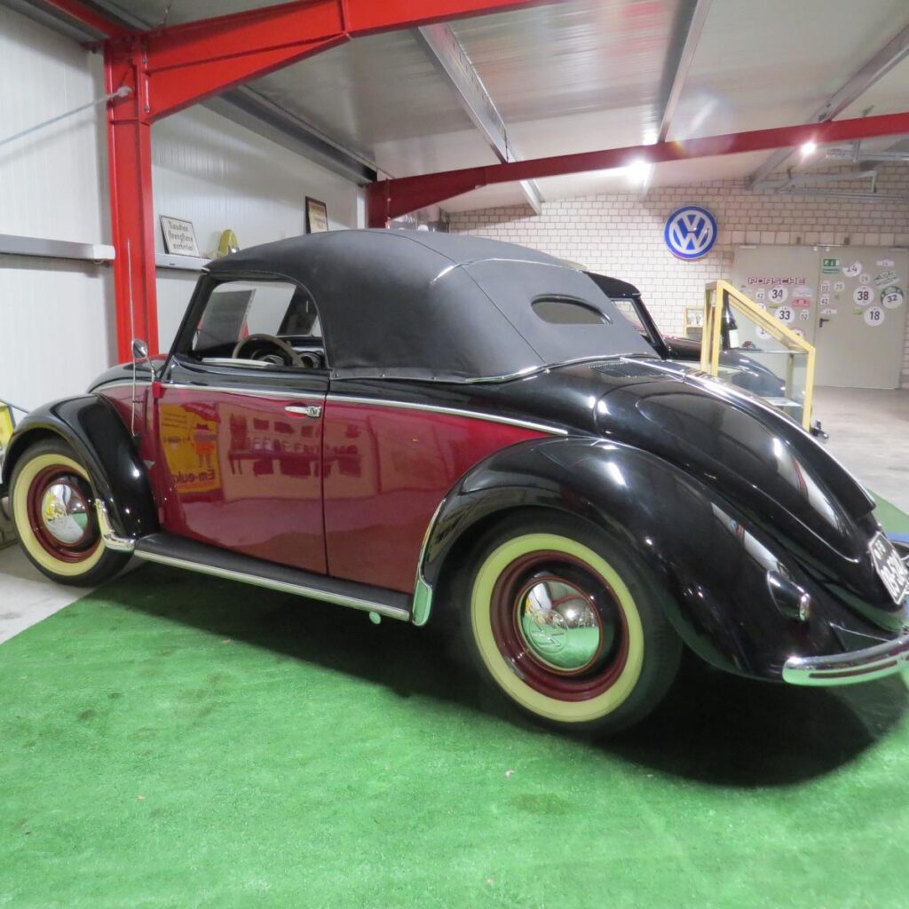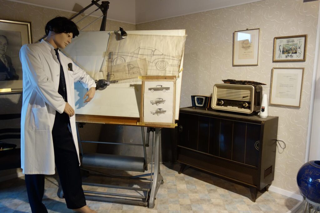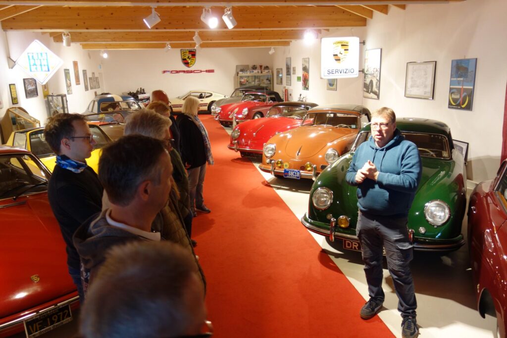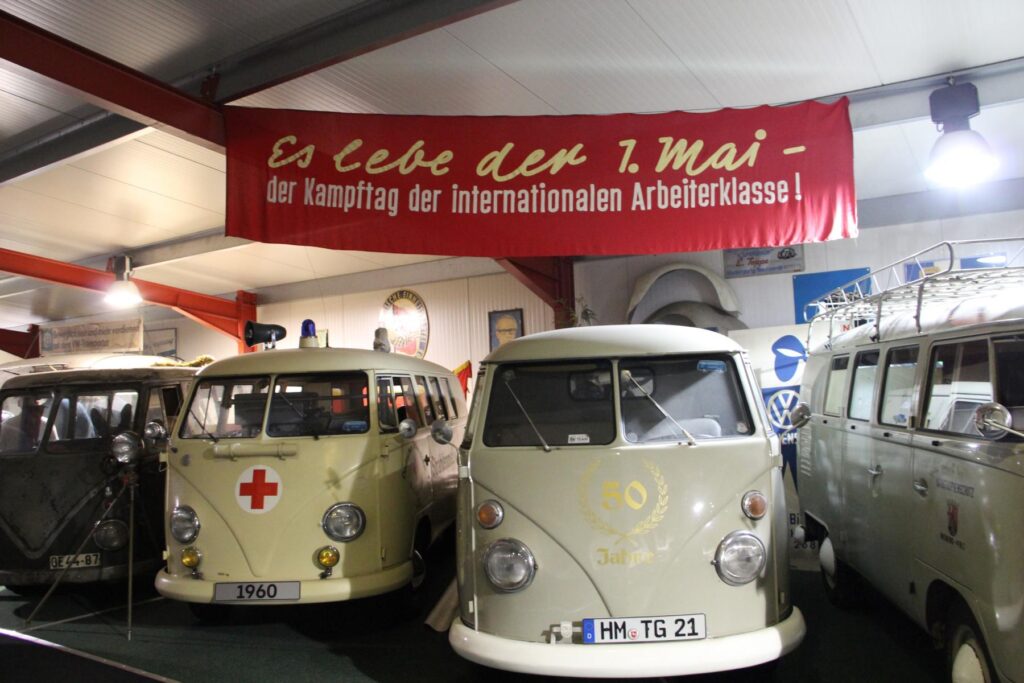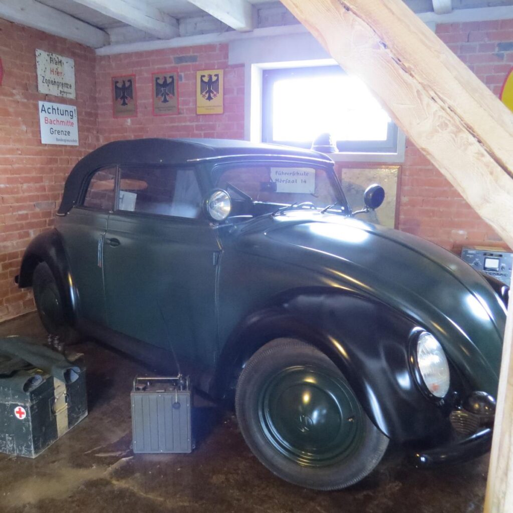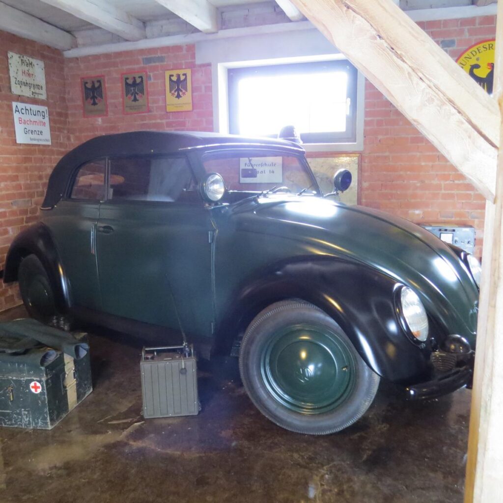 Aber dann… Die exklusive Führung in den „Heiligen Hallen“ durch den Chef persönlich lies uns nicht nur einmal staunen. Sowohl die Zusammenhänge der VW-Geschichte, als auch die Tatsache, solche Raritäten aufzuspüren, ihre Vita zu recherchieren und dann zu restaurieren, damit wir dann glänzende Vollendung bestaunen können, zollen größten Respekt. Ein Beispiel der Sammlung: einer der drei existierenden Prototypen des VW Käfer 38 – der damals von Ferdinand Porsche für die Nationalsozialisten entwickelte „KdF-Wagen“ aus dem Jahre 1938. Er war vor wenigen Jahren als „Schrott“ in Litauen aufgefunden worden, und die Grundmanns holten ihn, restaurierten ihn, und wir können dieses Prachtstück nun bewundern. Zur Geschichte gehört auch, dass damals aus dem Bau des begehrten Volkswagens nichts wurde. Man sollte jede Woche 5 Reichsmark ansparen, bis 995 Reichsmark zusammen waren, dann sollte man ein Auto bekommen. Spardosen und Klebeheftchen mit Marken sind in der Vitrine zu sehen. Doch gebaut wurde der Volkswagen nicht, denn der Krieg kam dazwischen, und auf der Basis des KdF-Wagens entstanden nun Kübel- und Schwimmwagen für die Wehrmacht. Auch sie sind in der Ausstellung zu sehen. Auch sehr selten: Ein rotes Postauto auf Kübelwagenbasis. In einer anderen Halle gab es seltene Polizeiautos, zum Beispiel ein viersitziges Polizei-Cabriolet von Hebmüller. Es gab einen für Rennen umgebauten Ovali Käfer, einen Formel V Rennwagen, ein kleines Flugzeug, ebenso einen kleinen Hubschrauber mit Käfermotor, mehrere Karman Ghia, auch als Cabriolet des Typs 34 („Bügelfalte“), welches von der Familie Karman gefahren wurde. Die VW Bullis der ersten Generation (T1) waren als Strahlenmessfahrzeug, als Verkaufswagen, als Sambabus, als Krankenwagen und als Camper zu bestaunen und … ein Bus, der in der DDR von einem Tüftler gebaut worden war. Auf dem Fahrgestell eines VW Kübel-Wagens hatte dieser 1951 eine Vollholzkarosserie mit neun Plätzen gebaut, und dieser „Wagen“ war zugelassen! Dann gab es noch eine ganz besondere Halle. Traugott Grundmann betreut den Nachlass des Karosseriebauers Friedrich Rometsch mit dessen Originalbüro, seinem Zeichenbrett und sieben handgefertigten Fahrzeugen. Dessen Kunden waren zum Beispiel Gregory Peck und Audrey Hepburn. In den 50er Jahren wurde Friedrich Rometsch auch dadurch bekannt, dass er zusammen mit Johannes Beeskow die Berliner Taxis (VW Käfer) um etwa zwanzig Zentimeter zu Viertürern verlängerte, in der Tür mit Aschenbecher – Luxus pur und jedes einzelne Fahrzeug eine Rarität, eine einzigartige Sammlung!