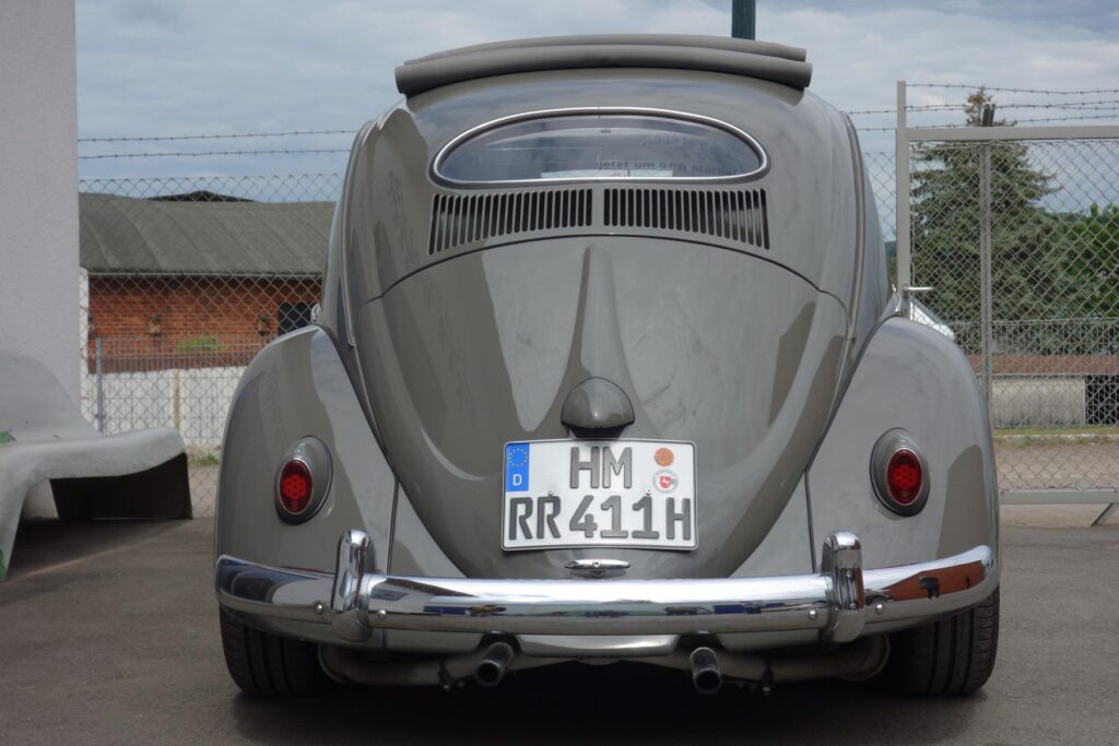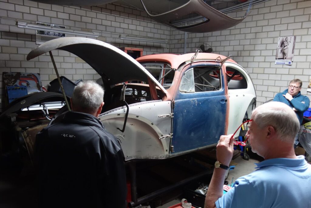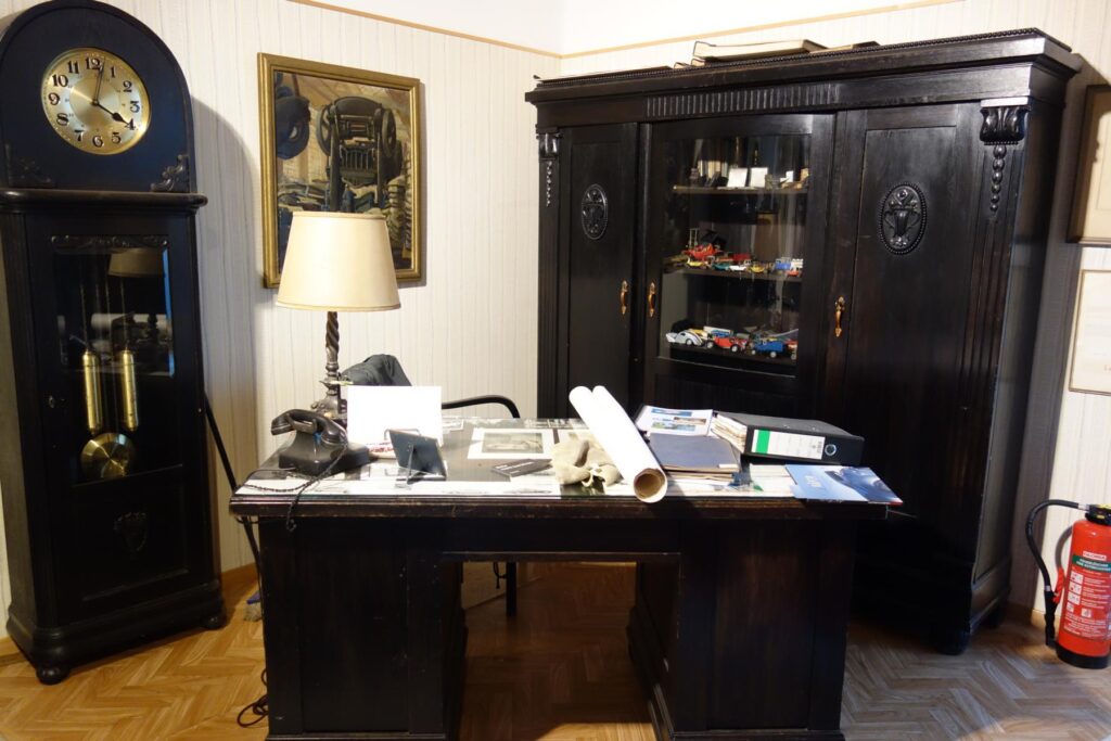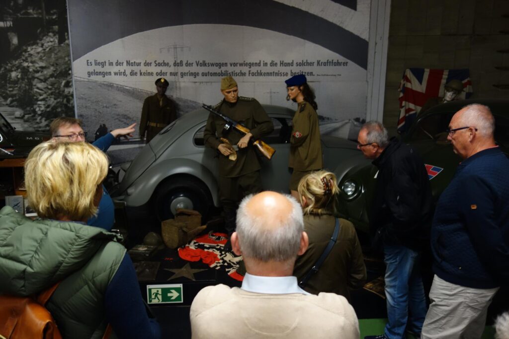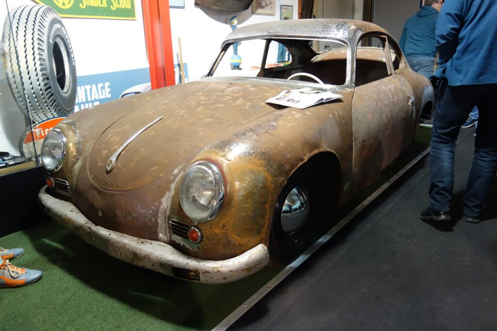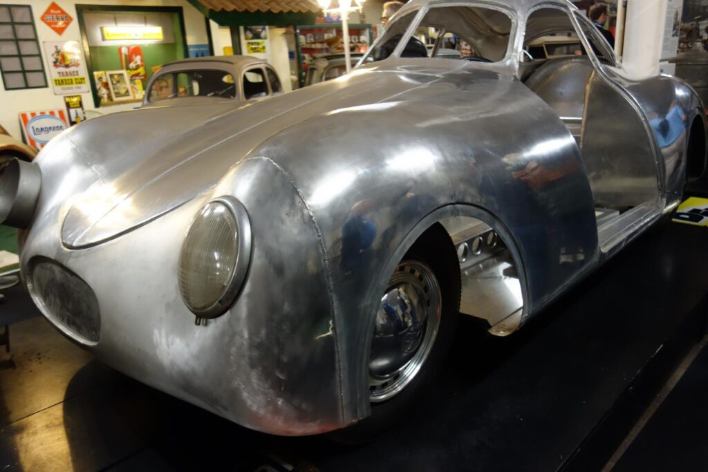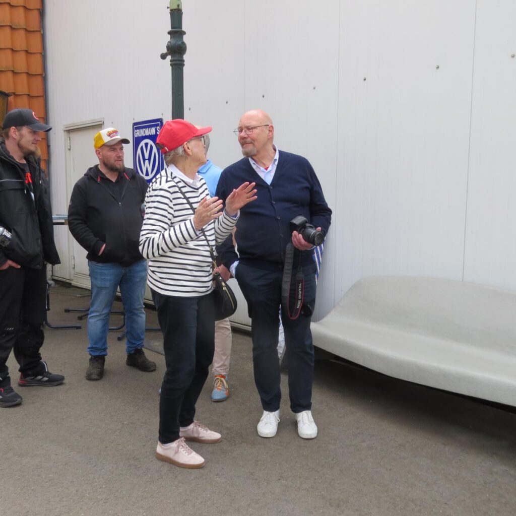 Aber dann… Die exklusive Führung in den „Heiligen Hallen“ durch den Chef persönlich lies uns nicht nur einmal staunen. Sowohl die Zusammenhänge der VW-Geschichte, als auch die Tatsache, solche Raritäten aufzuspüren, ihre Vita zu recherchieren und dann zu restaurieren, damit wir dann glänzende Vollendung bestaunen können, zollen größten Respekt. Ein Beispiel der Sammlung: einer der drei existierenden Prototypen des VW Käfer 38 – der damals von Ferdinand Porsche für die Nationalsozialisten entwickelte „KdF-Wagen“ aus dem Jahre 1938. Er war vor wenigen Jahren als „Schrott“ in Litauen aufgefunden worden, und die Grundmanns holten ihn, restaurierten ihn, und wir können dieses Prachtstück nun bewundern. Zur Geschichte gehört auch, dass damals aus dem Bau des begehrten Volkswagens nichts wurde. Man sollte jede Woche 5 Reichsmark ansparen, bis 995 Reichsmark zusammen waren, dann sollte man ein Auto bekommen. Spardosen und Klebeheftchen mit Marken sind in der Vitrine zu sehen. Doch gebaut wurde der Volkswagen nicht, denn der Krieg kam dazwischen, und auf der Basis des KdF-Wagens entstanden nun Kübel- und Schwimmwagen für die Wehrmacht. Auch sie sind in der Ausstellung zu sehen. Auch sehr selten: Ein rotes Postauto auf Kübelwagenbasis. In einer anderen Halle gab es seltene Polizeiautos, zum Beispiel ein viersitziges Polizei-Cabriolet von Hebmüller. Es gab einen für Rennen umgebauten Ovali Käfer, einen Formel V Rennwagen, ein kleines Flugzeug, ebenso einen kleinen Hubschrauber mit Käfermotor, mehrere Karman Ghia, auch als Cabriolet des Typs 34 („Bügelfalte“), welches von der Familie Karman gefahren wurde. Die VW Bullis der ersten Generation (T1) waren als Strahlenmessfahrzeug, als Verkaufswagen, als Sambabus, als Krankenwagen und als Camper zu bestaunen und … ein Bus, der in der DDR von einem Tüftler gebaut worden war. Auf dem Fahrgestell eines VW Kübel-Wagens hatte dieser 1951 eine Vollholzkarosserie mit neun Plätzen gebaut, und dieser „Wagen“ war zugelassen! Dann gab es noch eine ganz besondere Halle. Traugott Grundmann betreut den Nachlass des Karosseriebauers Friedrich Rometsch mit dessen Originalbüro, seinem Zeichenbrett und sieben handgefertigten Fahrzeugen. Dessen Kunden waren zum Beispiel Gregory Peck und Audrey Hepburn. In den 50er Jahren wurde Friedrich Rometsch auch dadurch bekannt, dass er zusammen mit Johannes Beeskow die Berliner Taxis (VW Käfer) um etwa zwanzig Zentimeter zu Viertürern verlängerte, in der Tür mit Aschenbecher – Luxus pur und jedes einzelne Fahrzeug eine Rarität, eine einzigartige Sammlung!