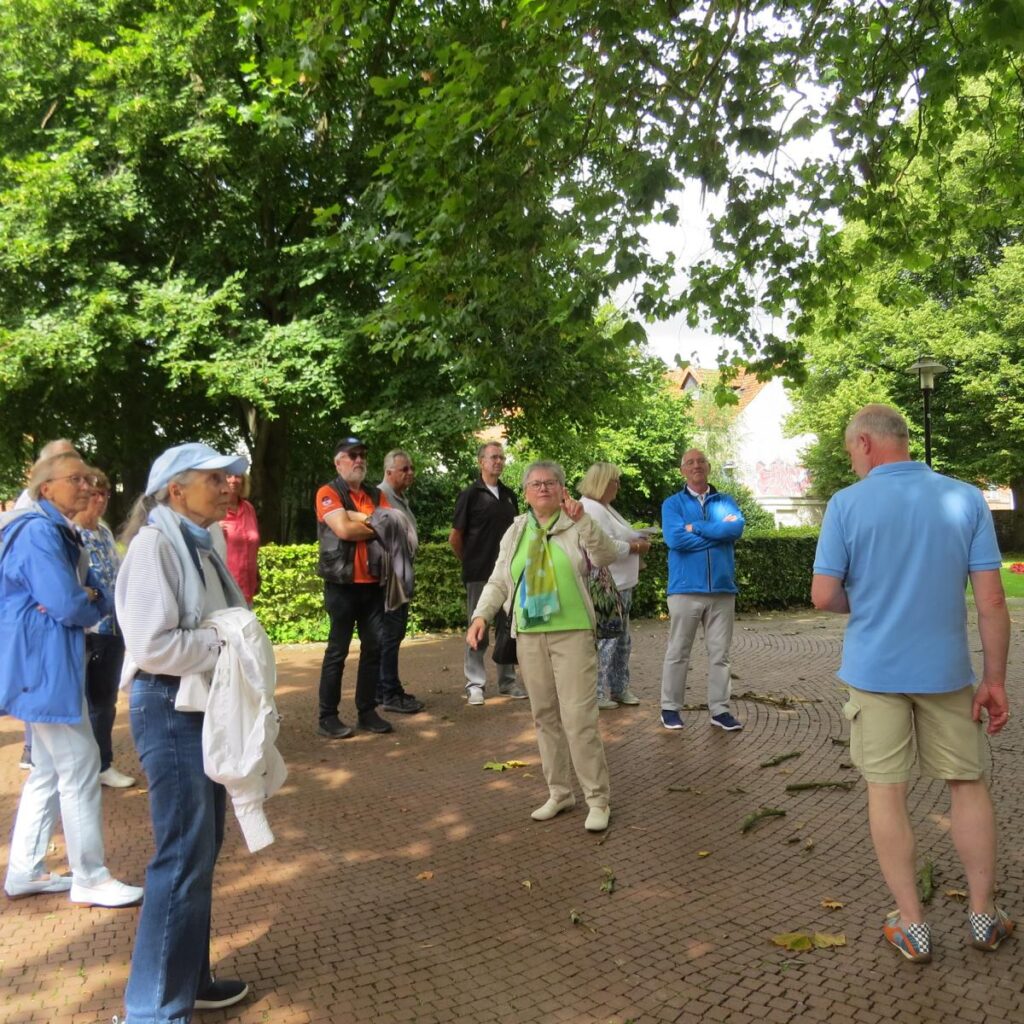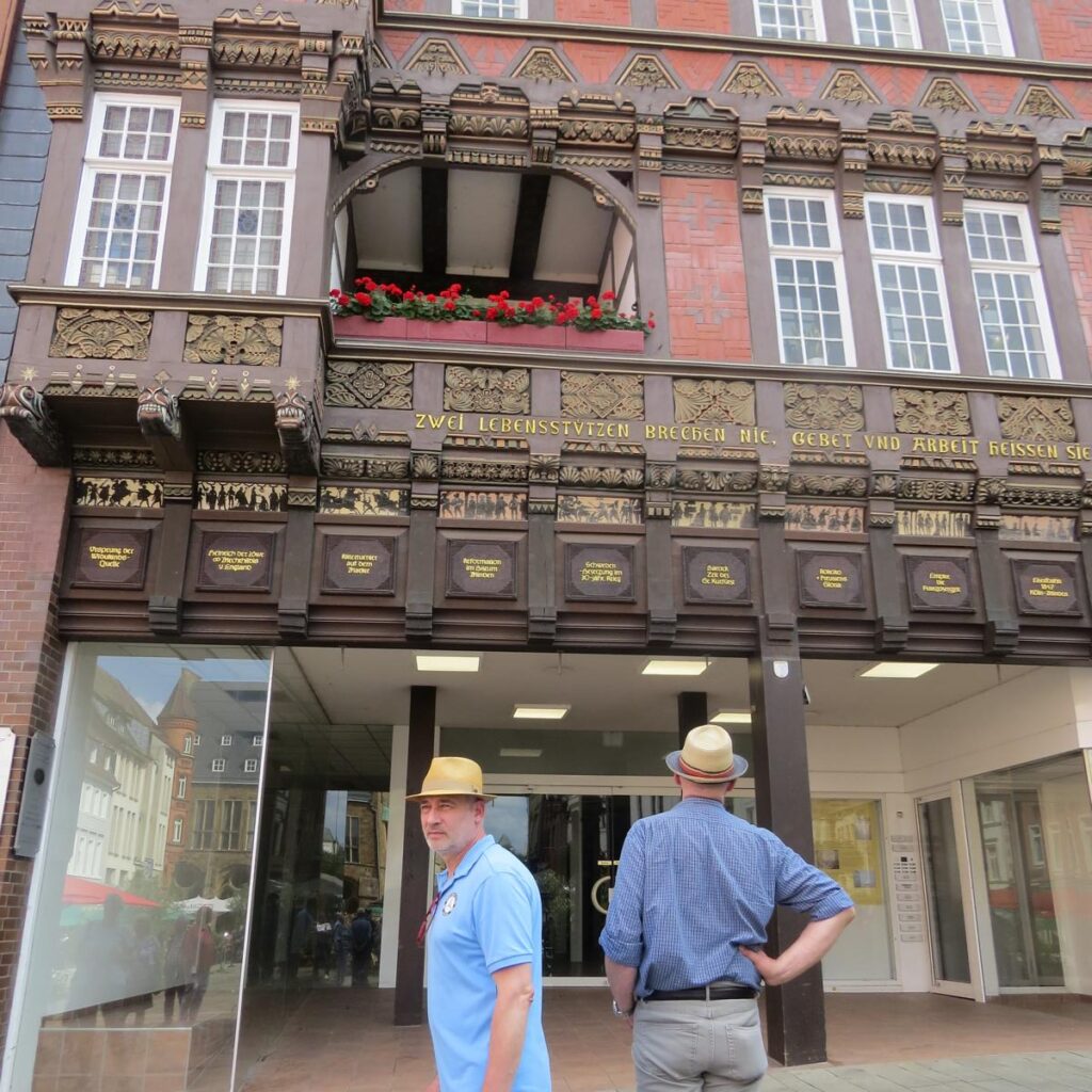 Am Sonntag war ebenfalls eine Führung durch die historische Stadt der Weserrenaissance angesetzt. Schon der Marktplatz bot prachtvolle Häuser mit zeitgenössischen Symbolen. Um 1600 wurde auch ein Sandstein-Giebelhaus mit Braurecht errichtet, wo ab 1850 der Sitz der Brauergilde war und bis 1973 Städtisches Bier ausgeschenkt wurde. Auch Wilhelm Busch besuchte diesen Ausschank häufig. Bei dem Rundgang statteten wir dem Freihof von Oheimb einen Besuch ab, in dem eine Baumkuriosität zu bestaunen war: eine riesige Buche mit gleichzeitig feingliedrigen Ahornblättern.
