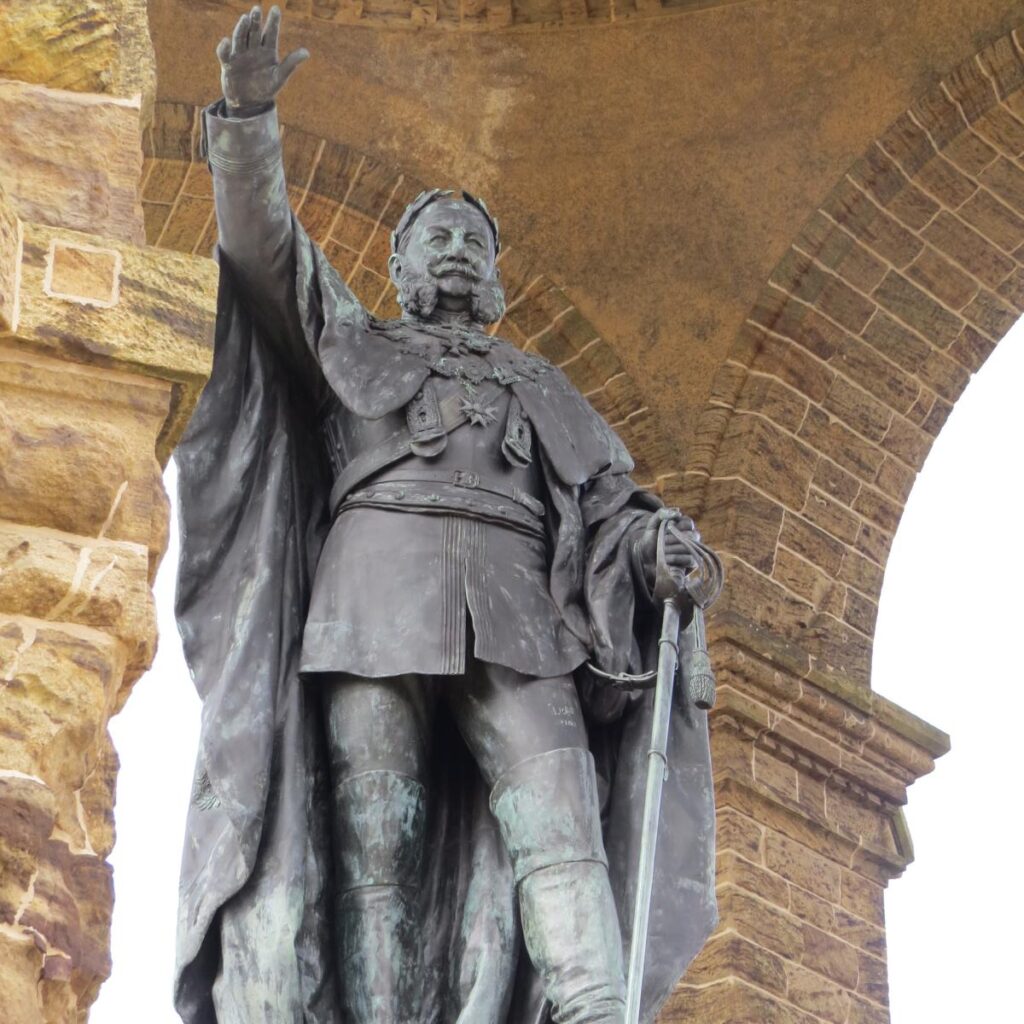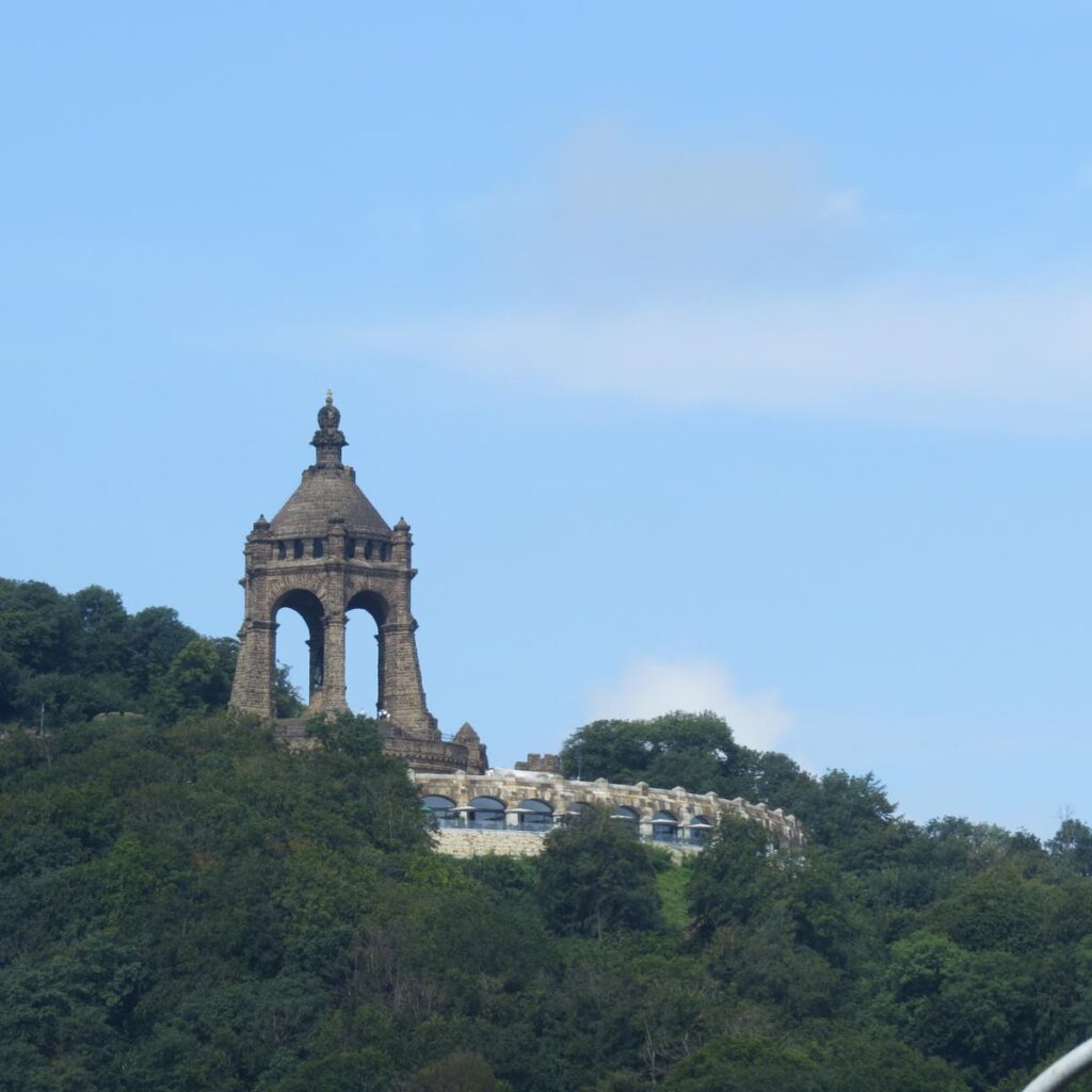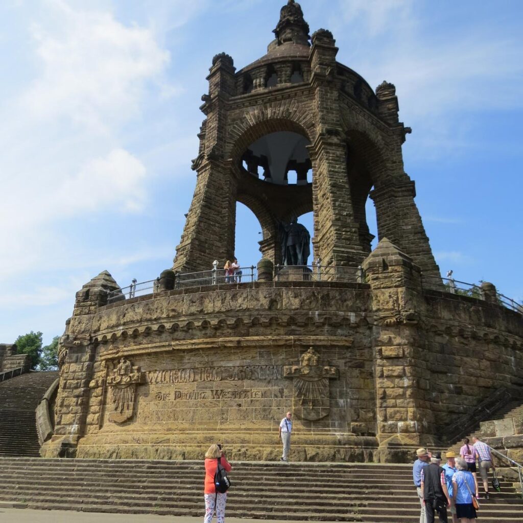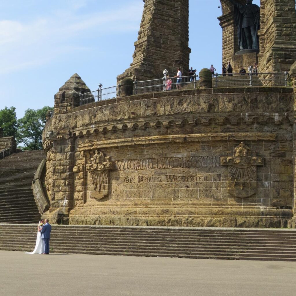 Das Kaiser-Wilhelm-Denkmal ist ein gewaltiger Koloss aus Portasandstein, der von der Autobahn und schon von weither gesehen wird. Die Gesamthöhe beträgt 88 Meter, das Standbild ist dagegen nur 7 Meter hoch. Es wurde auf Beschluss des Provinziallandtages der ehemaligen Provinz Westfalen in den Jahren 1892 bis 1896 nach Plänen des Berliner Architekten Bruno Schmitz errichtet. Das Standbild des Kaisers gestaltete der aus Herzebrock/Westfalen stammende und in Wien tätige Bildhauer Caspar von Zumbusch. All diese Information und noch viel mehr erfuhren wir durch eine sachkundige Führung. Auch als Ort für Hochzeits-Fotoshootings erlebten wir das Denkmal. Wir sichteten drei Brautpaare.