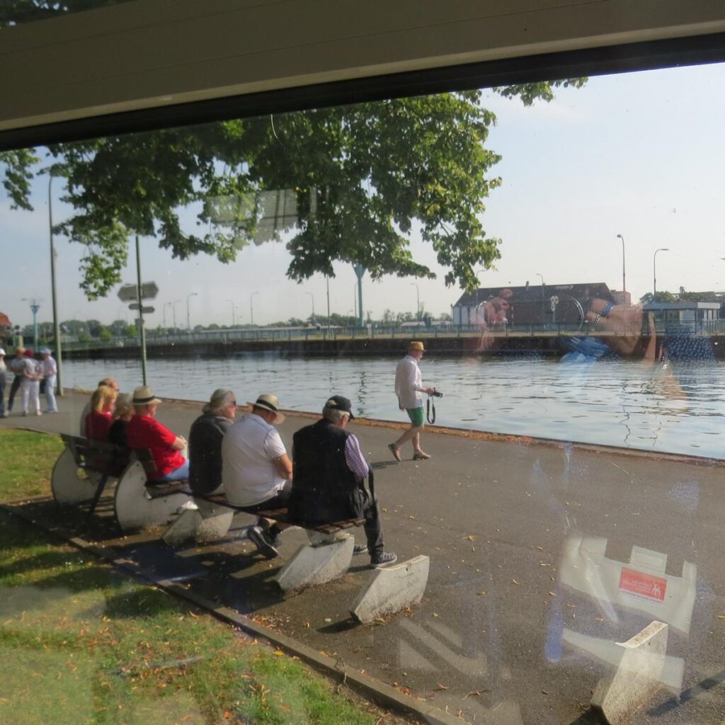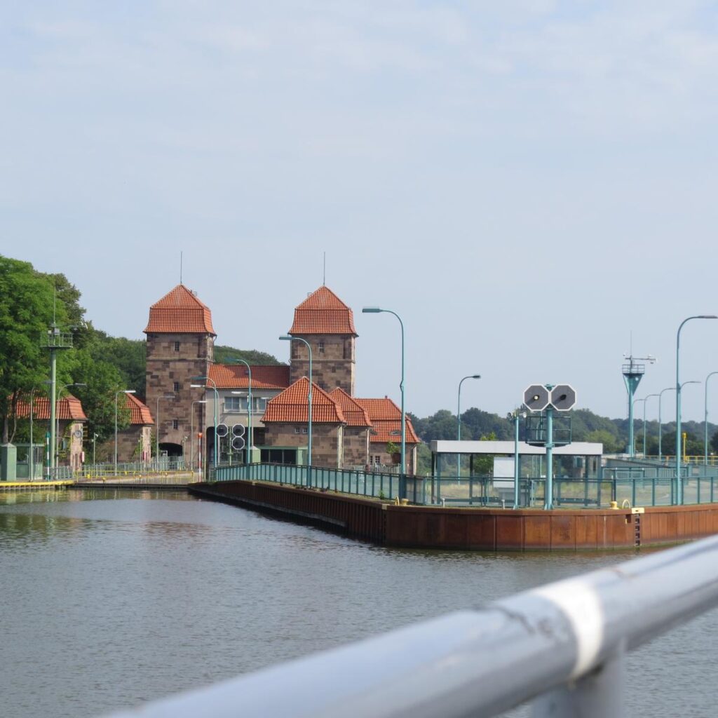 Am Samstagmorgen schlängelten wir uns nach Minden zur Schachtschleuse. Dort sahen wir das größte und einmalige Doppelwasserstraßenkreuz der Welt. 1906 hatte der Bau des Rhein-Weser-Kanals begonnen, der von West nach Ost quer durch Deutschland führen sollte. Dabei musste er die Weser kreuzen, und so entstand eine 341 Meter lange Brücke, eines der größten Wasserstraßenkreuze. Und um vom Kanal in die Weser zu gelangen, wurde 1914 die Schachtschleuse errichtet, die 13 Meter Höhenunterschied ausgleicht.