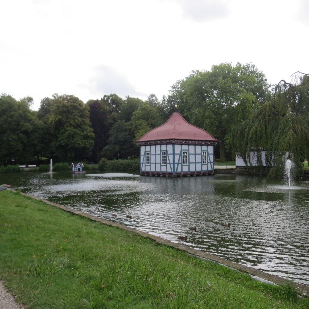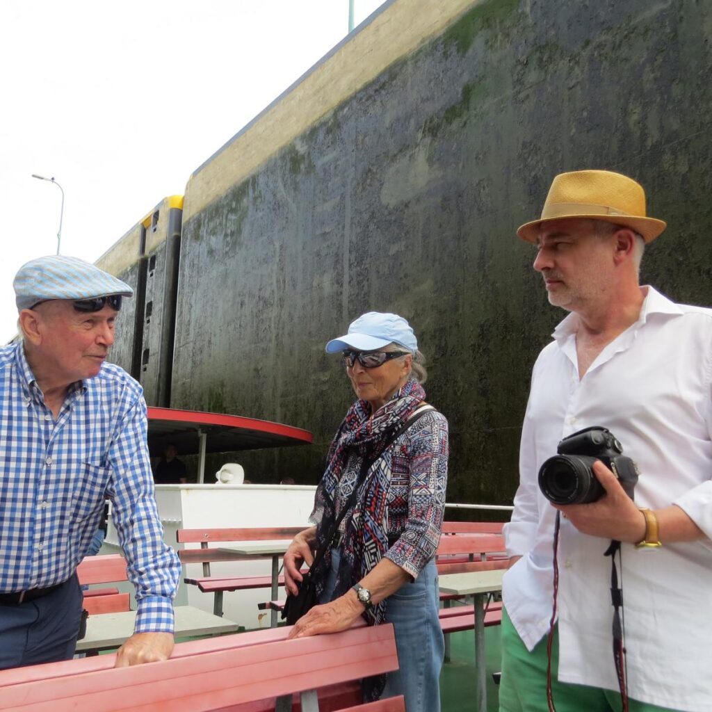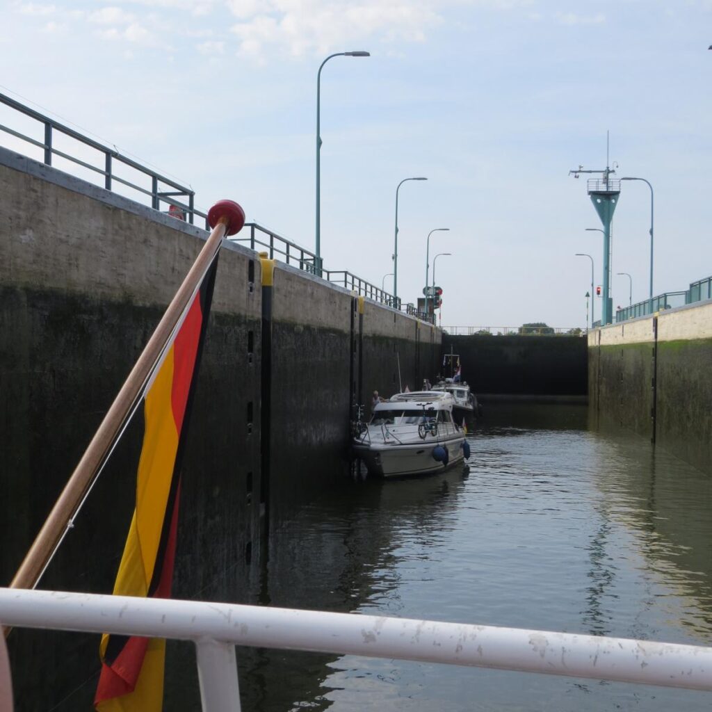 Eine Kanal-Weser-Rundfahrt mit Schleusung war für uns gebucht. Obwohl wir gerade erst vom Frühstück kamen, wurden wir auf dem Schiff mit den Worten begrüßt: „Um 11 Uhr stehen Kaffee und Kuchen für Sie bereit!“ Puh… nun ja, erst einmal schipperten wir in die Schleuse und mit uns noch zwei kleine Motorboote. Das Wasser wurde abgelassen, und langsam senkten wir uns ab auf den Wasserstand der Weser, die wir dann bis Porta Westfalica befuhren. Aus dieser Perspektive konnten wir das Kaiser-Wilhelm-Denkmal betrachten. Dann wendeten wir wieder in der Schleuse, um nun von unten wieder nach oben gehoben zu werden. Beeindruckend war das Gefühl, unter dem Mittellandkanal durchgefahren und dann auf ihm hin und her gefahren zu sein, besonders mit der Rückhebung in der Schleuse.
