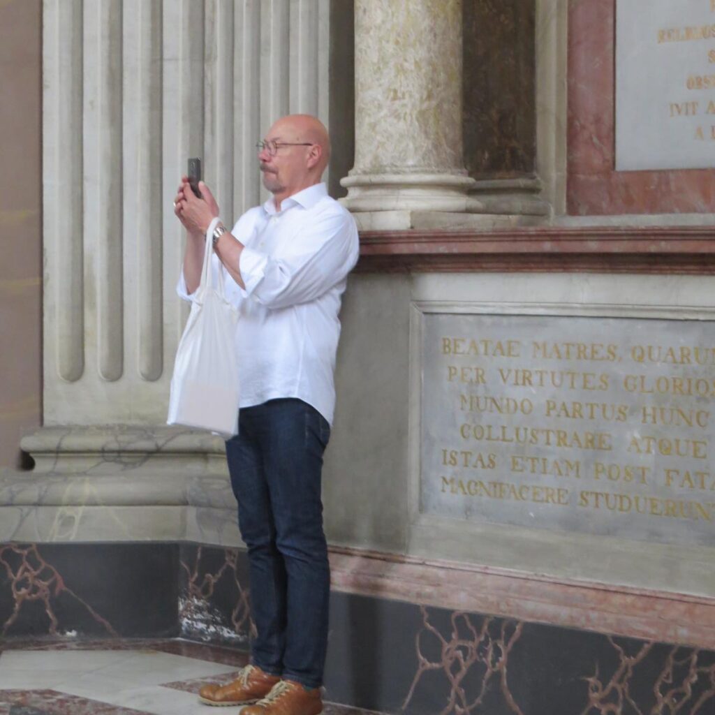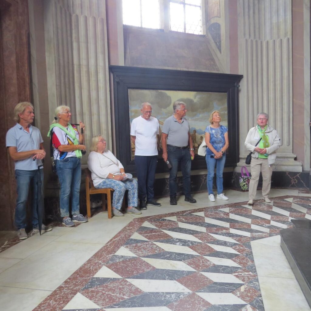 Vorbei an der Lateinschule besuchten wir zum Schluss die Martini-Kirche mit dem angegliederten Mausoleum. Es wurde von Fürst Ernst von Holstein-Schaumburg geplant, jedoch hat dieser es nie gesehen. Seine Frau Hedwig von Hessen-Kassel hat es durch Giovanni Maria Nosseni und Anton Boten vollenden lassen. Die dreizehn Bronzeplastiken und Reliefs stammen von dem bedeutenden Niederländer Adriaen de Vries, die einzigen, die bis heute im ursprünglichen Kontext zu sehen sind. Bau und Ausstattung sind originalgetreu restauriert und zeigen ein authentisches Bild vom Stilgefühl und der Weltsicht eines regierenden Fürsten zwischen Reformation und Dreißigjährigem Krieg im protestantischen Norddeutschland. Mich haben auch die Marmorsäulen beeindruckt mit ihren unterschiedlichen Farben und Maserungen.